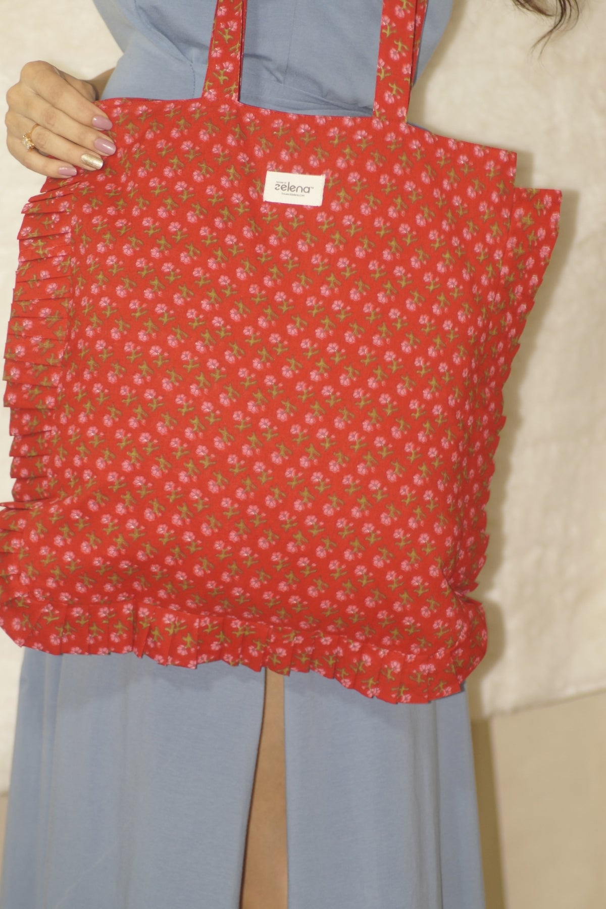 Handcrafted 100% Cotton Tote Bag with Ruffled Edges - Red