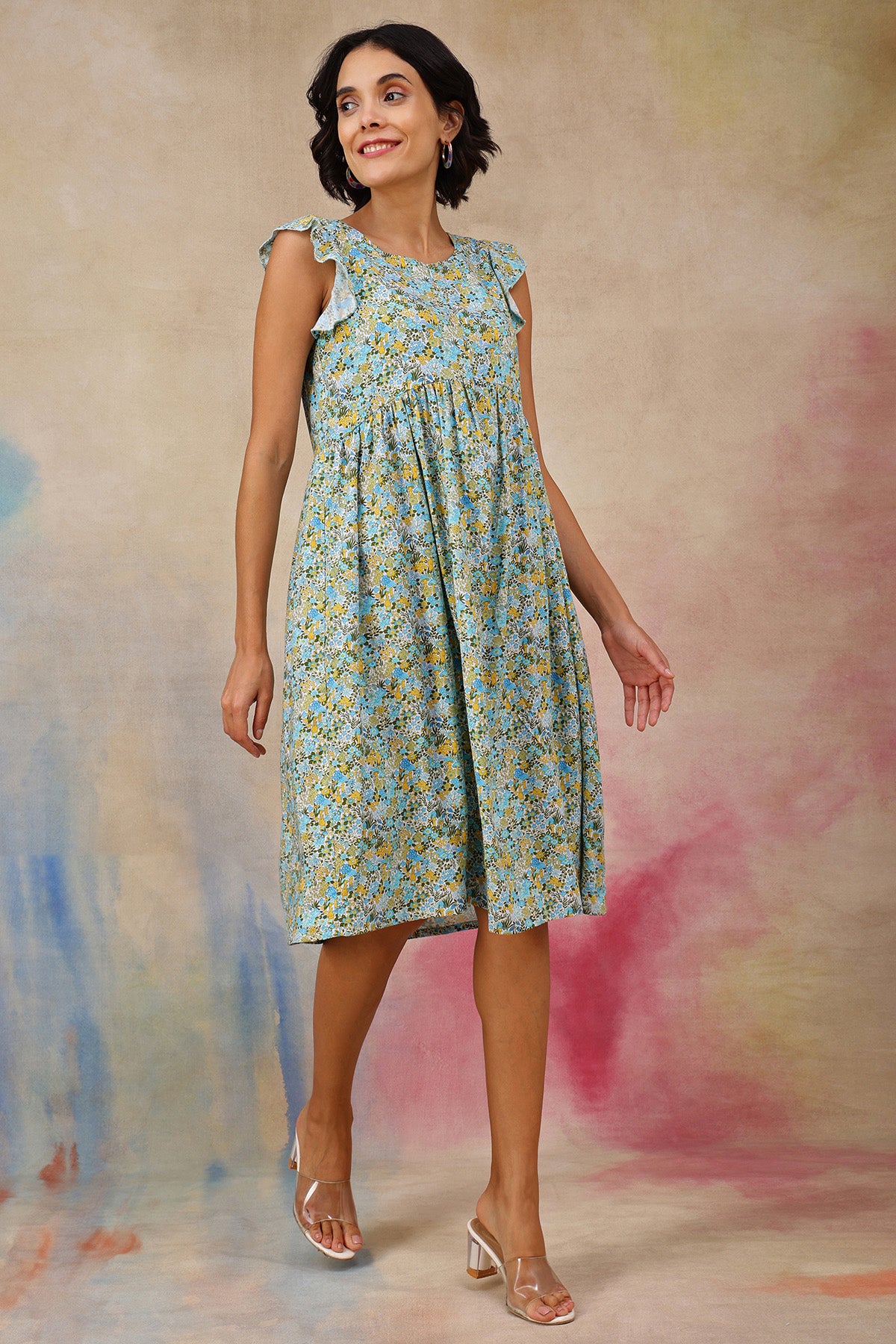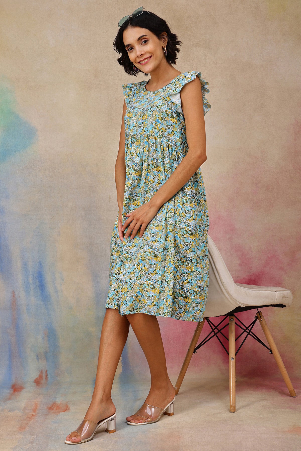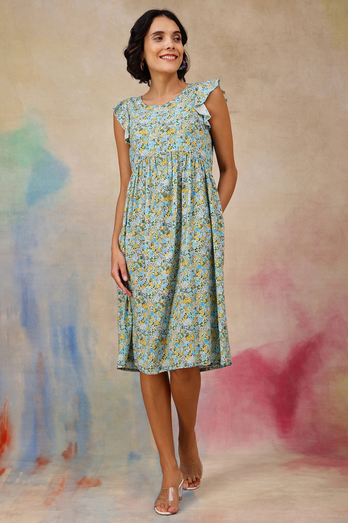 With its structured bodice, delicate ruffles at sleeves , and an effortlessly draped skirt that sways with every step. The self print yoke with light gathers at bust and tie at back adds a hint of shape while keeping things relaxed and adjustable. Soft flowy easy fit dress with zip at center for easy feeding access makes you connect with your little one . And surprise !!!!!!pockets …