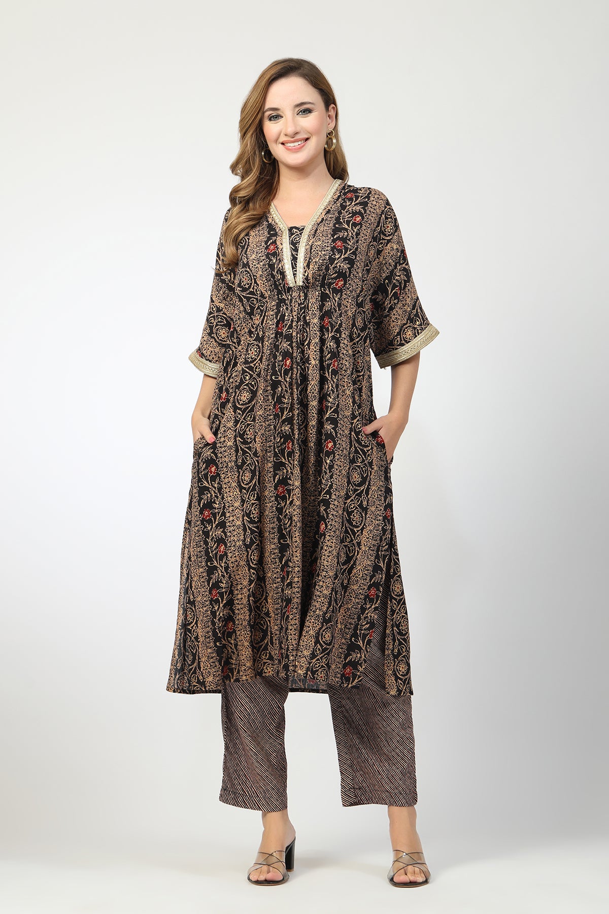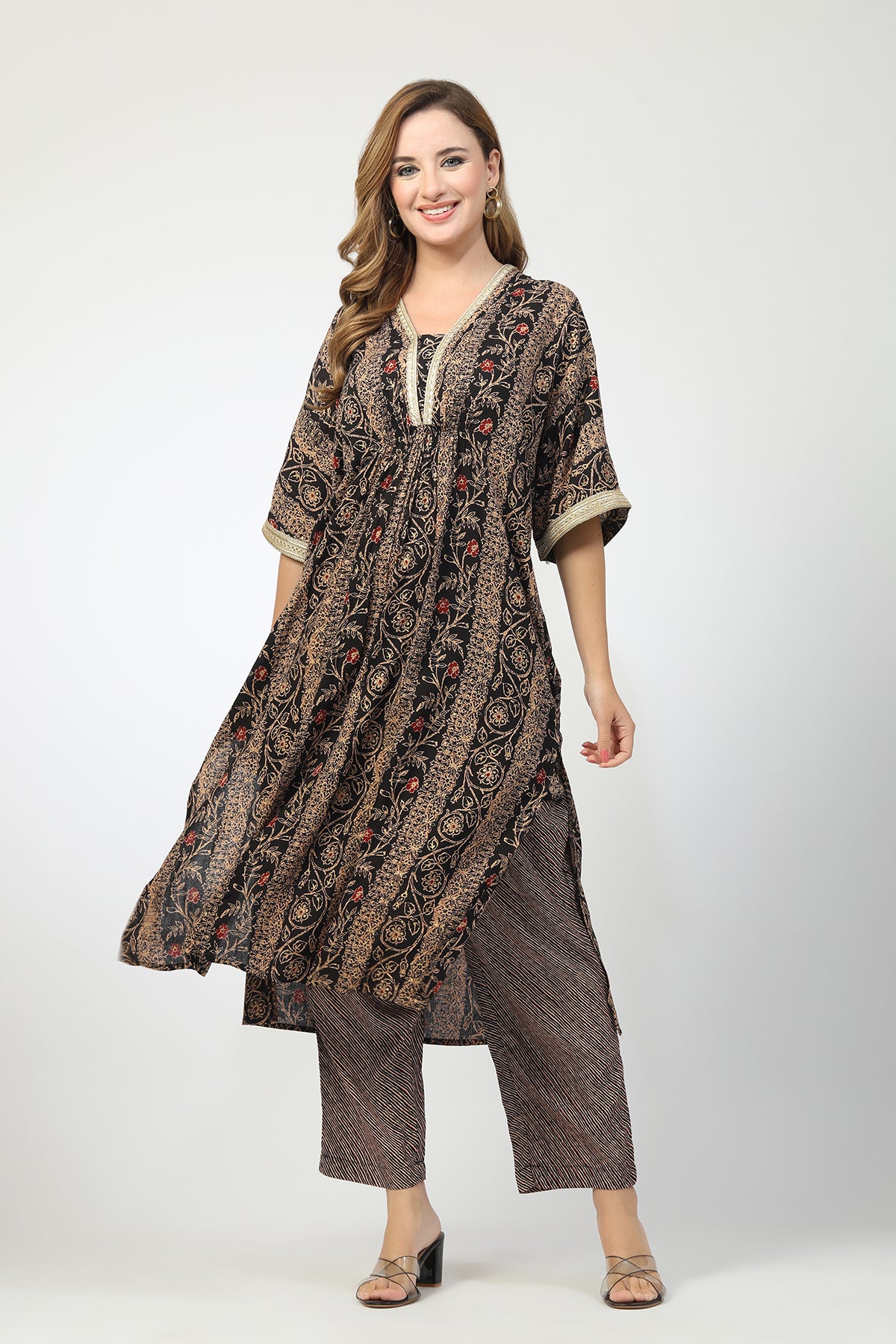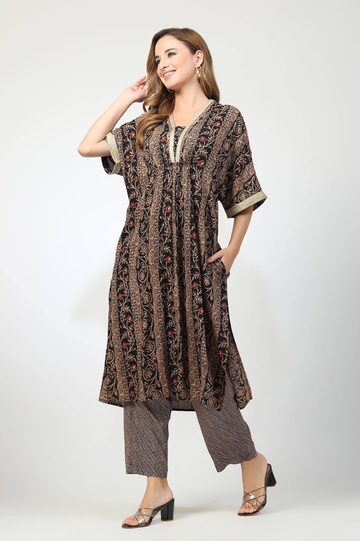 The Zelena Maternity Button Closure Kurta Set is designed to bring vibrant festive charm with maternity-friendly comfort. Featuring a flattering A-line silhouette, elegant kimono-style sleeves, and a beautiful floral print, this knee-length kurta dress is perfect for pregnancy and nursing. Crafted in soft breathable rayon with button closure access, it’s a stylish essential that keeps you comfortable, confident, and effortlessly beautiful.