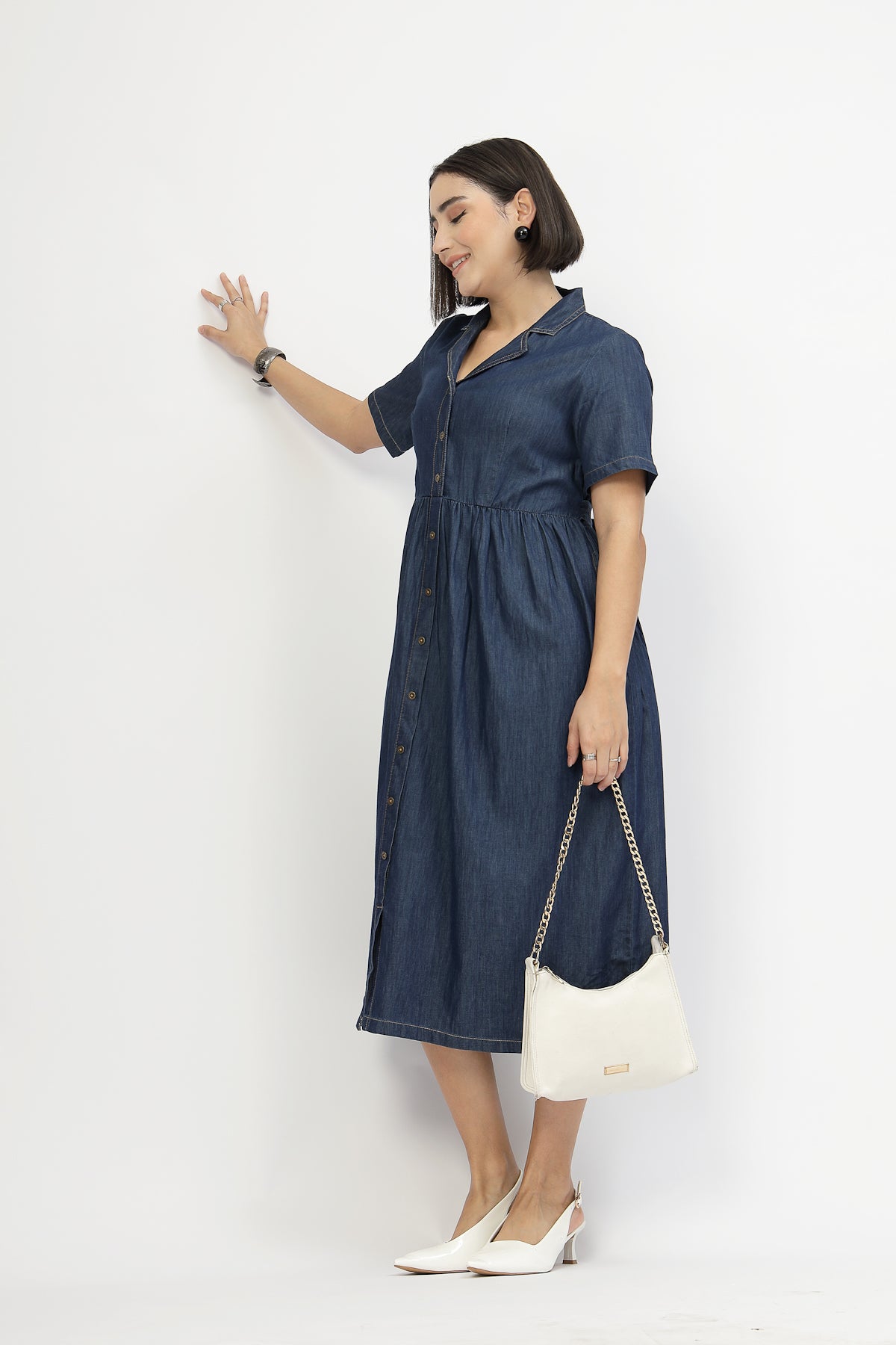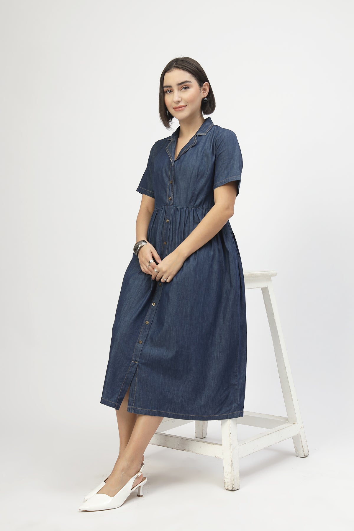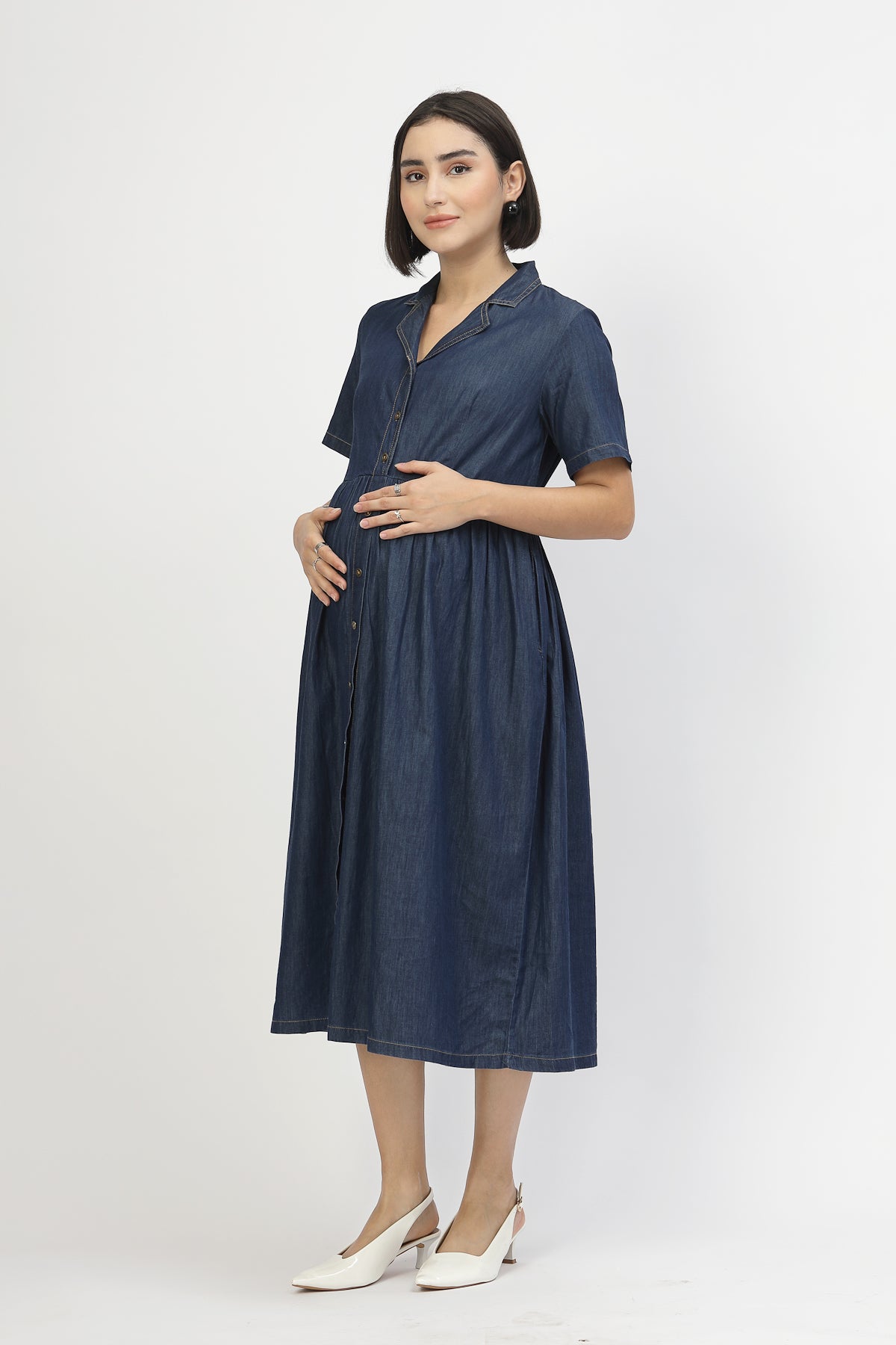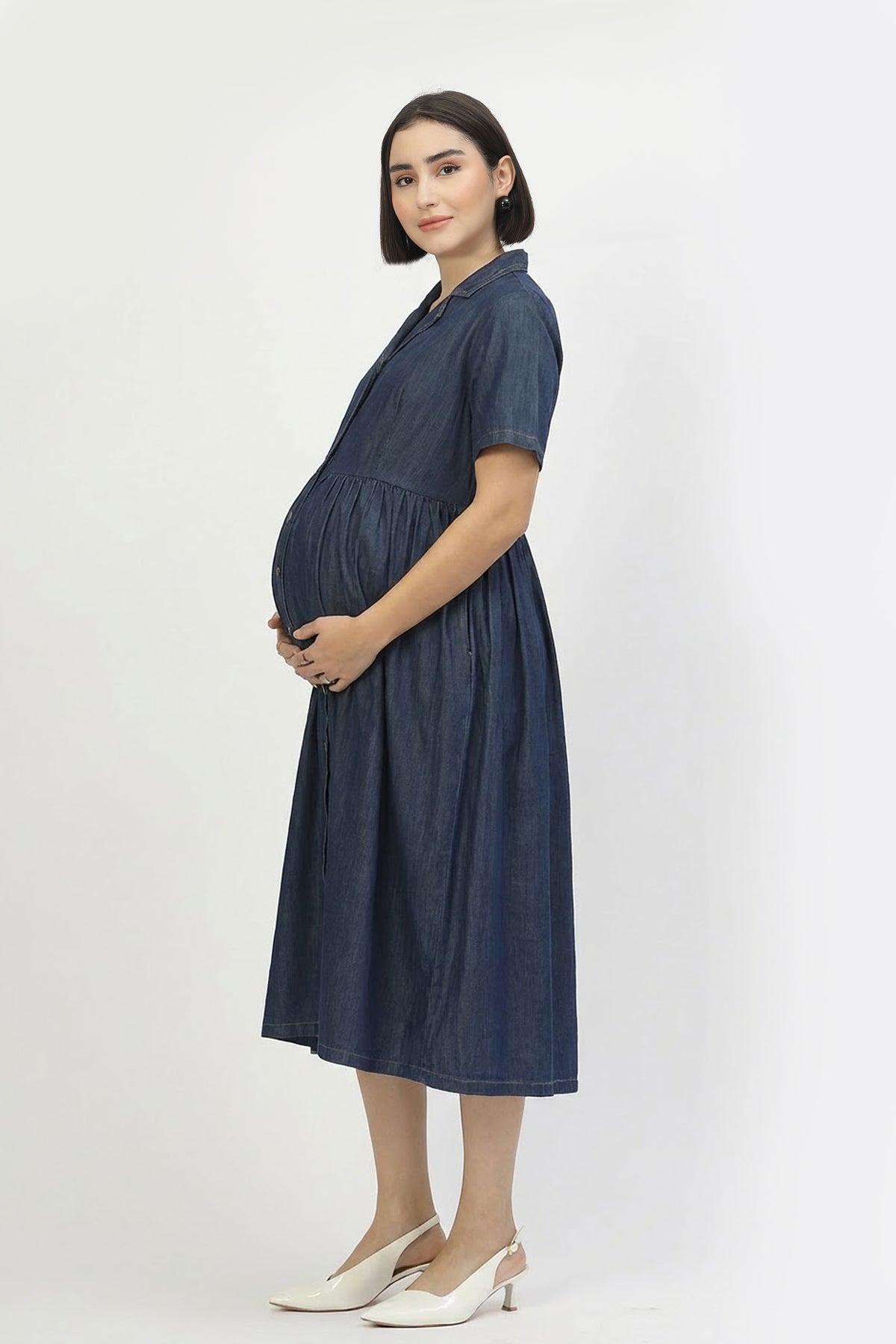 The Zelena Denim Zipless Feeding Lapel Dress in Denim Blue is a casual essential designed for pregnancy and postpartum ease. Crafted from 100% cotton, this knee-length dress blends breathable comfort with a structured denim-inspired look. Featuring a button opening for feeding access and practical pockets, it delivers effortless style with everyday functionality.