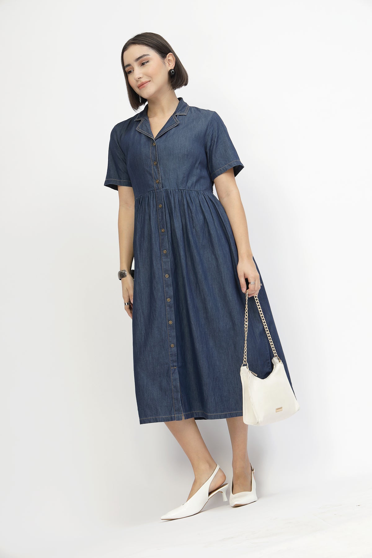 Styled in a classic denim blue tone with a lapel neckline, giving you a polished yet relaxed everyday look.