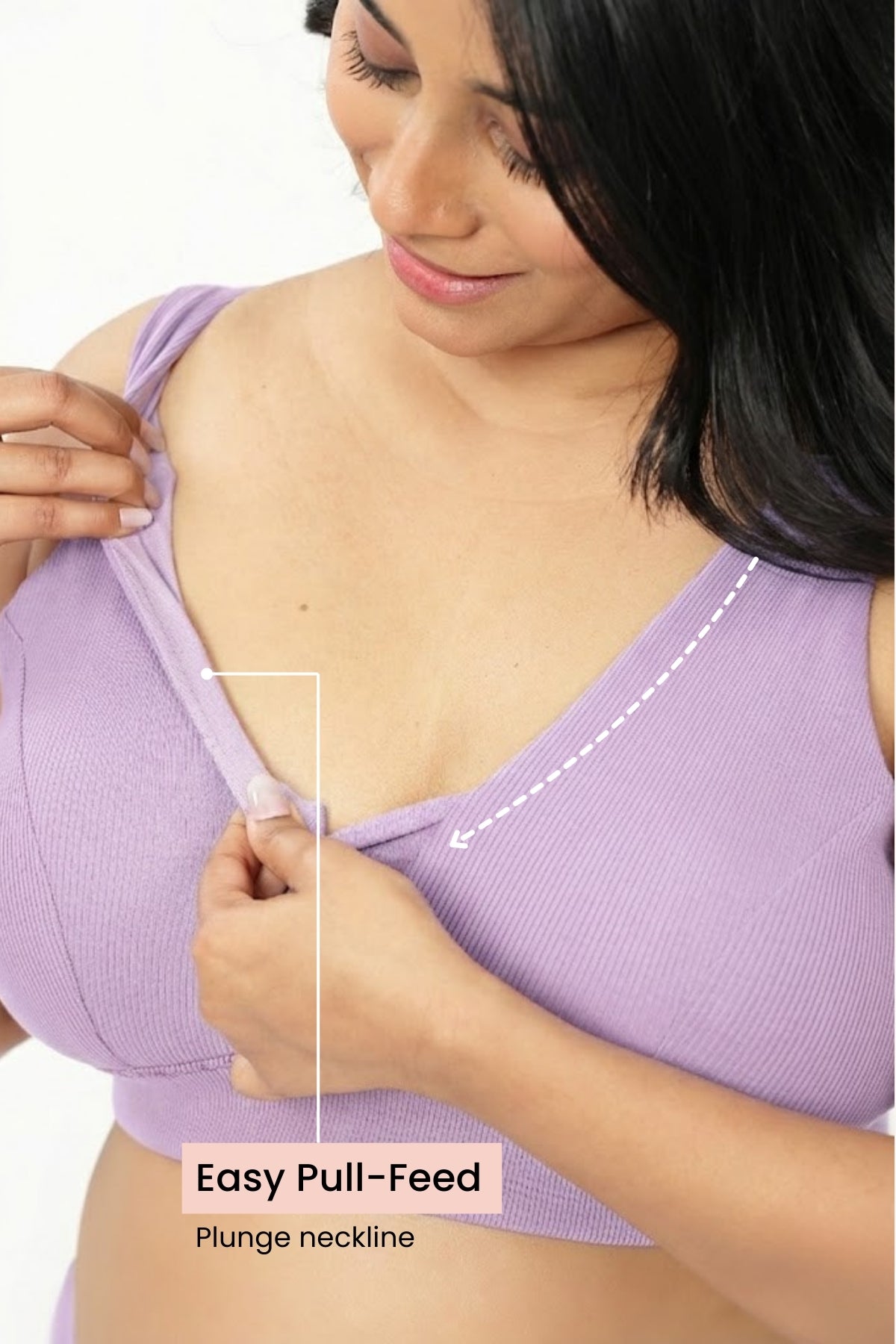 Soft stretch cups can be easily pulled aside for quick, discreet feeding—no clips, hooks, or hardware to manage.