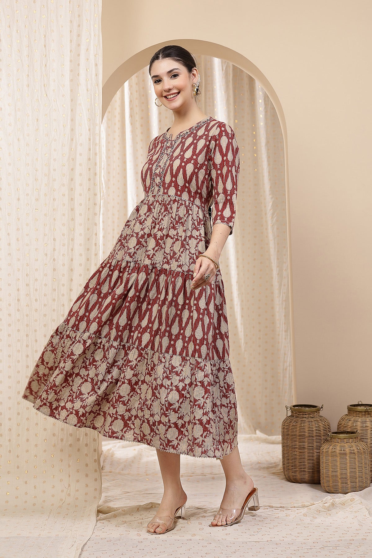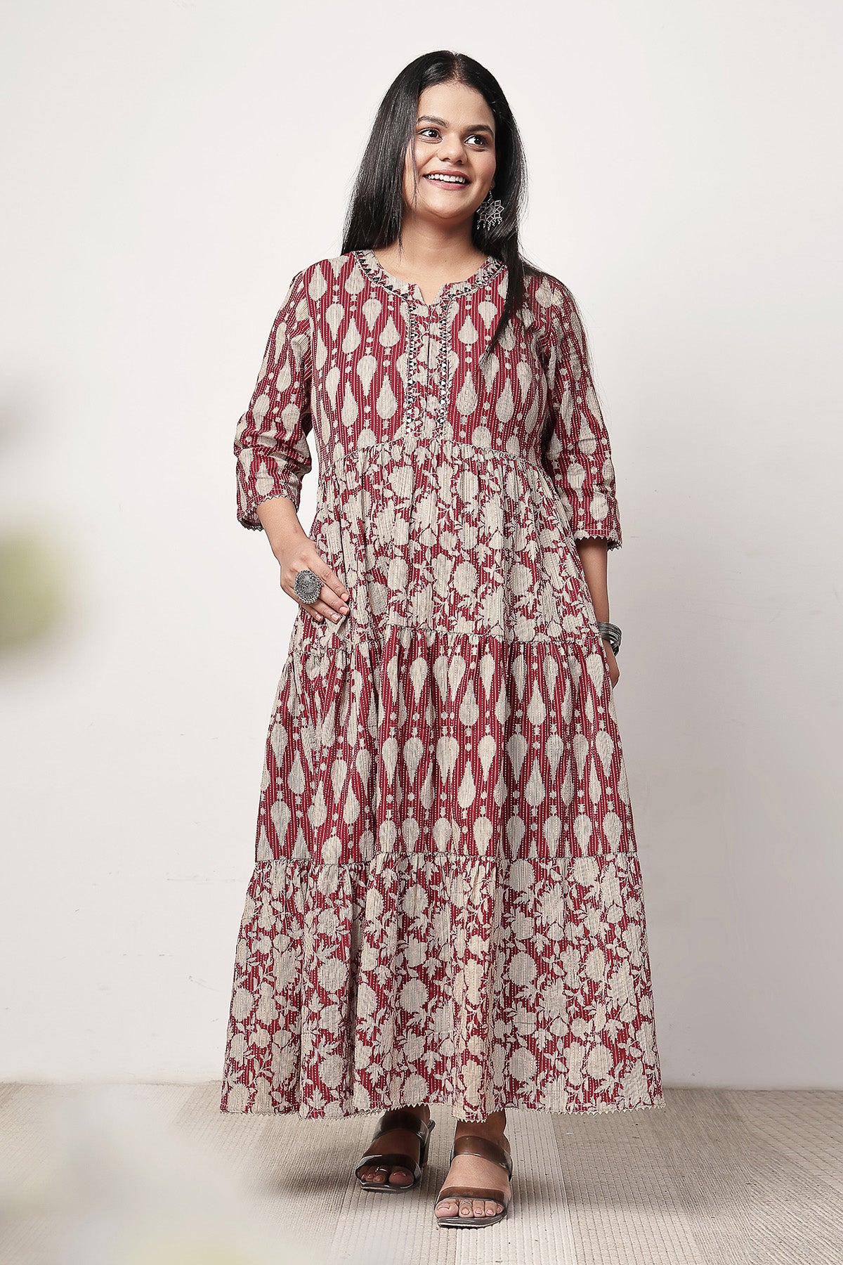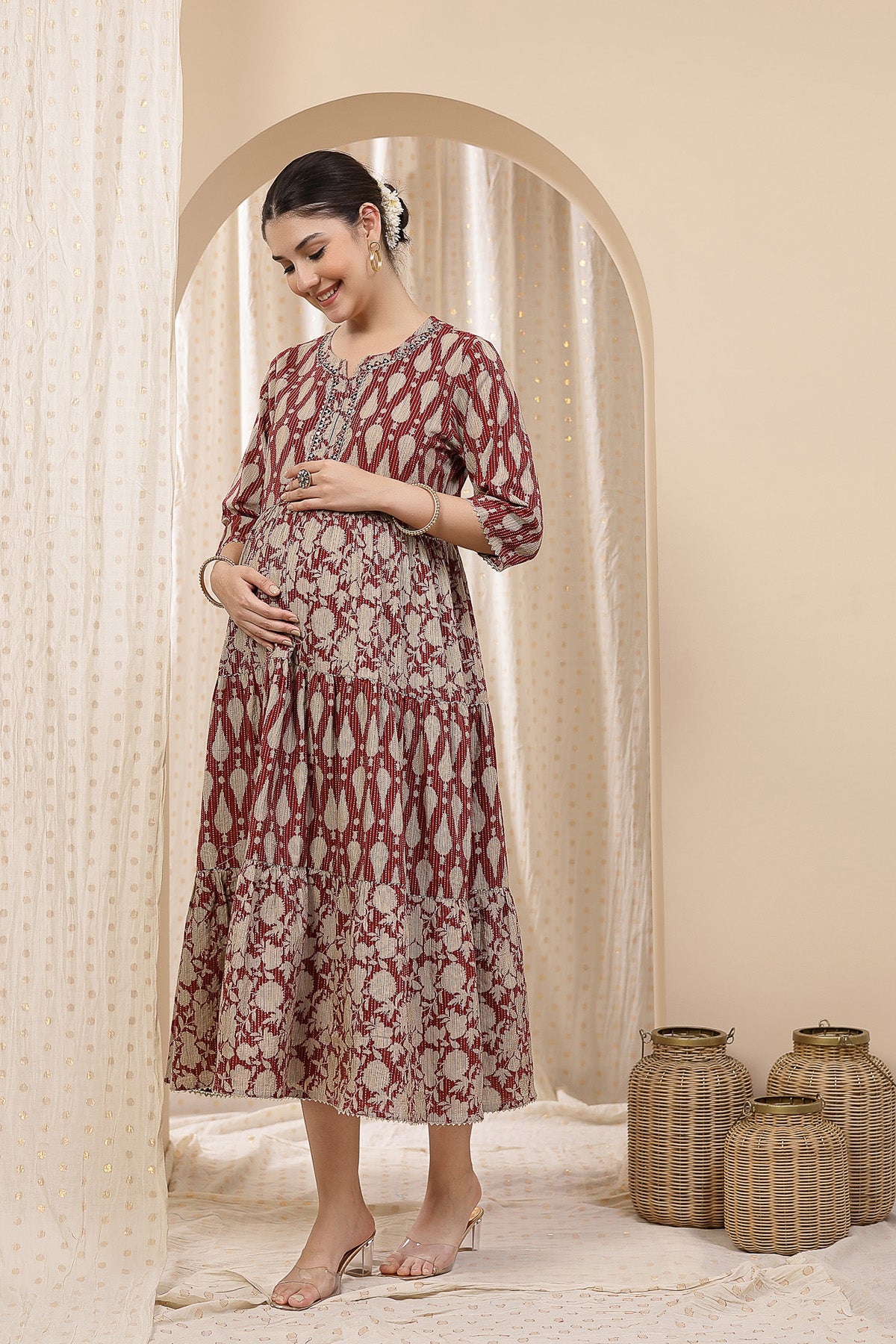 Ethnic Cotton Tiered Maternity Kurti for Feeding - Rust