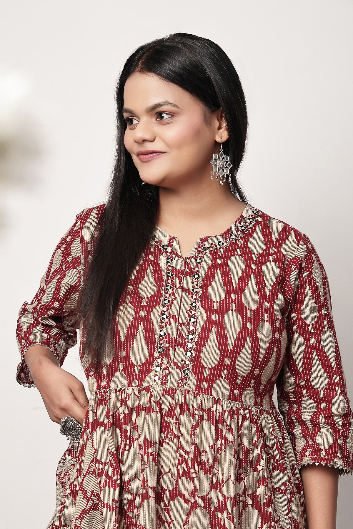 Pair this kurti with straight pants, leggings, or even wear it as a standalone midi dress for a chic Indo-fusion look. Add statement earrings and block heels for a festive vibe or keep it minimal with flats for an easy day-out ensemble. Perfect for new moms, it’s a stylish yet functional piece you’ll reach for again and again.