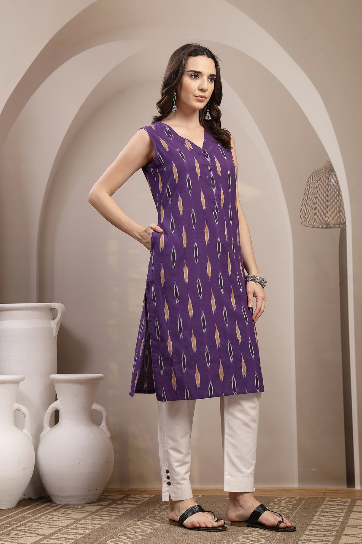 Crafted from soft, breathable 100% cotton, this Ikat V-Neck Cut Sleeves Maternity Kurta is thoughtfully designed to provide lightweight comfort and effortless style through pregnancy and postpartum. The airy sleeveless silhouette allows natural movement while the front button closure ensures convenient nursing access. Featuring a flattering V-neckline and a knee-length structure, this kurta blends traditional Ikat charm with modern maternity functionality for comfortable everyday wear.