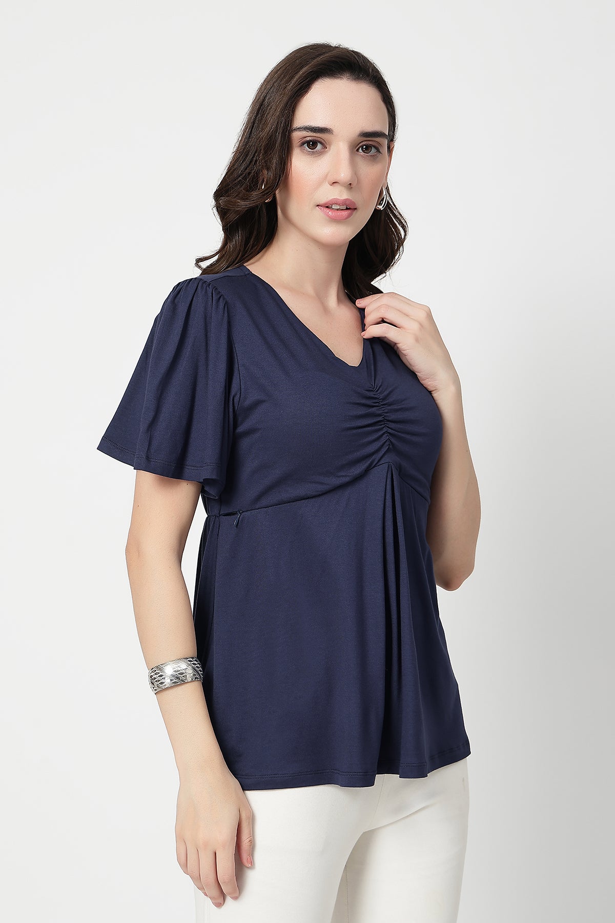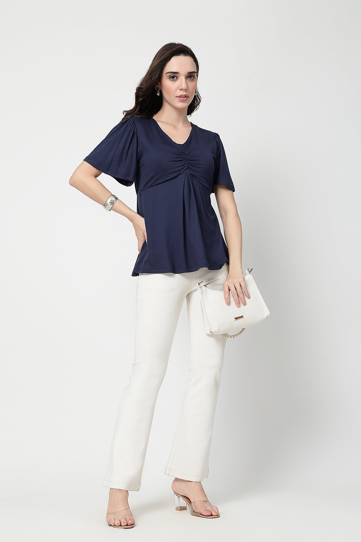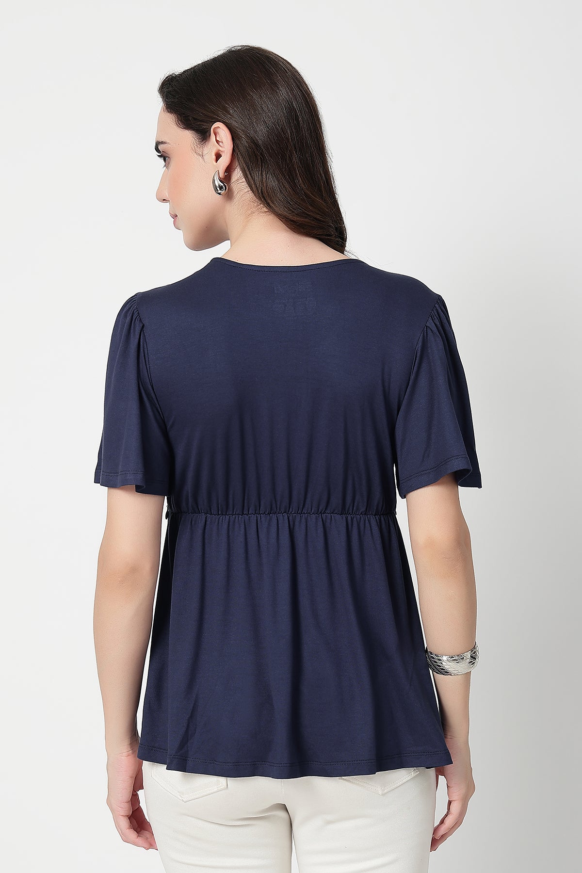 Pair this elegant top with maternity pants or jeans for a chic daytime look. Add minimal jewelry and comfy flats for a relaxed yet refined style — perfect for brunches, casual outings, or cozy home wear.
