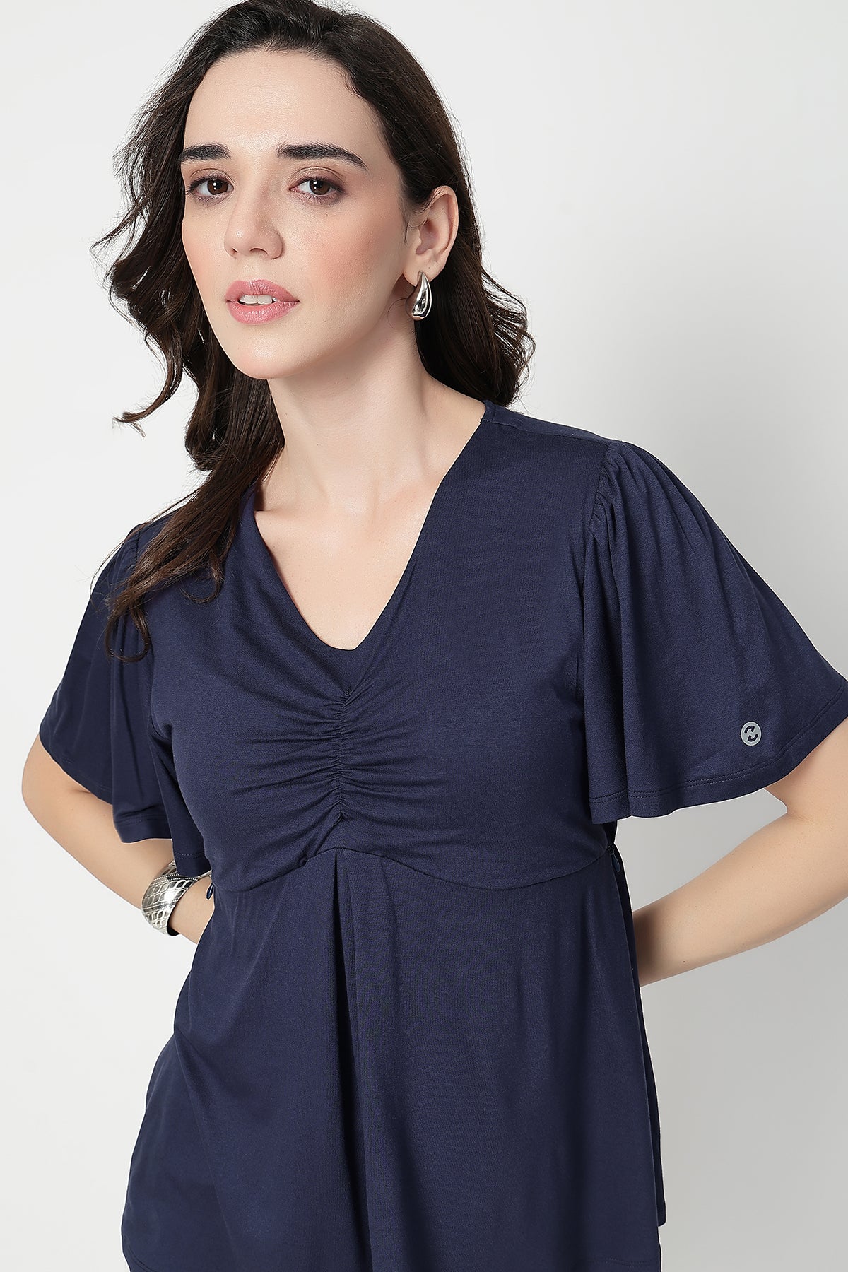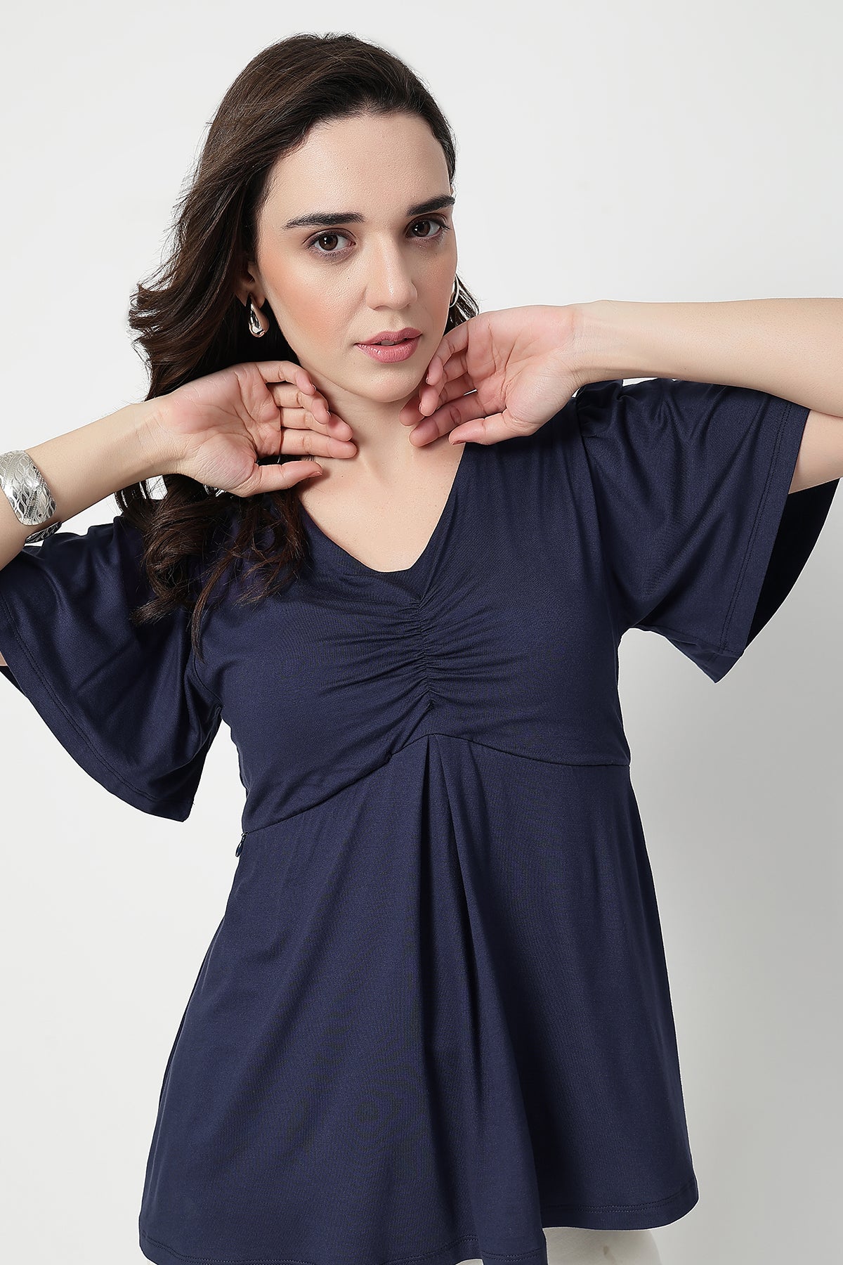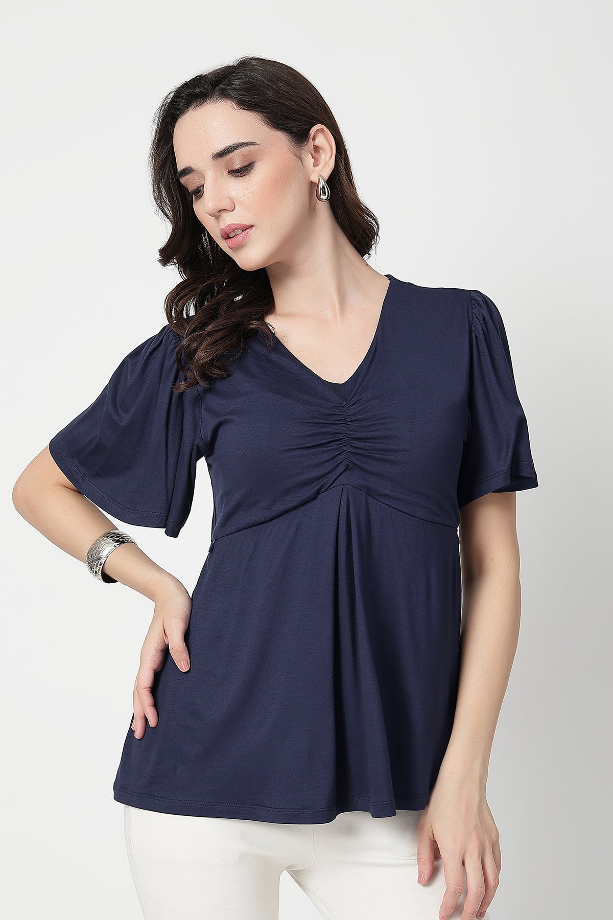 Pair this elegant top with maternity pants or jeans for a chic daytime look. Add minimal jewelry and comfy flats for a relaxed yet refined style — perfect for brunches, casual outings, or cozy home wear.