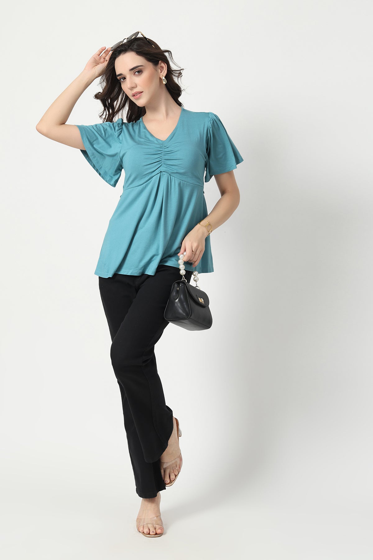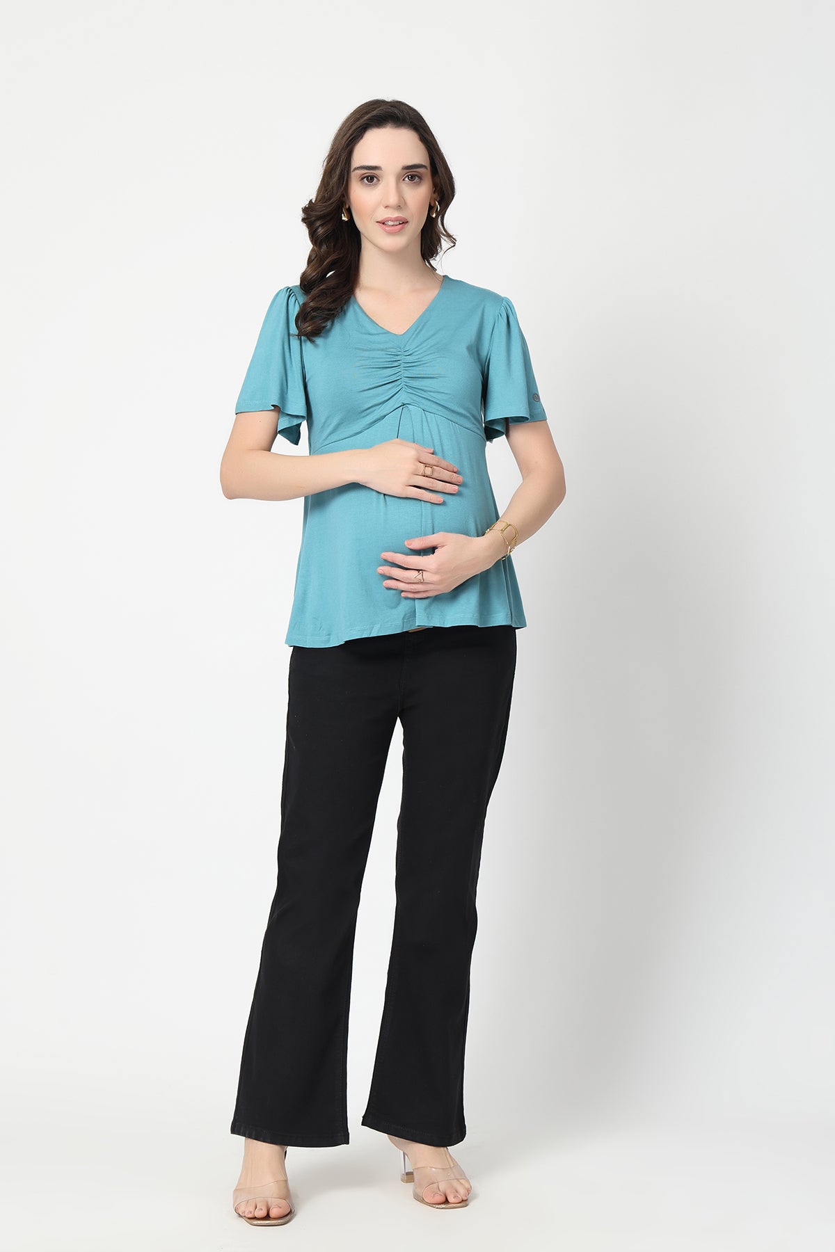 Stay effortlessly stylish and comfortable through pregnancy and beyond with this fixed cup maternity top, crafted from a soft viscose-elastane blend (95% Viscose, 5% Elastane). Designed for both pregnancy and postpartum wear, it features concealed side zips for easy and discreet feeding access. The flattering V-neckline and gentle front gathers enhance your bump beautifully, while the flutter sleeves add a feminine, breezy touch. Lightweight, stretchy, and bio-washed for lasting softness — this top is a must-have for modern moms.