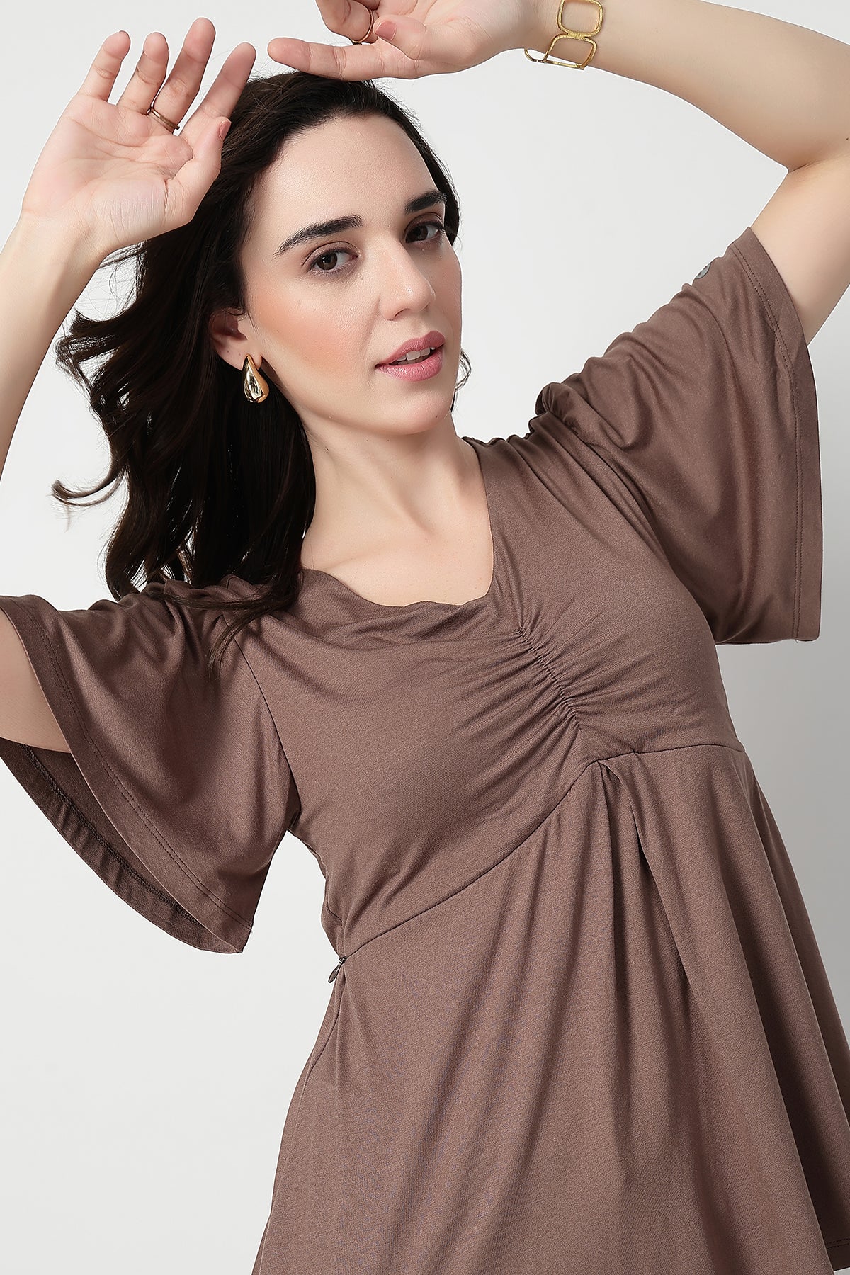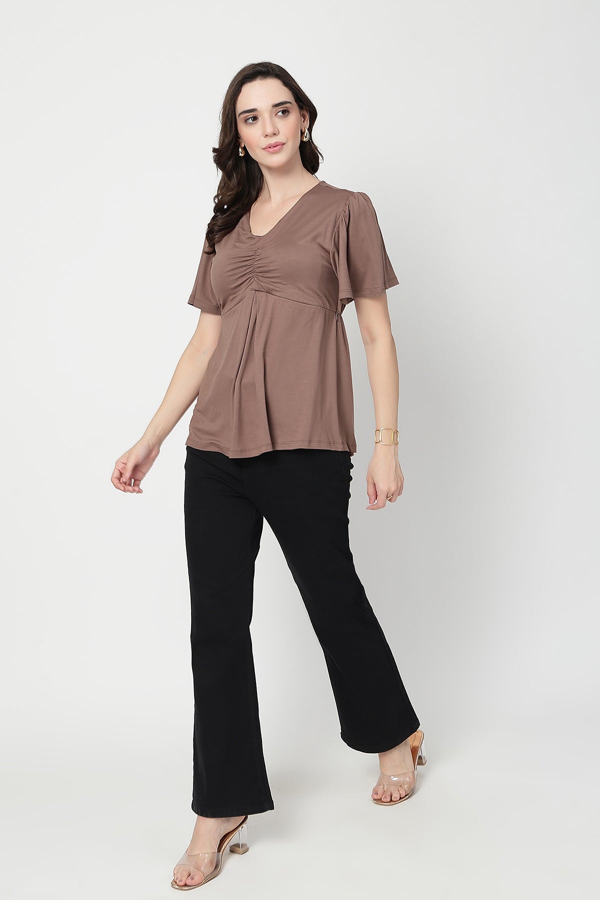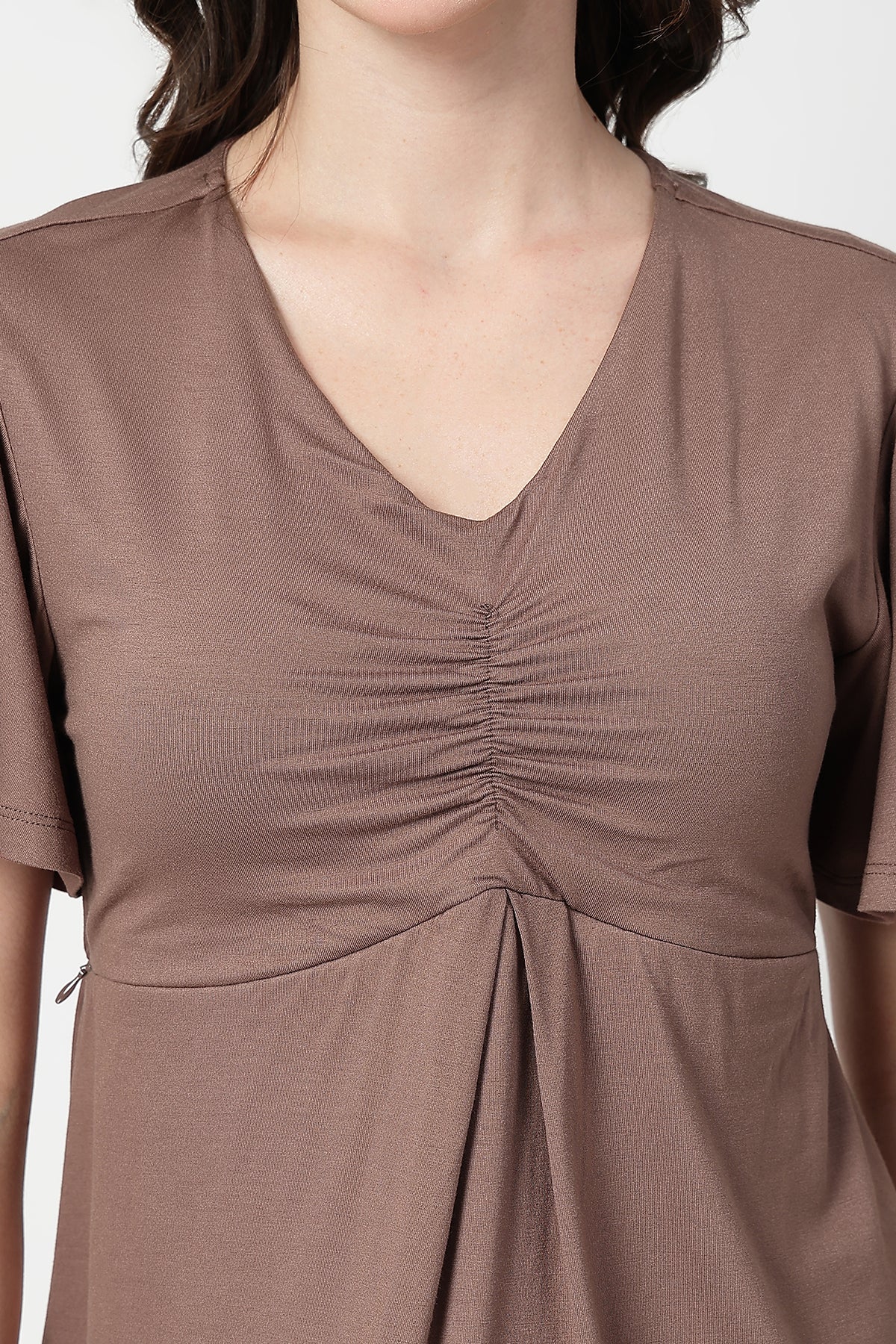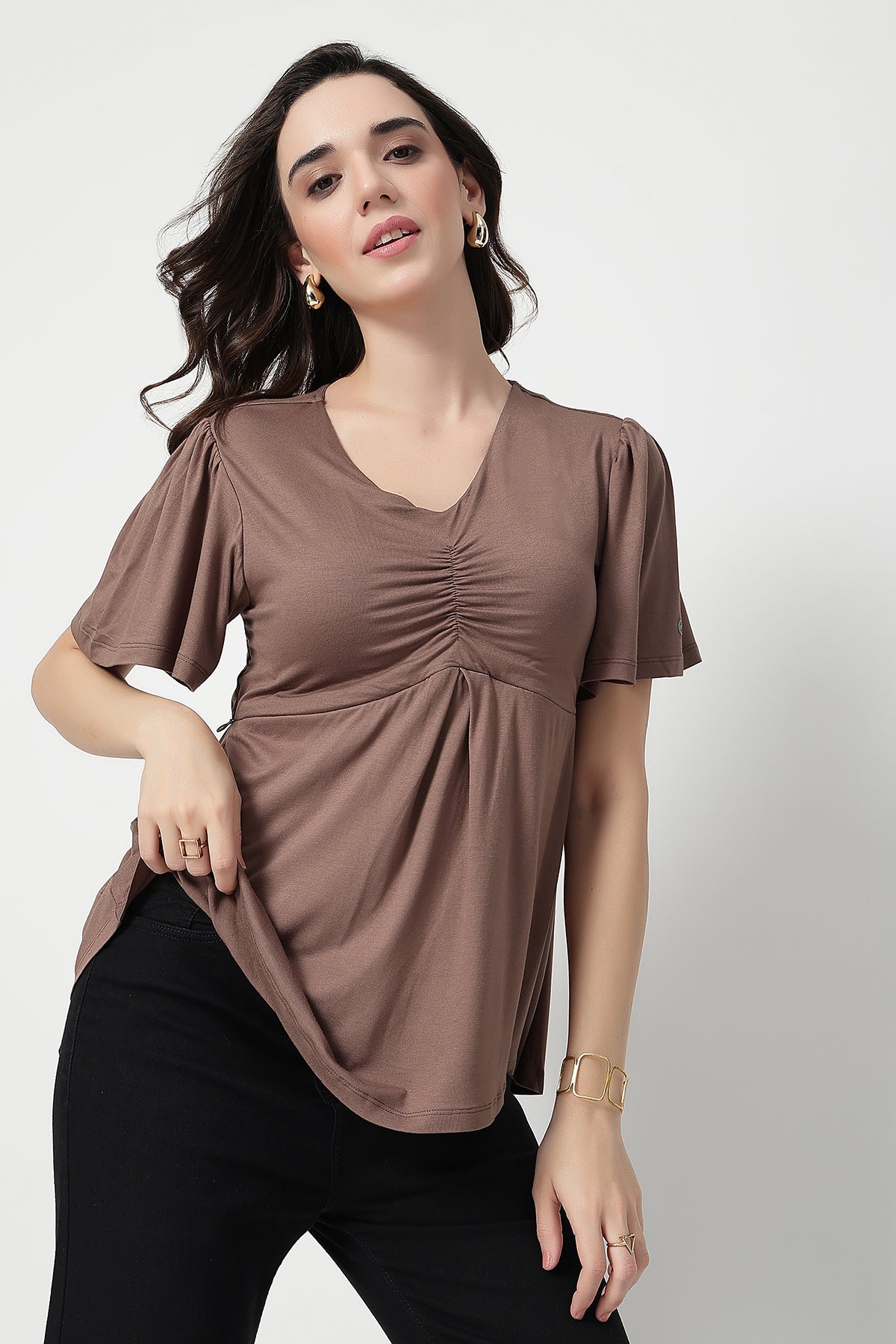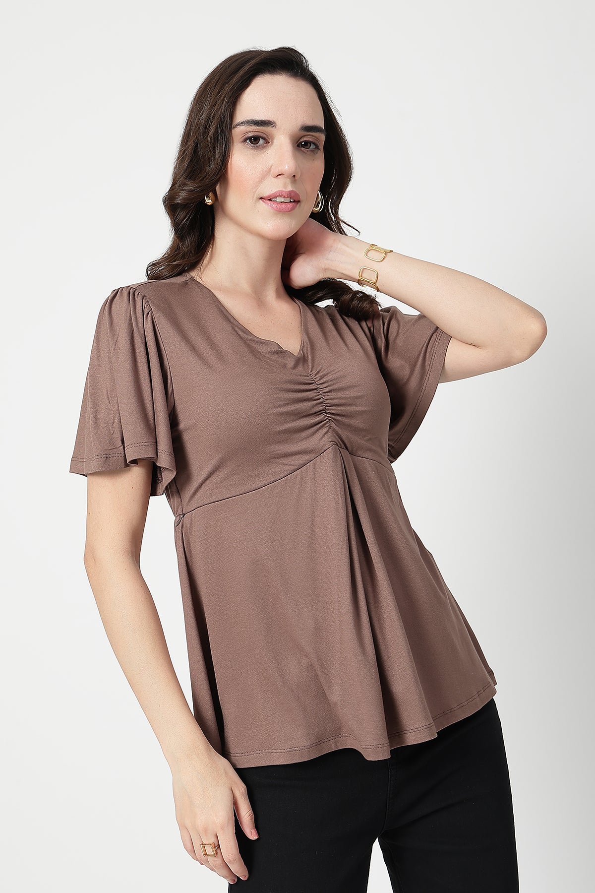 Stay effortlessly stylish and comfortable through pregnancy and beyond with this fixed cup maternity top, crafted from a soft viscose-elastane blend (95% Viscose, 5% Elastane). Designed for both pregnancy and postpartum wear, it features concealed side zips for easy and discreet feeding access. The flattering V-neckline and gentle front gathers enhance your bump beautifully, while the flutter sleeves add a feminine, breezy touch. Lightweight, stretchy, and bio-washed for lasting softness — this top is a must-have for modern moms.