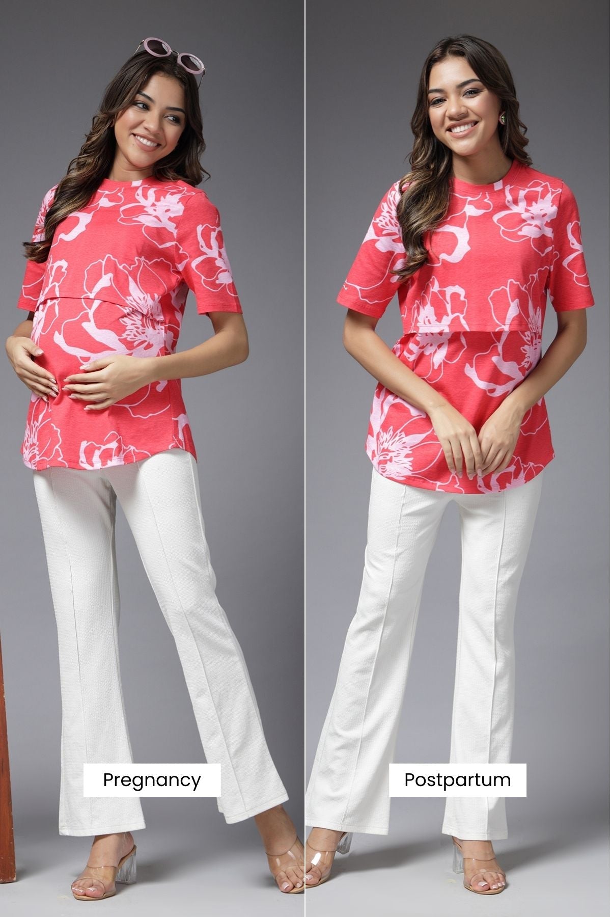 Brighten up your maternity style with this bold coral pink floral top. Designed with zipless feeding access, it’s perfect for the modern mom who values both fashion and function, ensuring you stay effortlessly stylish while on the go.