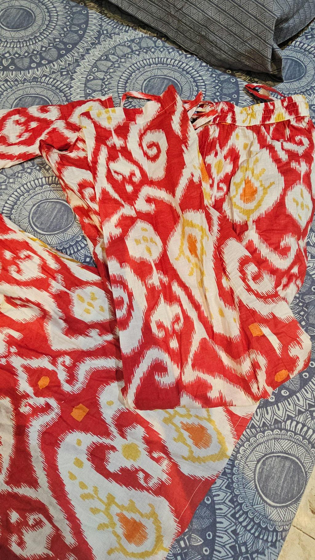 The high-waisted pants complement the kurta perfectly, featuring the same captivating ikat pattern. Together, they create a silhouette that gracefully accommodates your growing baby bump, radiating confidence and style.