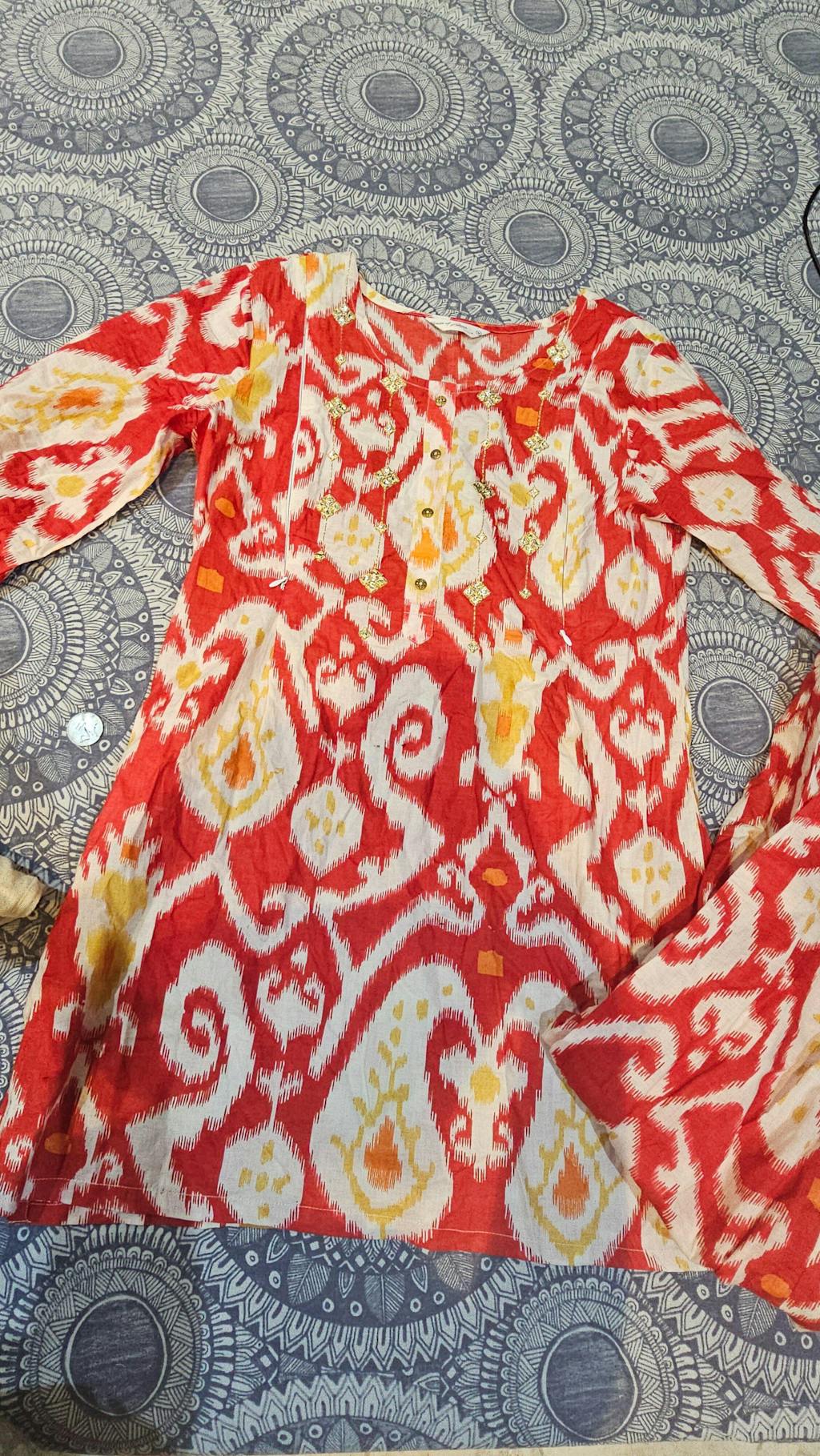 The set showcases a mesmerizing ikat pattern in a vibrant palette of coral, accented with detailing in motifs. The kurta features intricate mirror work around the placket, adding a touch of bohemian chic.