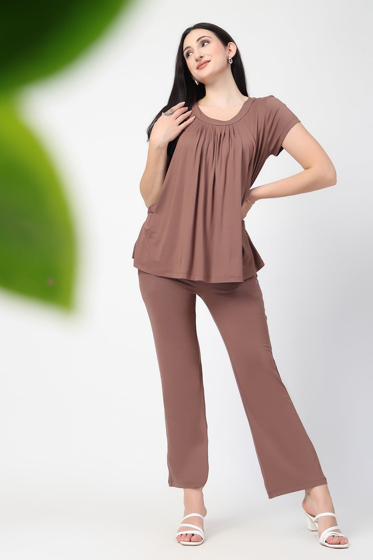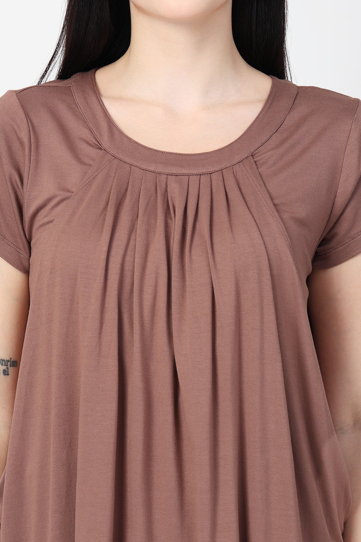 Our Discreet Breastfeeding Access Top offers easy nursing access with a stylish front pleat design. Crafted from lightweight, 4-way stretch fabric, it provides ultimate comfort and movement. The bio-washed viscose and elastane blend ensures softness, while color lock technology prevents fading. With super recovery elastane for lasting shape and discreet pockets for essentials, this top is perfect for every mom.
