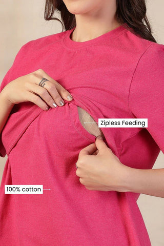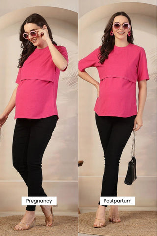 Stay stylish and practical with this vibrant fuchsia maternity and feeding top. Made from 100% soft cotton knit fabric, this zipless top is perfect for pregnancy and postpartum. The round neckline and relaxed fit make it a versatile choice for casual outings or lounging at home.