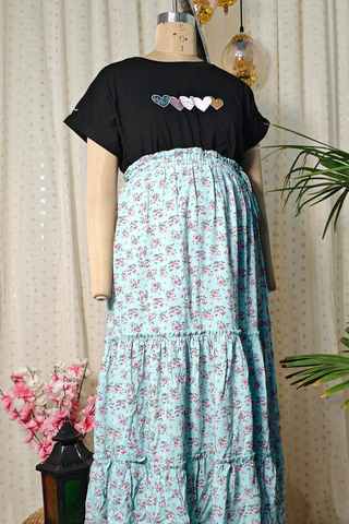 Flared Skirt with a twist, its very soft elasticated waistband expands with your pregnancy belly and stays with you from first trimester till post pregnancy. Very beautiful floral ditsy print with 3 tiers and 2 pockets ! Yappe, carry your favourite things in these pockets. Comes with a drawstring to adjust your waist band as per your size.