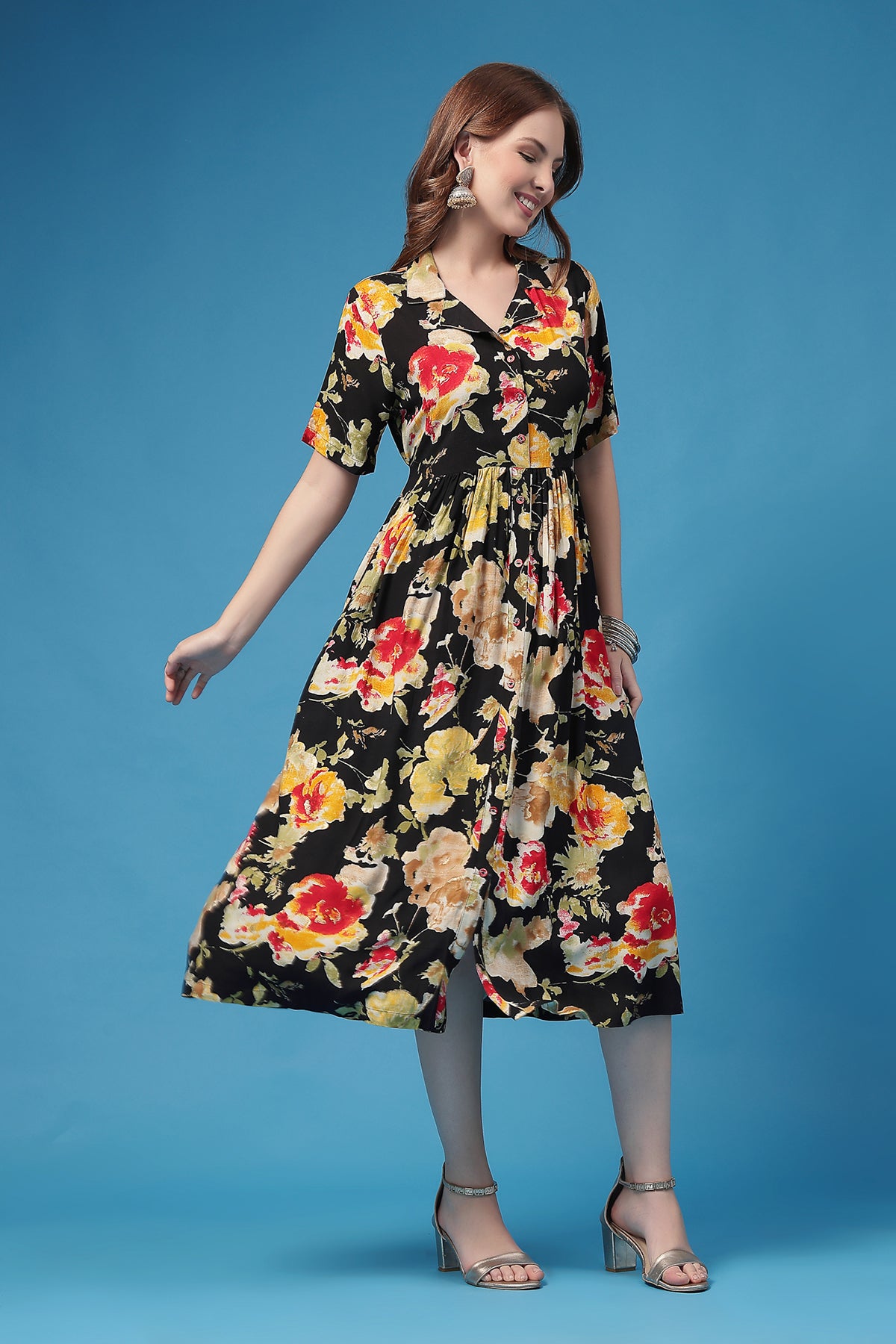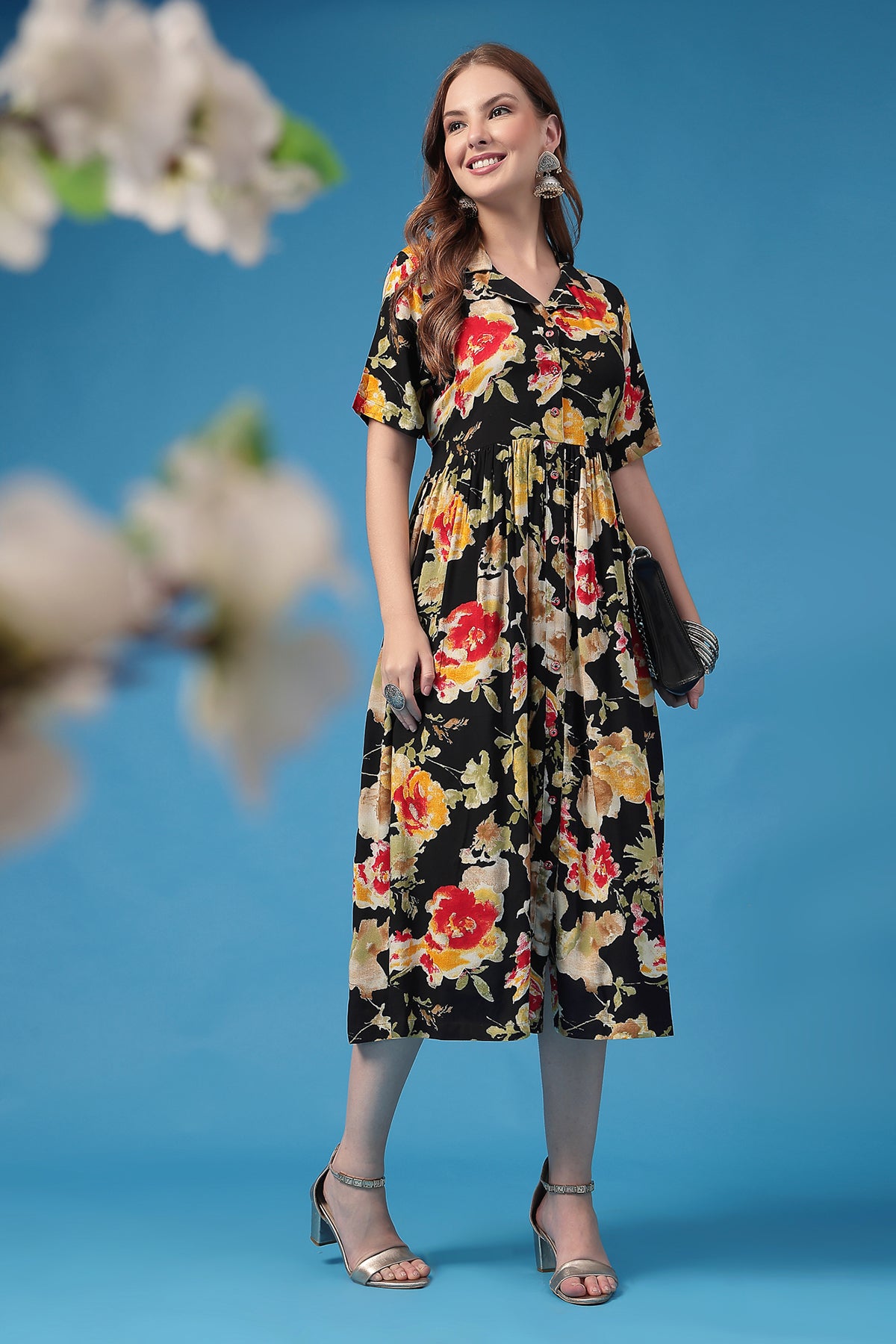 All Over Printed Zipless Feeding Shirt Dress - Black