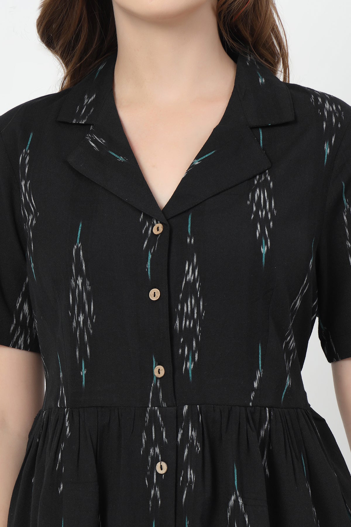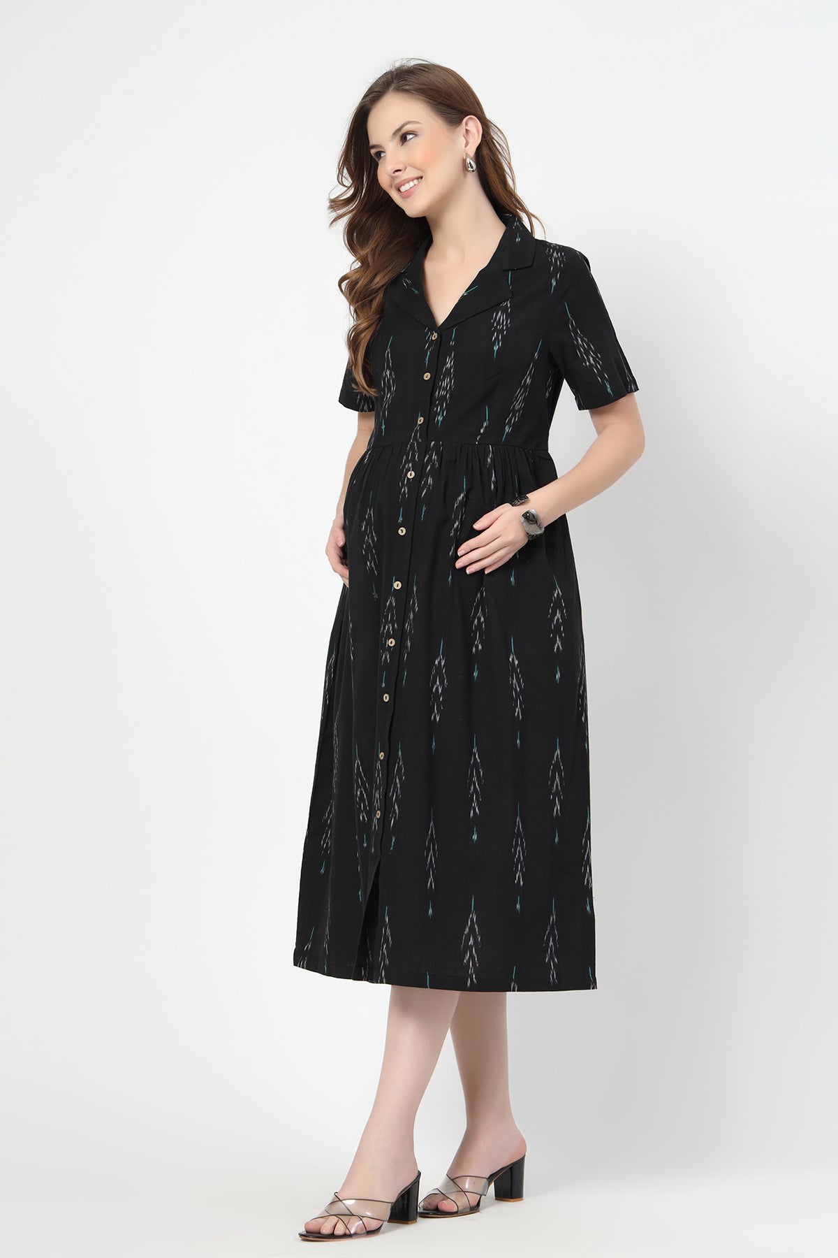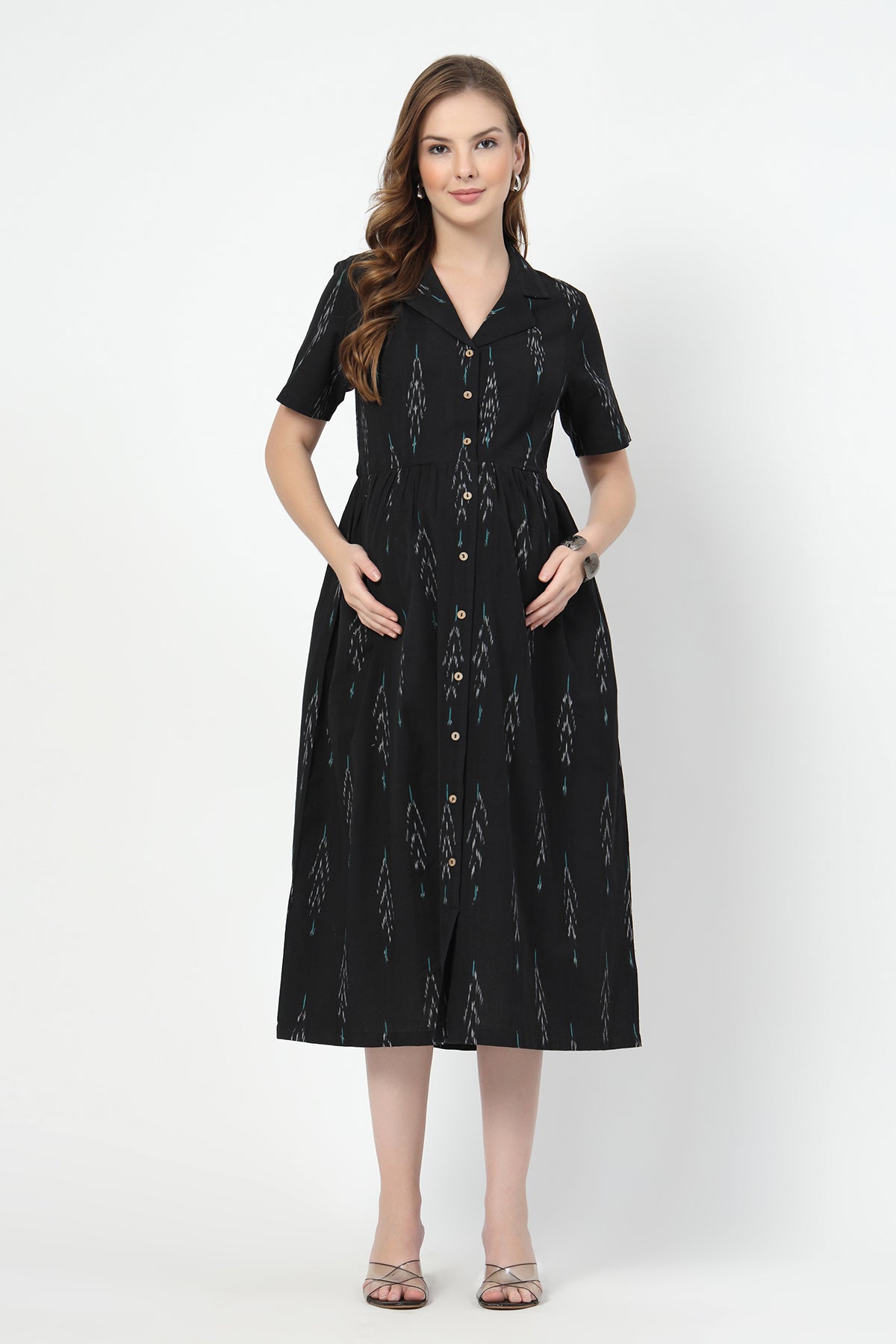 Made from breathable yarn-dyed Ikat cotton, this piece is as easy to wear as it is to style. From its lapel collar and relaxed midi cut to the super-practical button-down front for feeding access — every detail is there to make your life simpler (and more stylish).