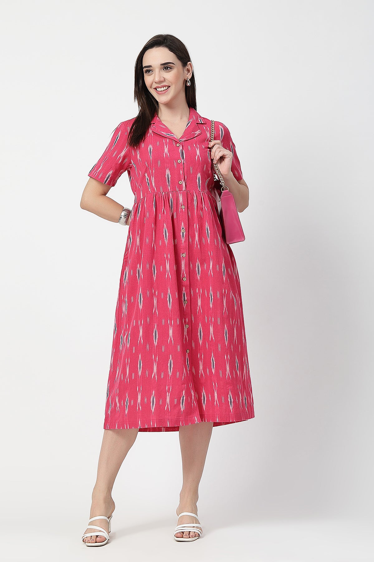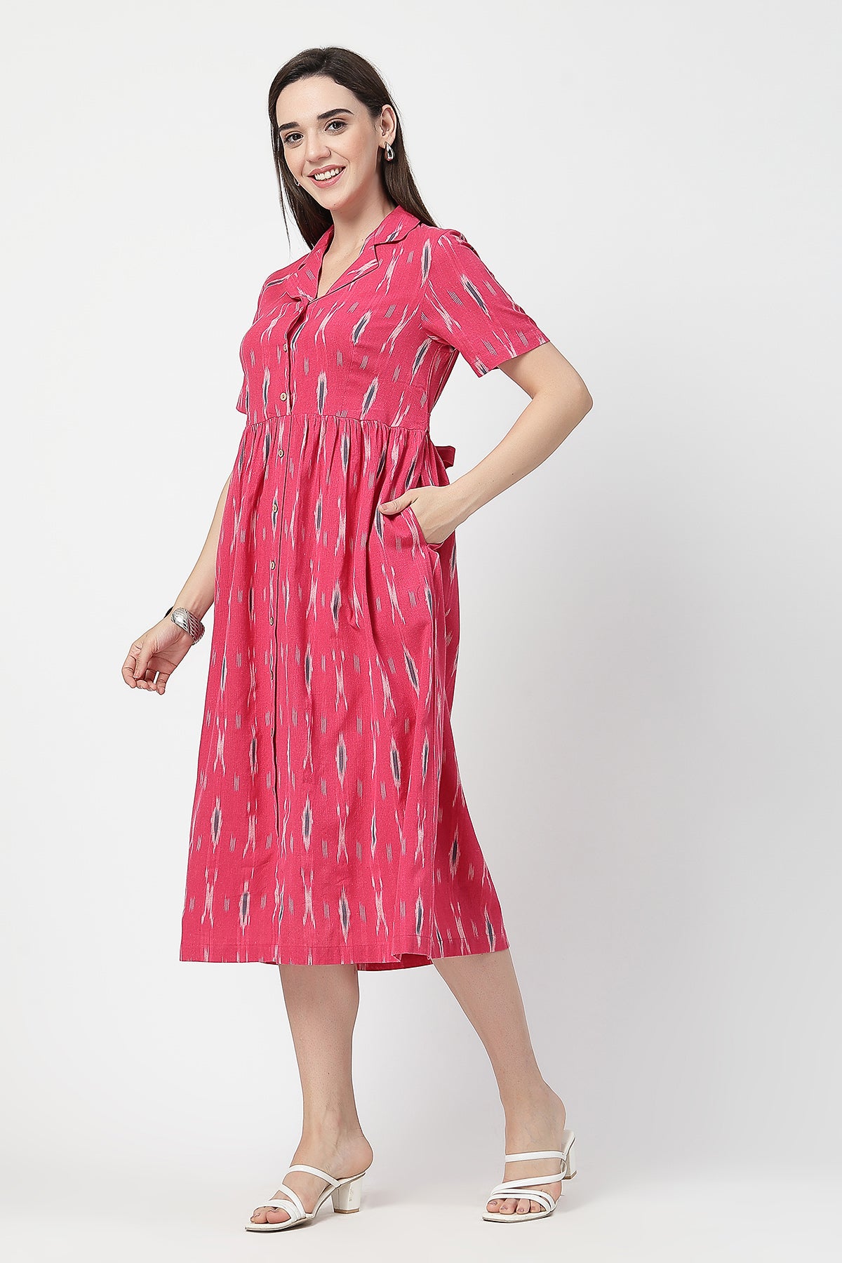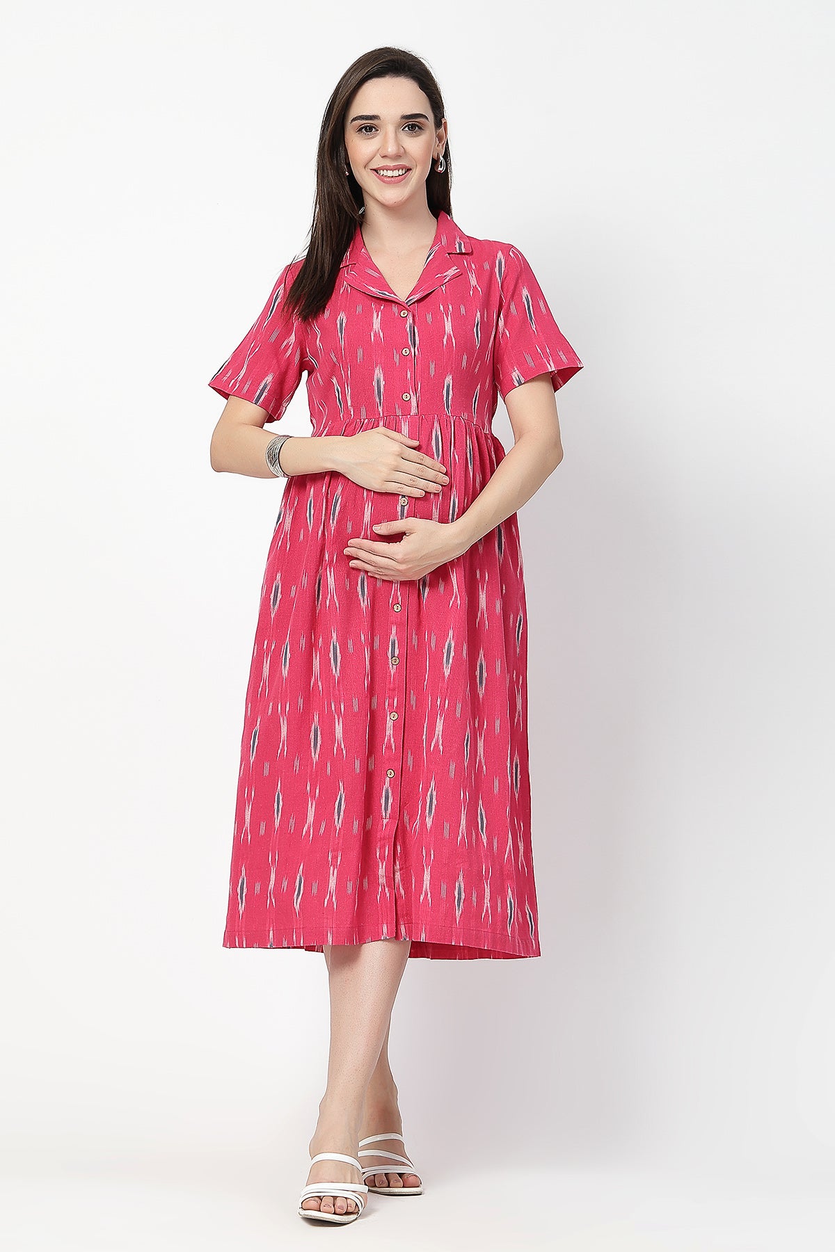 Made from breathable yarn-dyed Ikat cotton, this piece is as easy to wear as it is to style. From its lapel collar and relaxed midi cut to the super-practical button-down front for feeding access — every detail is there to make your life simpler (and more stylish).