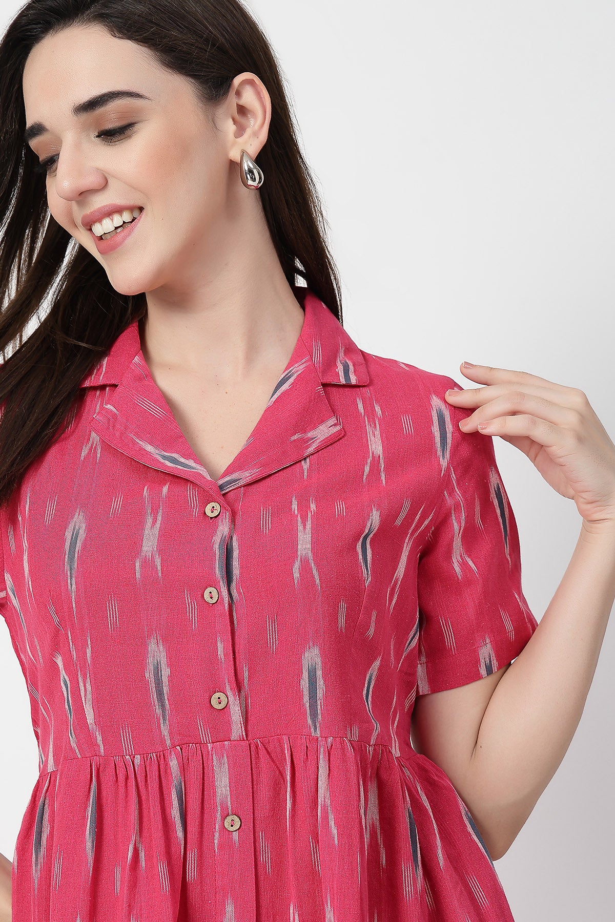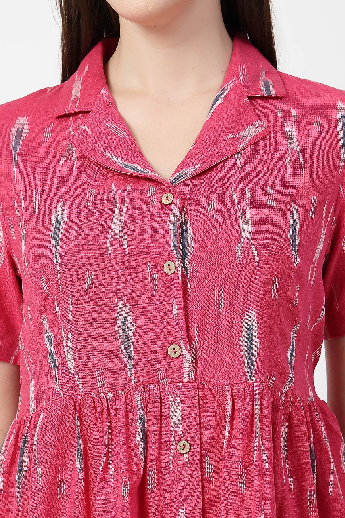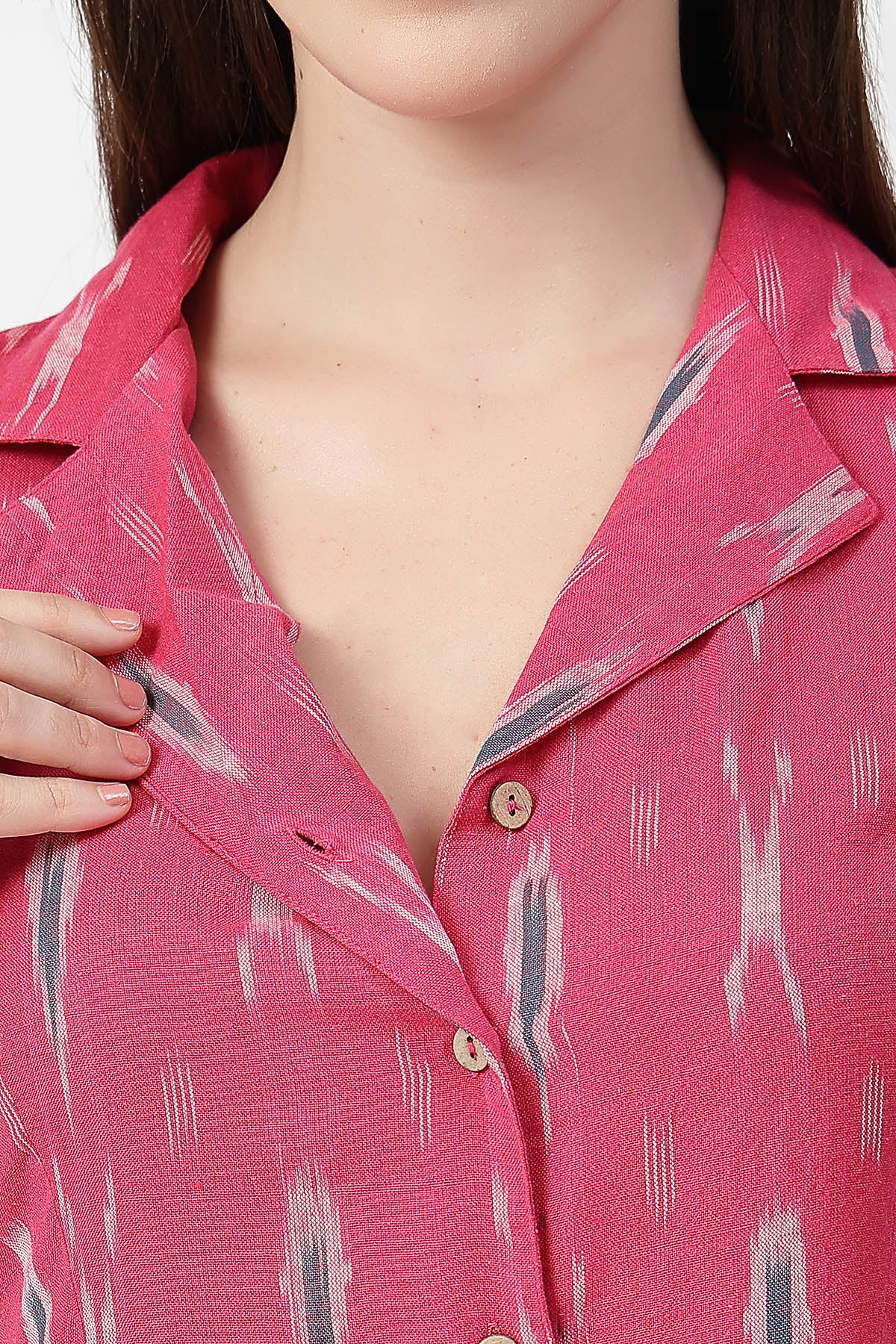Made from breathable yarn-dyed Ikat cotton, this piece is as easy to wear as it is to style. From its lapel collar and relaxed midi cut to the super-practical button-down front for feeding access — every detail is there to make your life simpler (and more stylish).