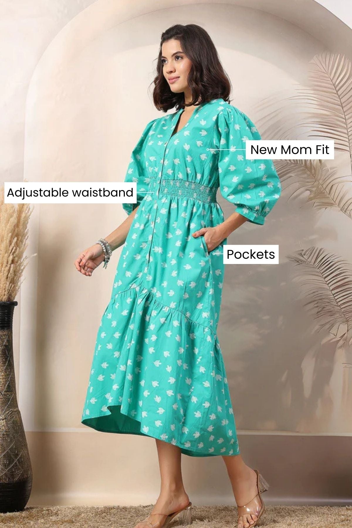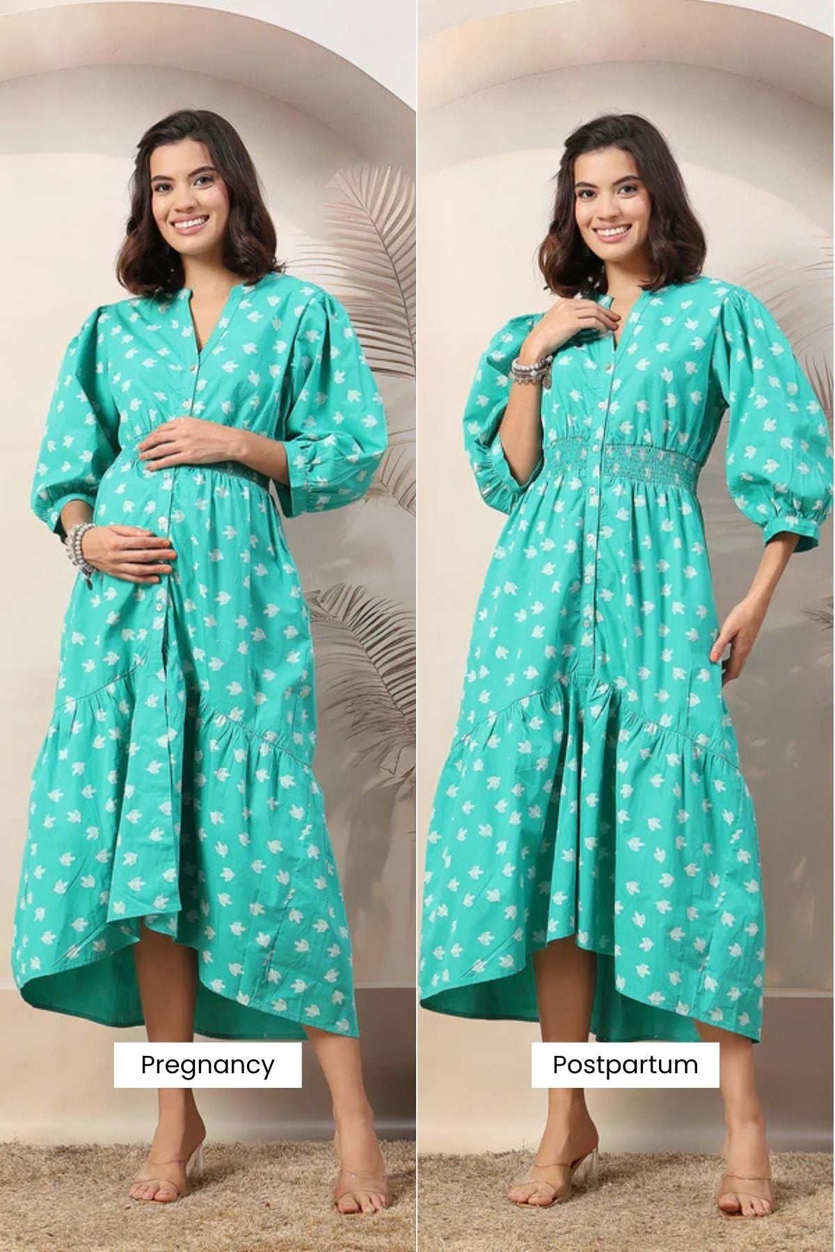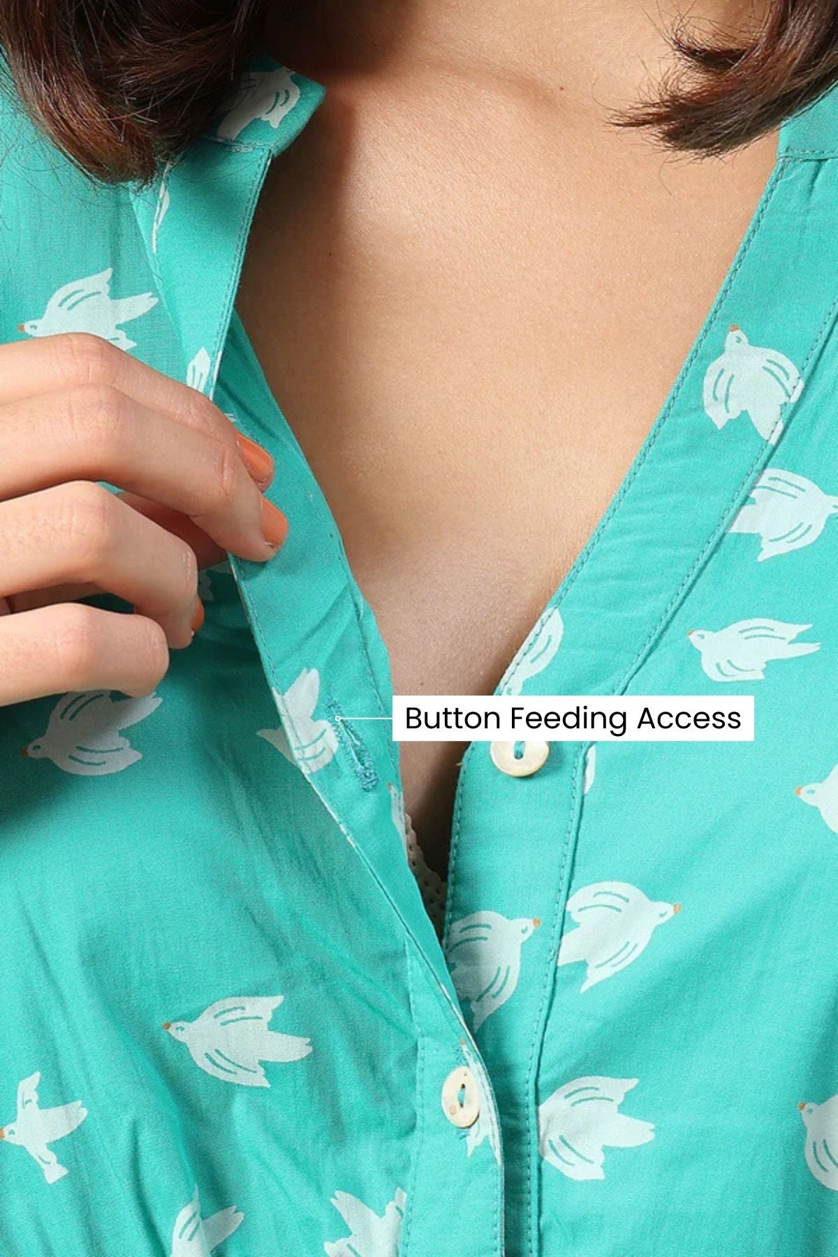 Feel beautifully at ease in this light green bird print maternity dress with practical feeding access and a flattering fit.