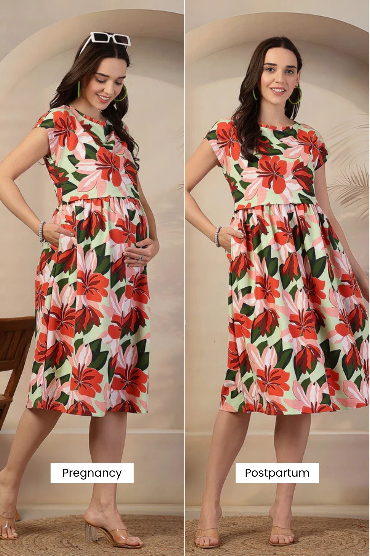 Elevate your maternity wardrobe with this vibrant tropical floral dress, designed to blend comfort and style effortlessly. Crafted from soft, breathable 100% cotton fabric, this dress is ideal for both pregnancy and postpartum stages. The playful floral print, functional side pockets, and relaxed silhouette make it perfect for casual outings or lounging at home while staying chic and confident.