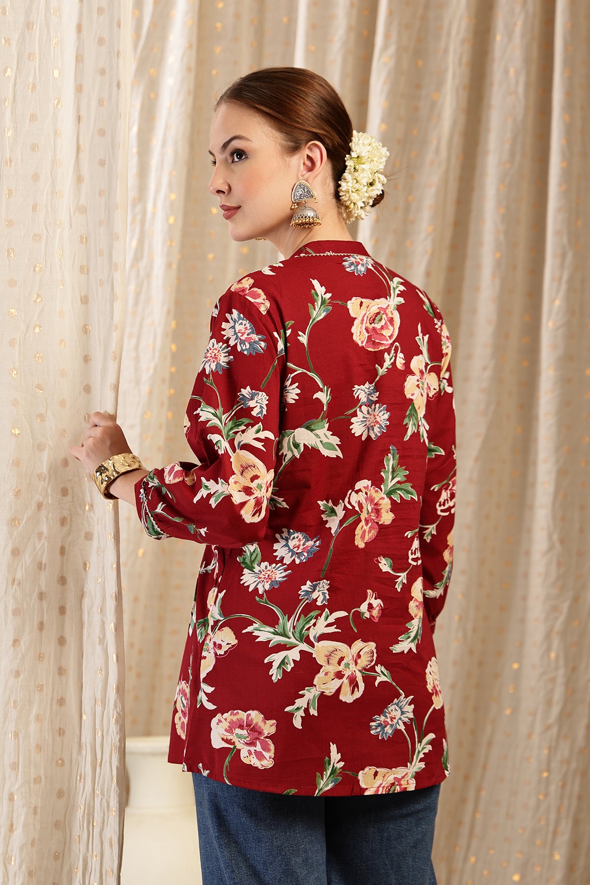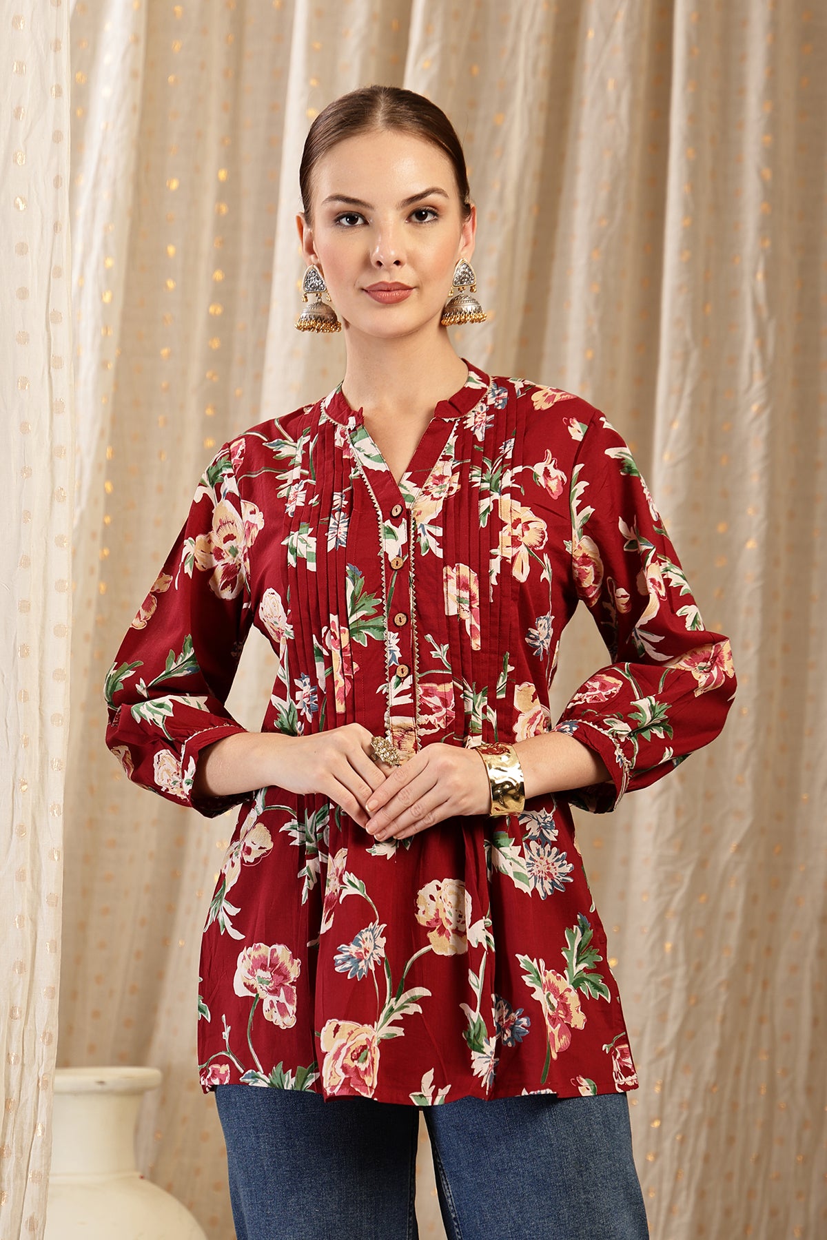 All Over Printed Zipless Feeding Pleated Top - Maroon