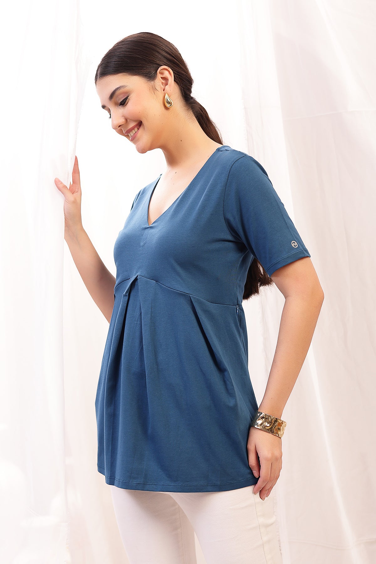 Stay stylish and comfortable with this chic maternity and nursing top, designed in a breathable blend of 95% cotton and 5% elastane for a soft, stretchable fit. The V-neckline paired with front pleated detailing enhances the silhouette while allowing ample space for your growing bump. Thoughtfully placed concealed zip openings provide discreet and easy feeding access, making it a must-have for pregnancy and postpartum wear.