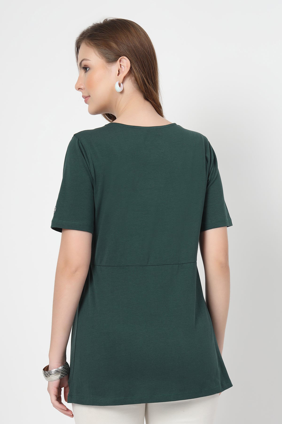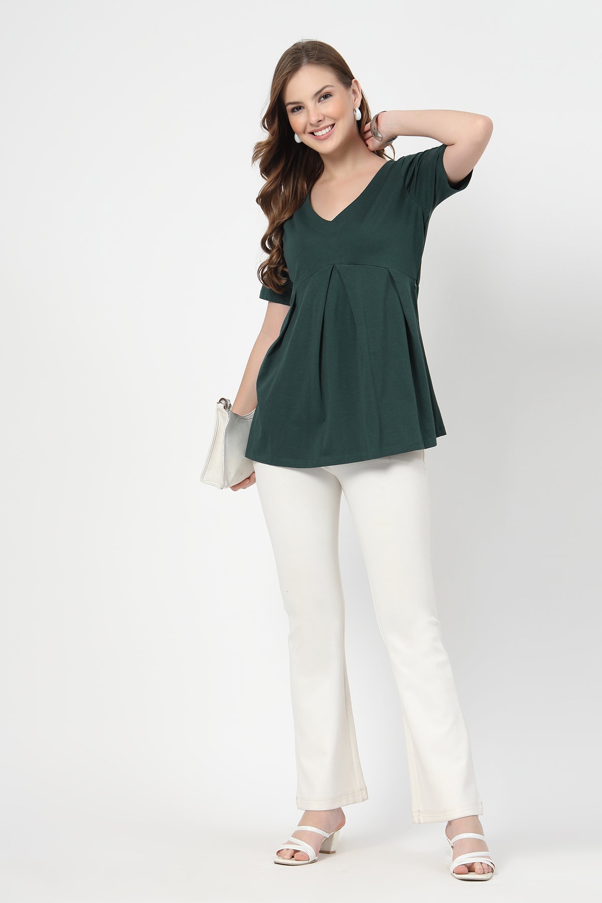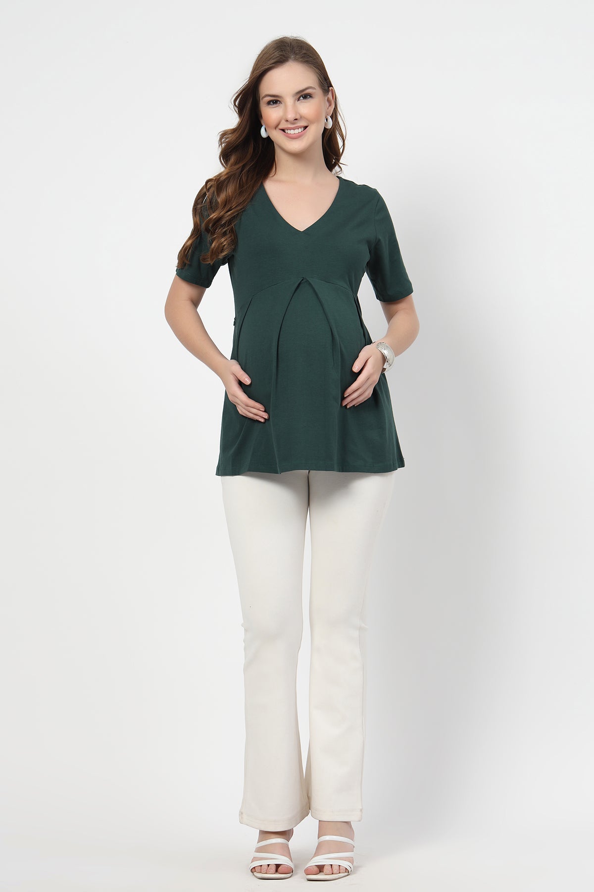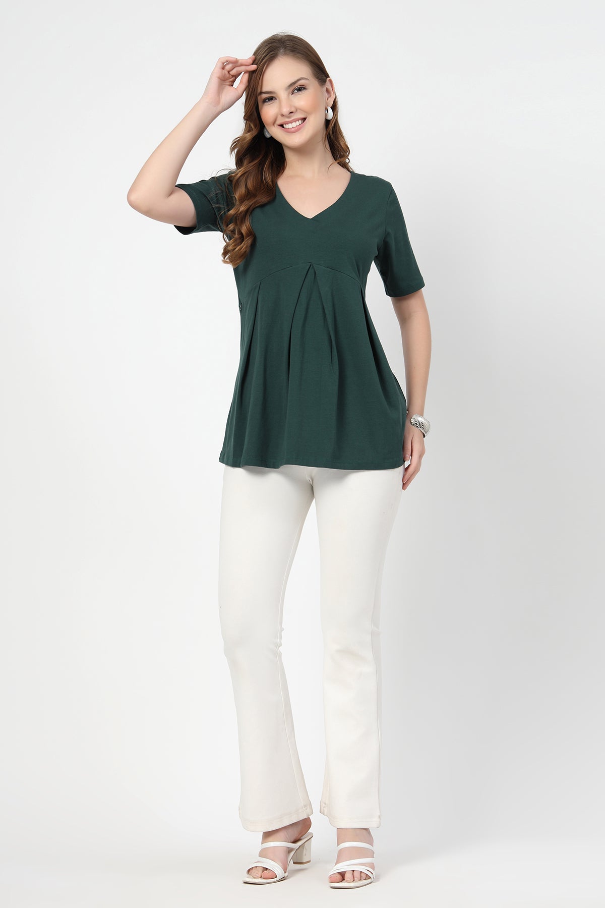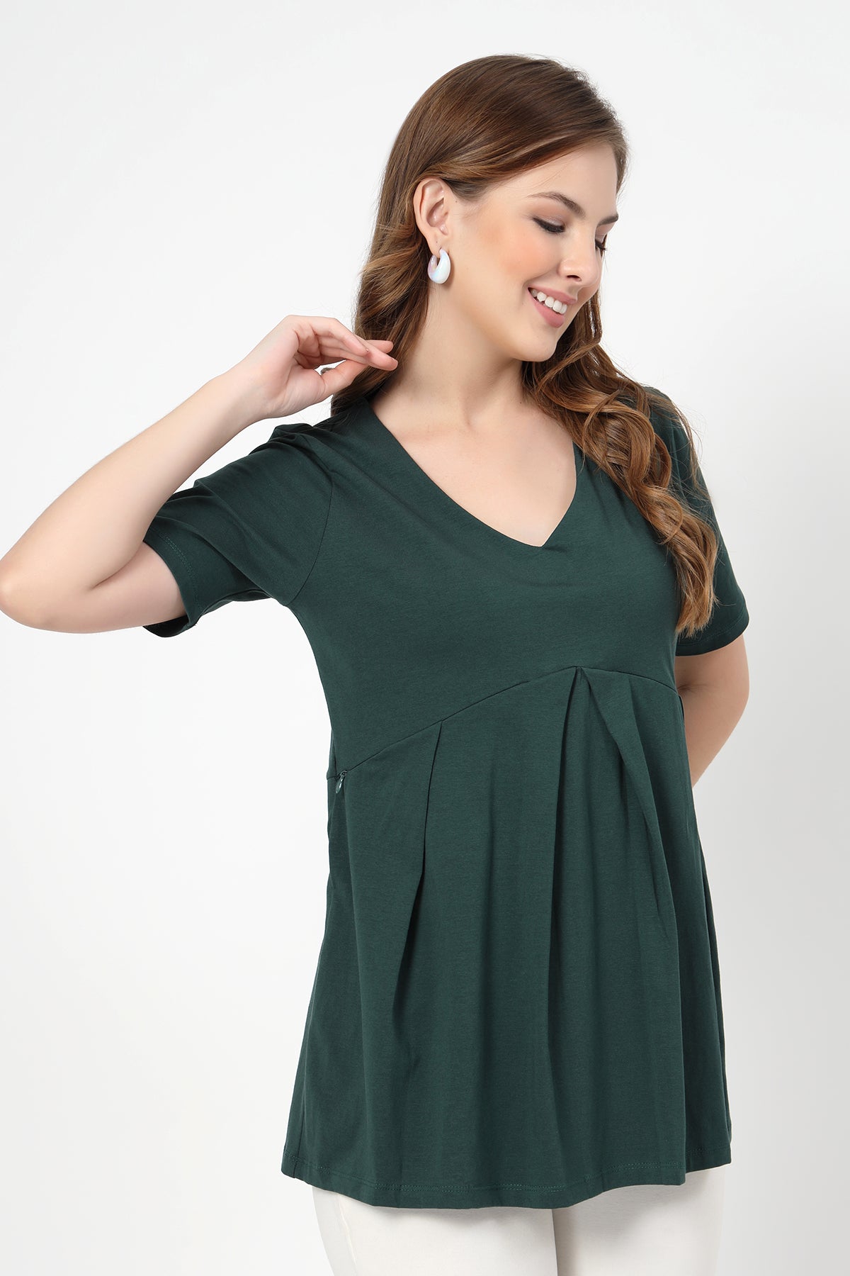 Pleated Cotton Maternity Nursing Top - Bottle Green