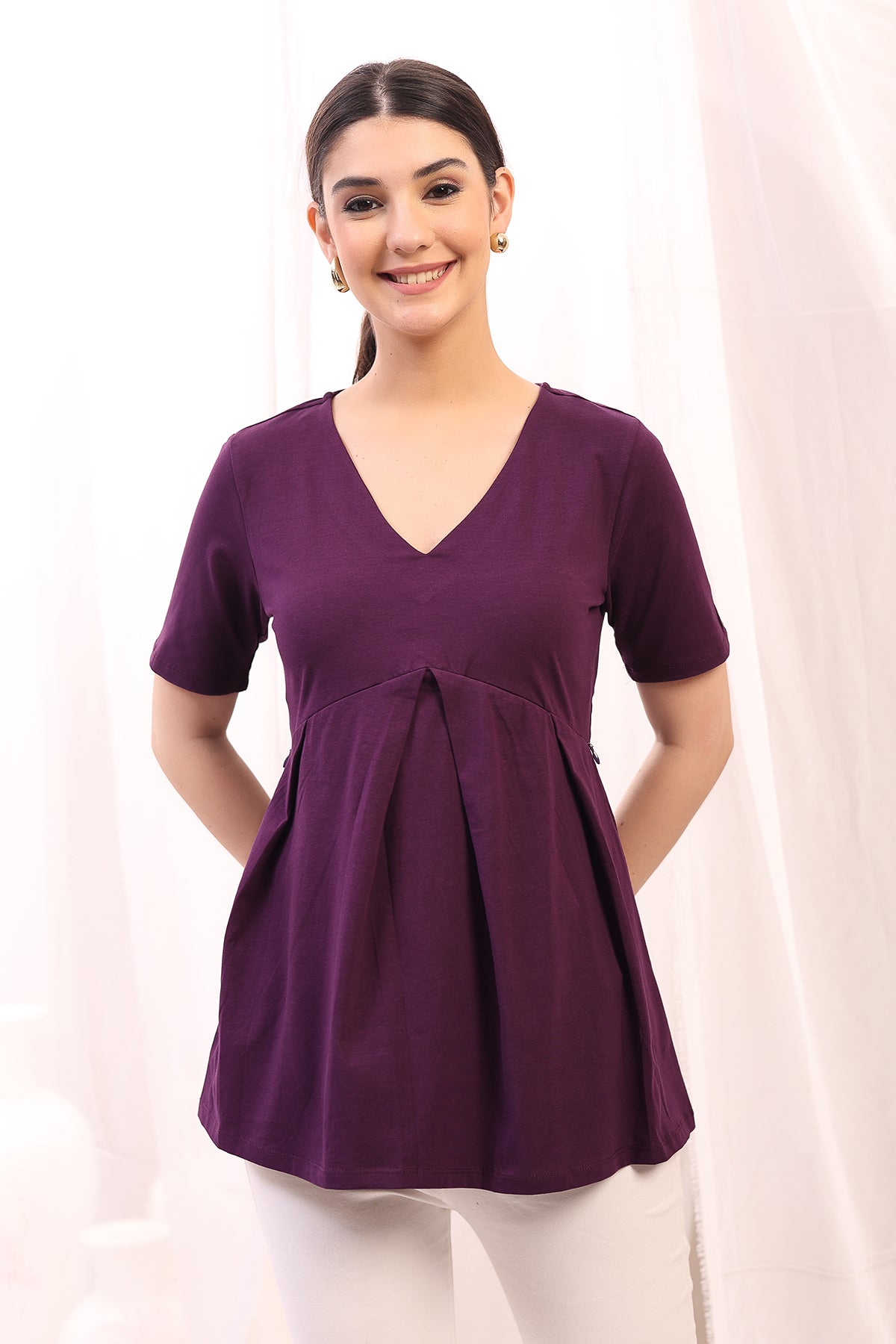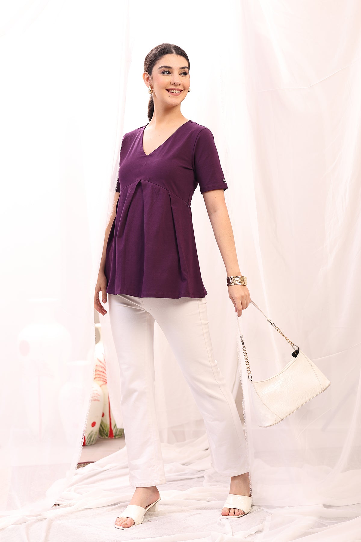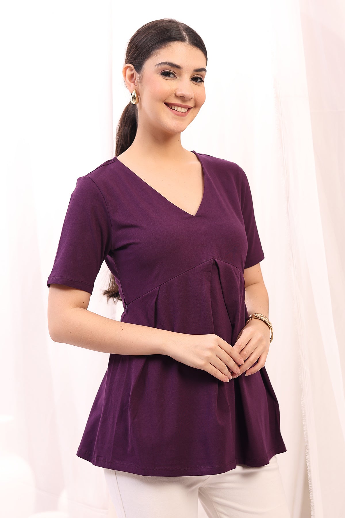 Stay stylish and comfortable with this chic maternity and nursing top, designed in a breathable blend of 95% cotton and 5% elastane for a soft, stretchable fit. The V-neckline paired with front pleated detailing enhances the silhouette while allowing ample space for your growing bump. Thoughtfully placed concealed zip openings provide discreet and easy feeding access, making it a must-have for pregnancy and postpartum wear.