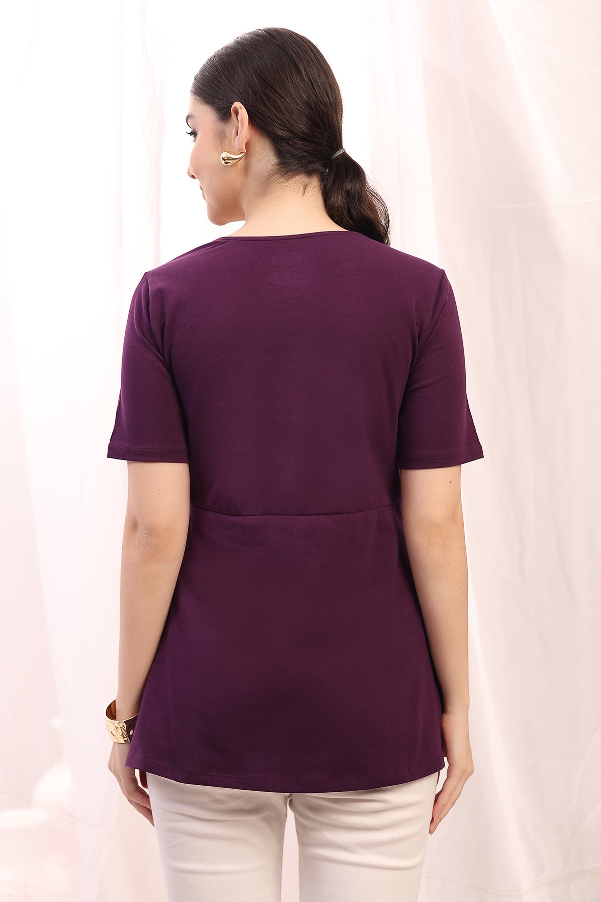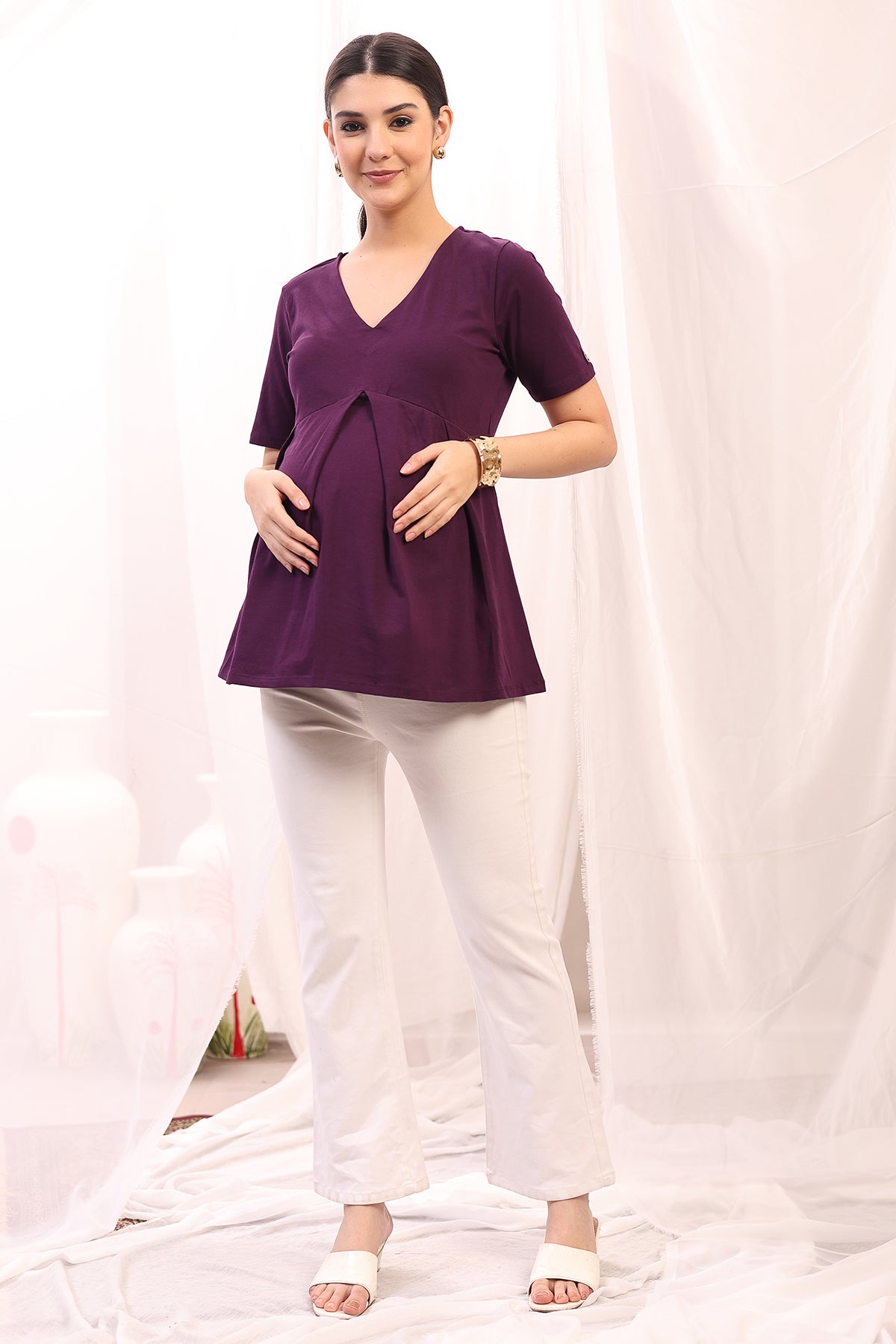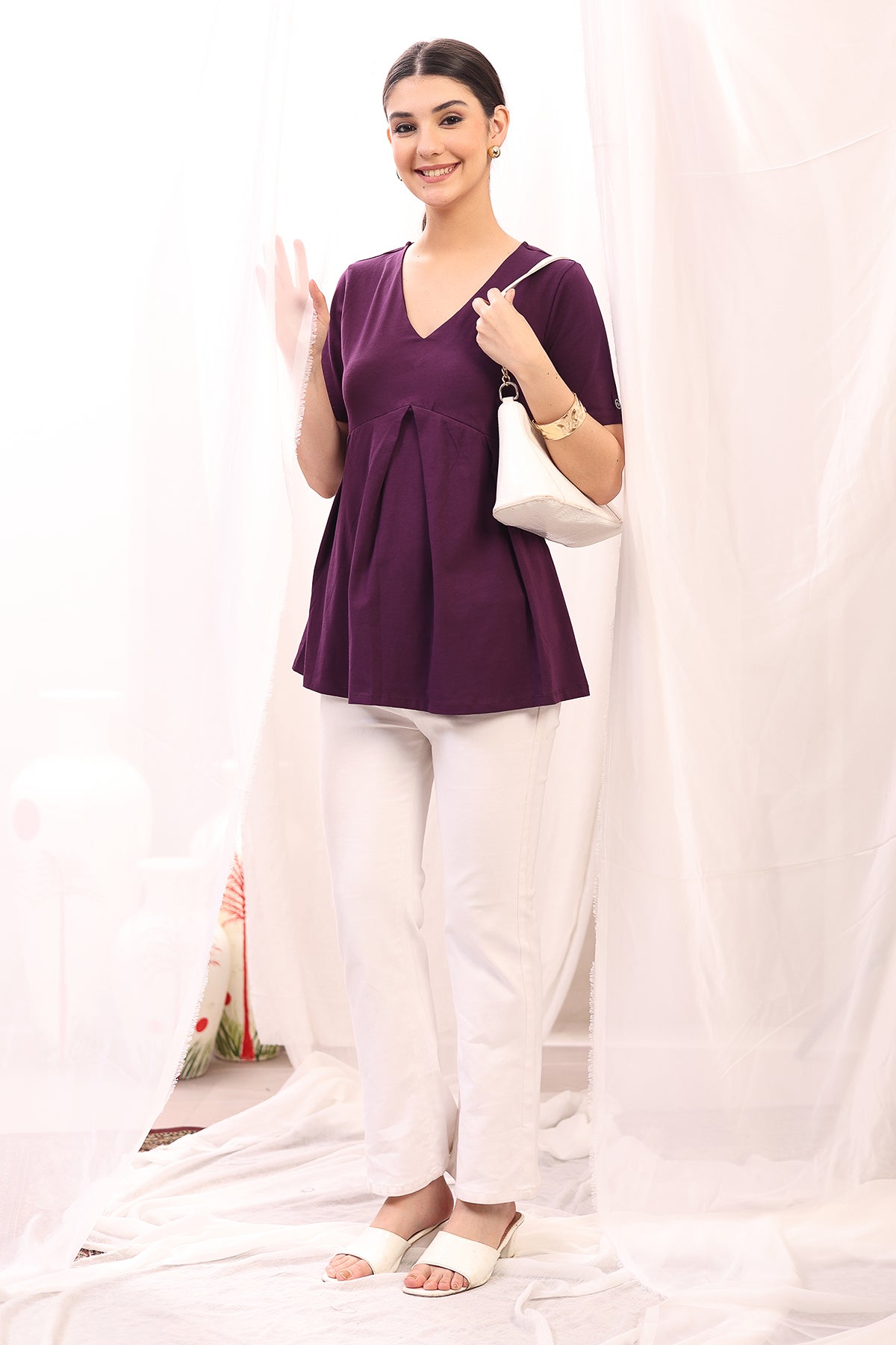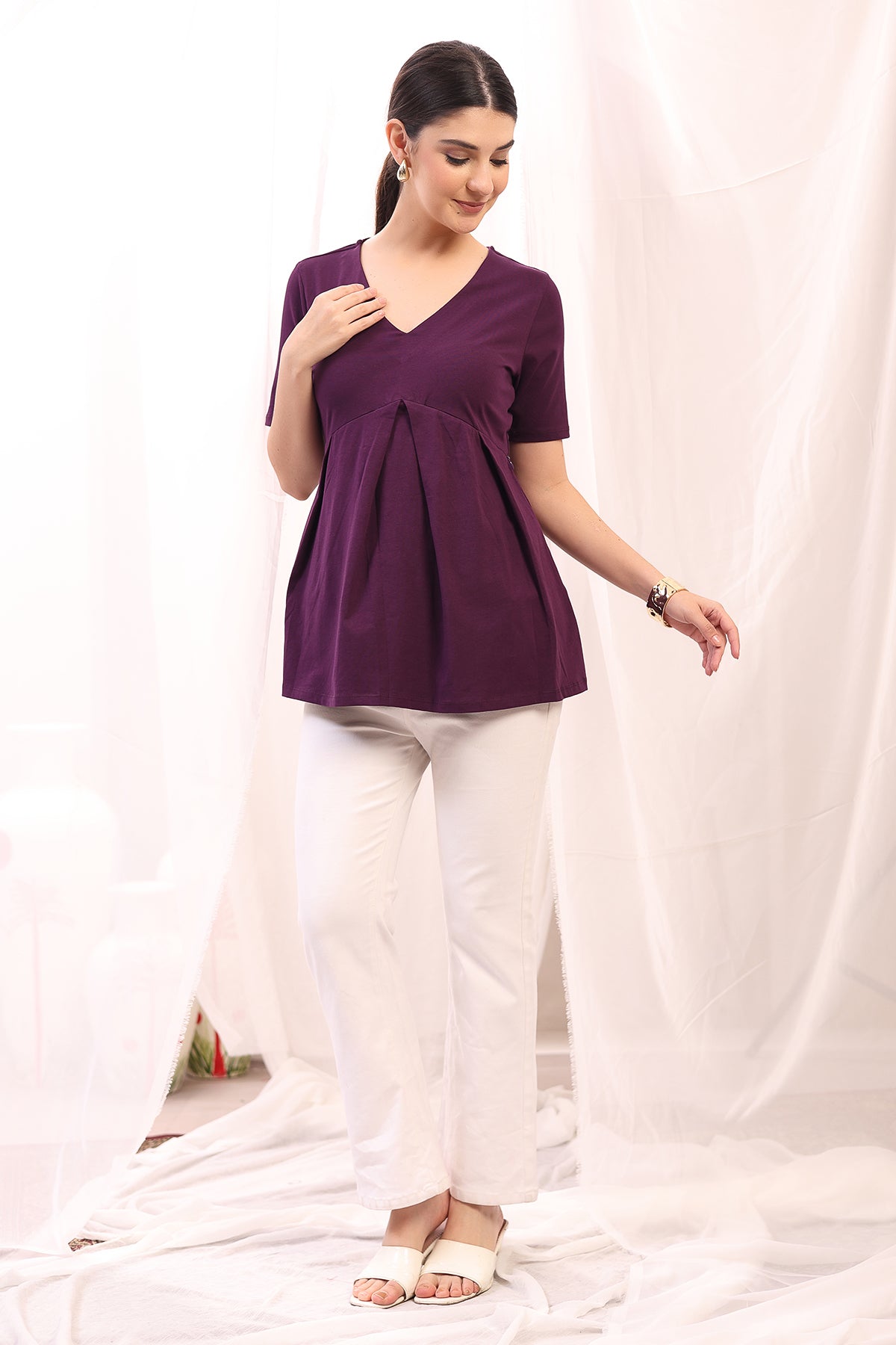 Stay stylish and comfortable with this chic maternity and nursing top, designed in a breathable blend of 95% cotton and 5% elastane for a soft, stretchable fit. The V-neckline paired with front pleated detailing enhances the silhouette while allowing ample space for your growing bump. Thoughtfully placed concealed zip openings provide discreet and easy feeding access, making it a must-have for pregnancy and postpartum wear.