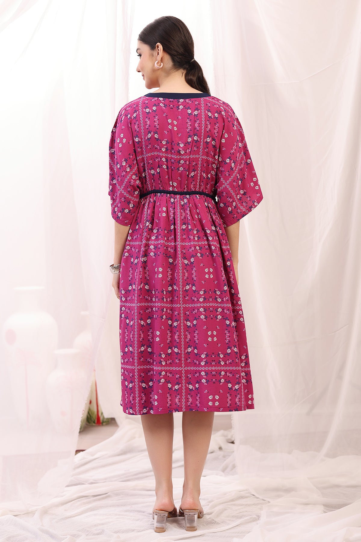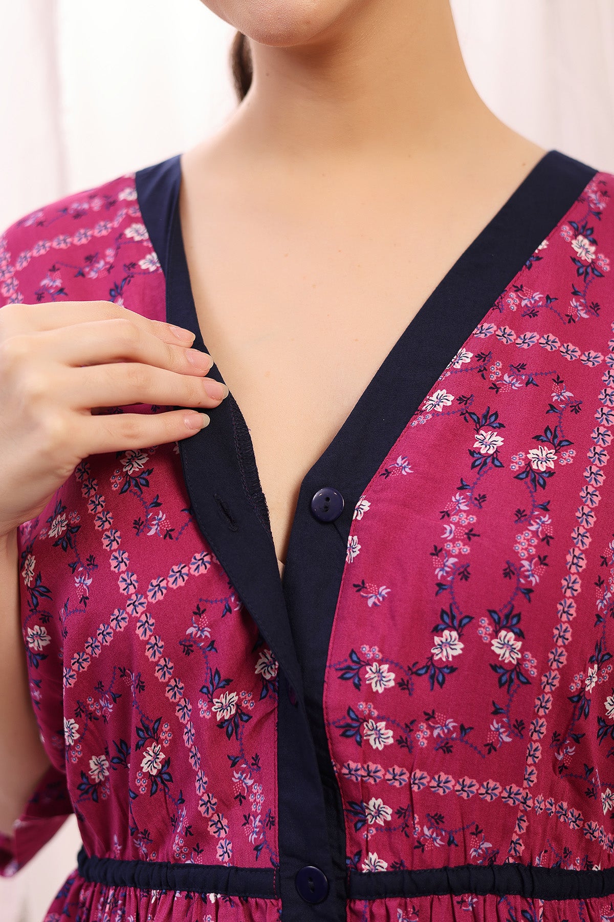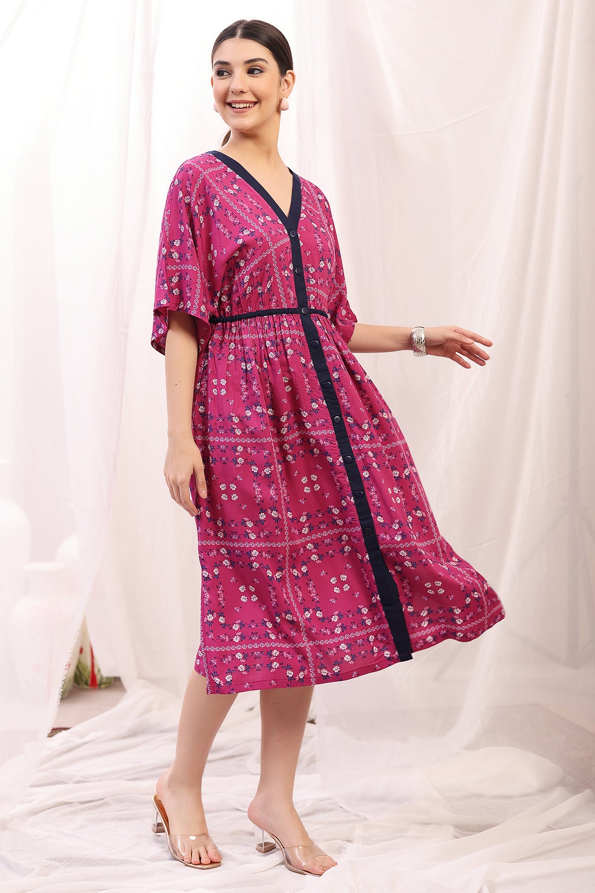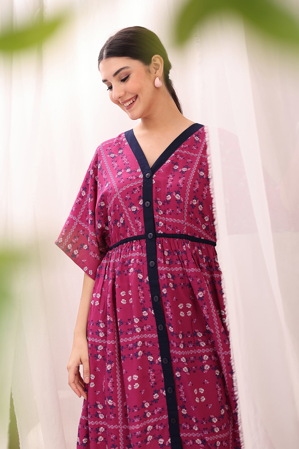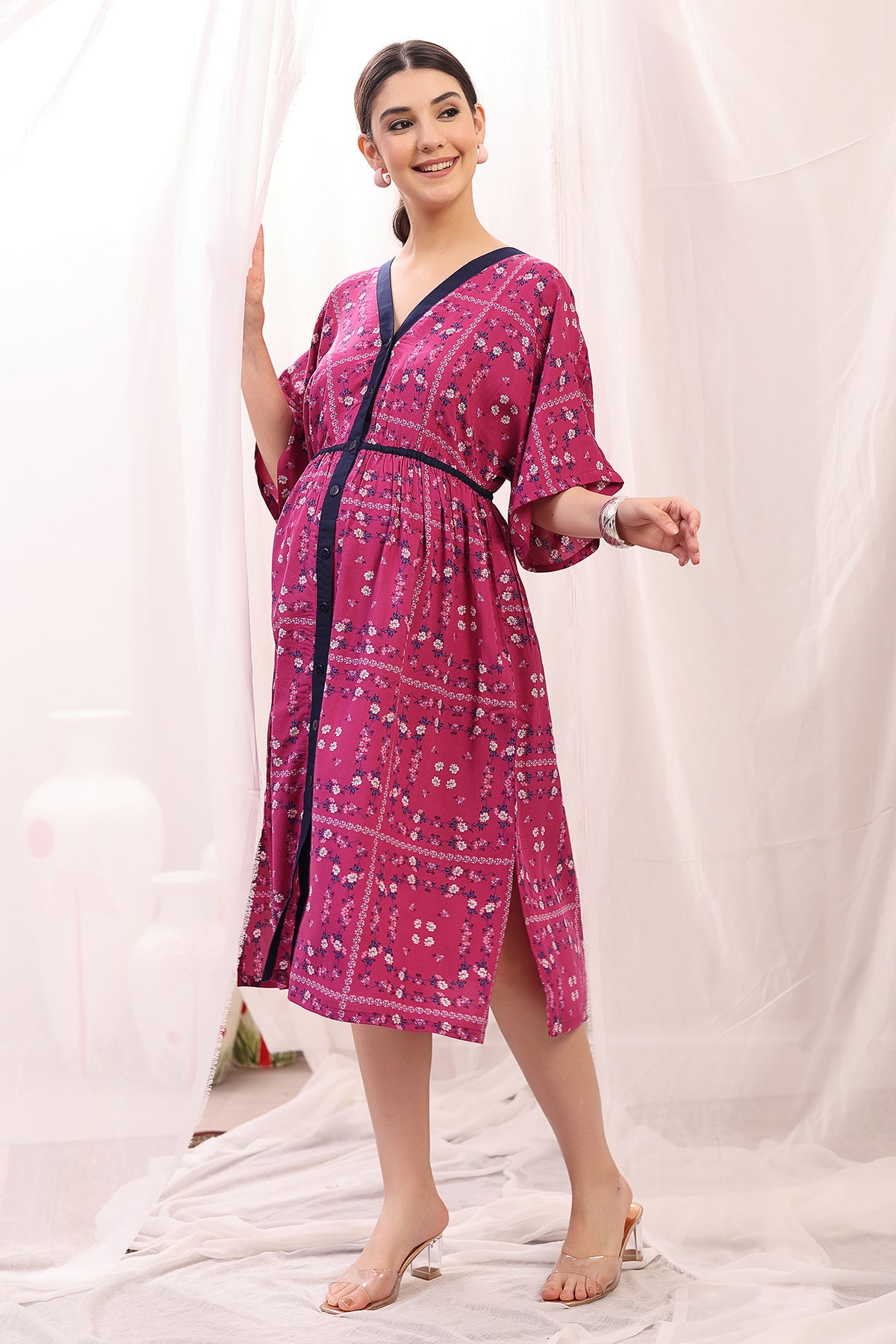 Elevate your maternity wardrobe with our versatile dress, designed for both pregnancy and postpartum. Made from 100% rayon, this stylish piece features a zipless button closure for easy wear, along with functional pockets for added convenience. The beautiful floral print and flattering silhouette make it perfect for any occasion.