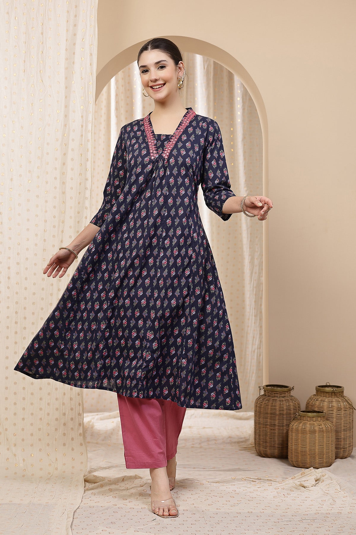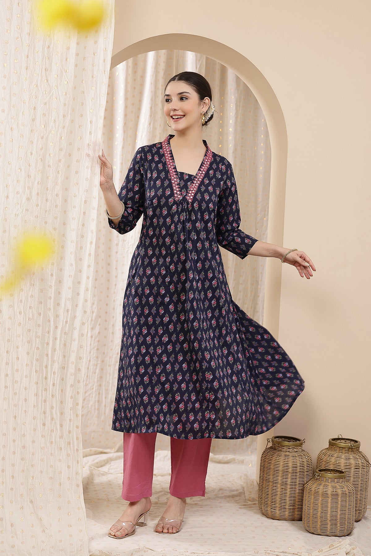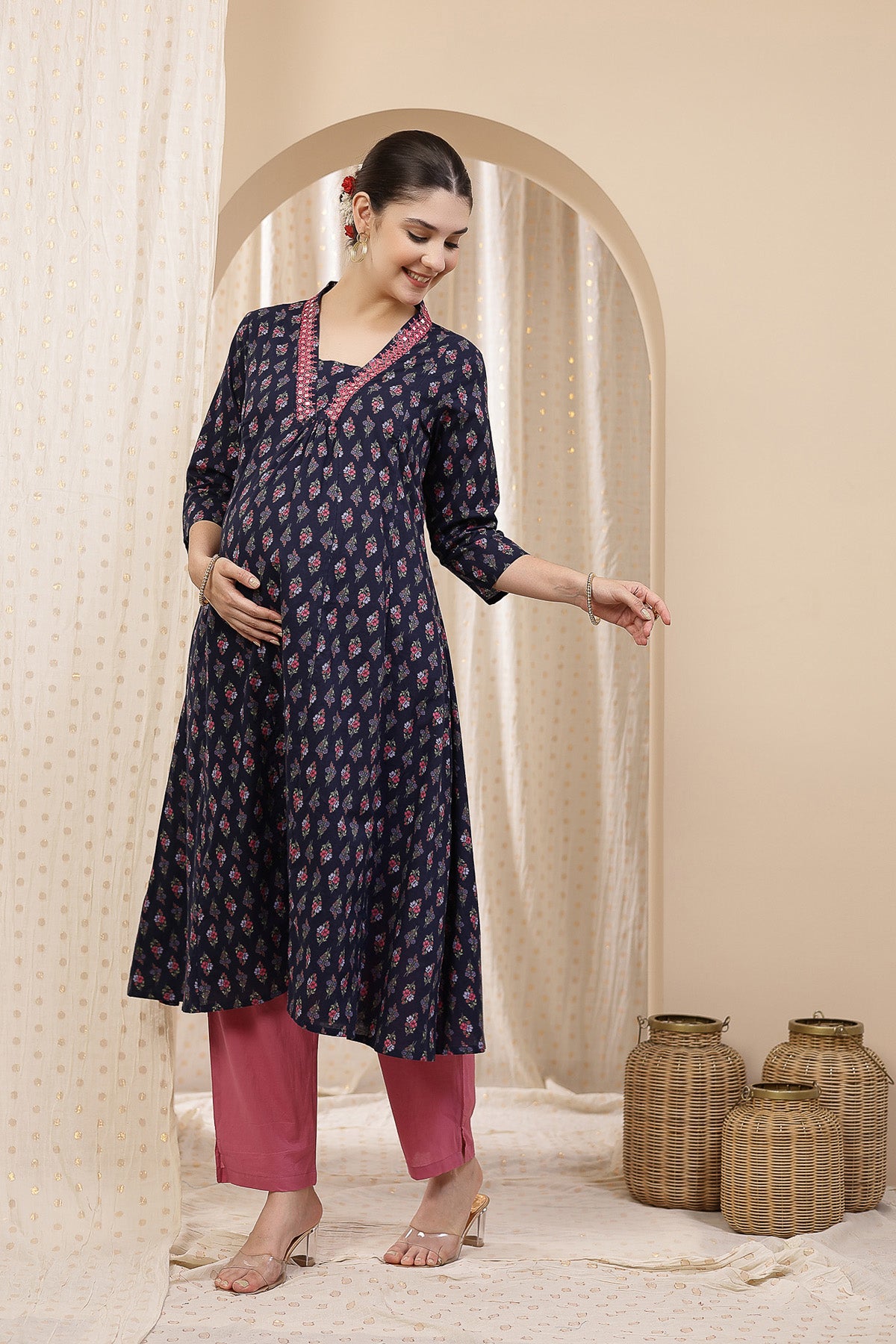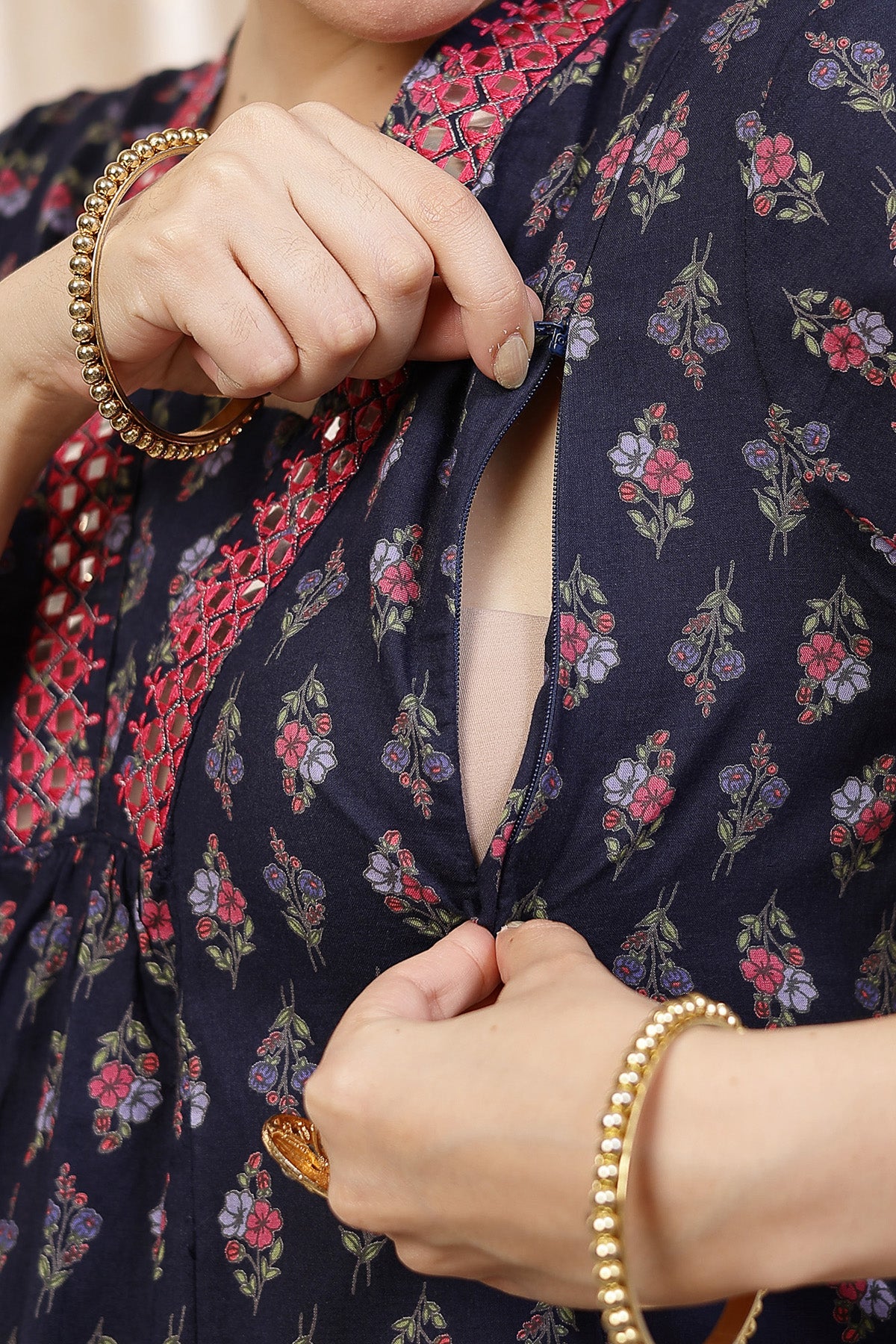 Embroidered Floral Print Cotton Maternity & Nursing Kurta Set - Navy Blue
