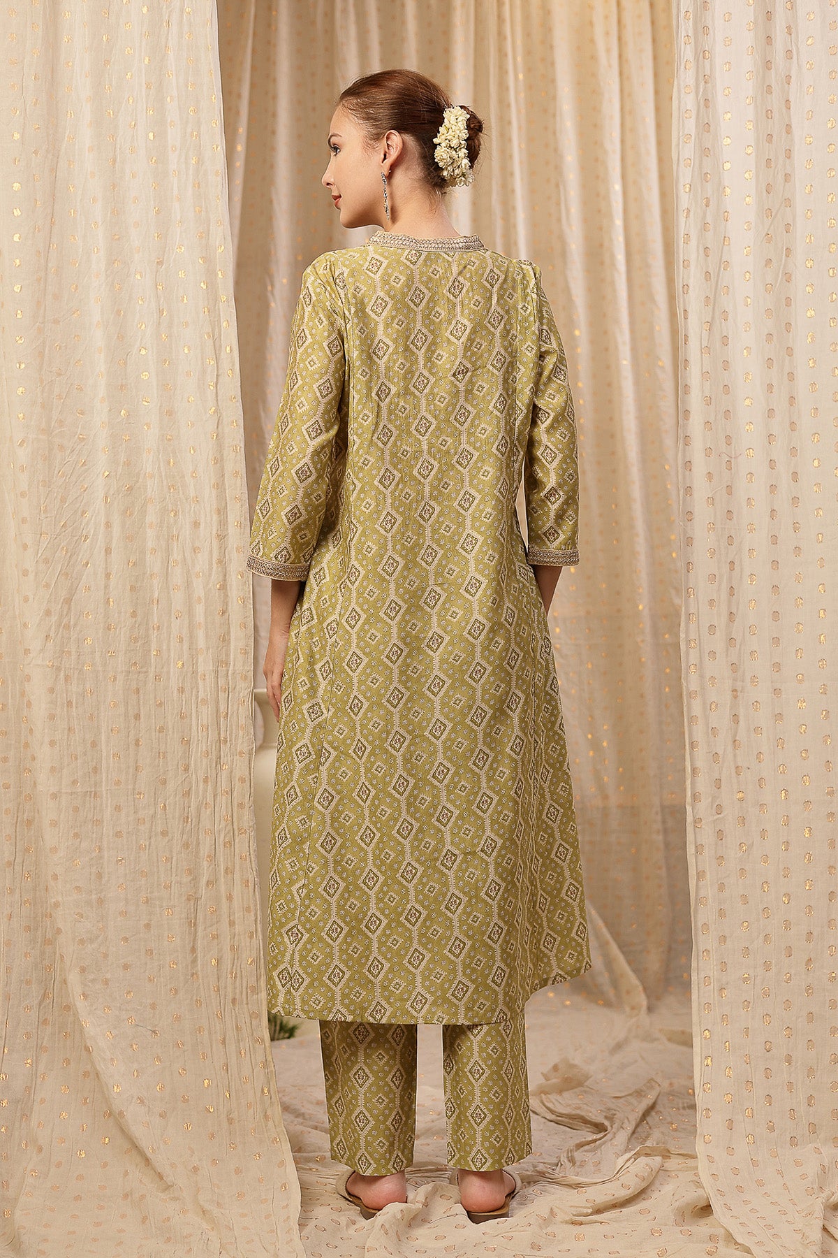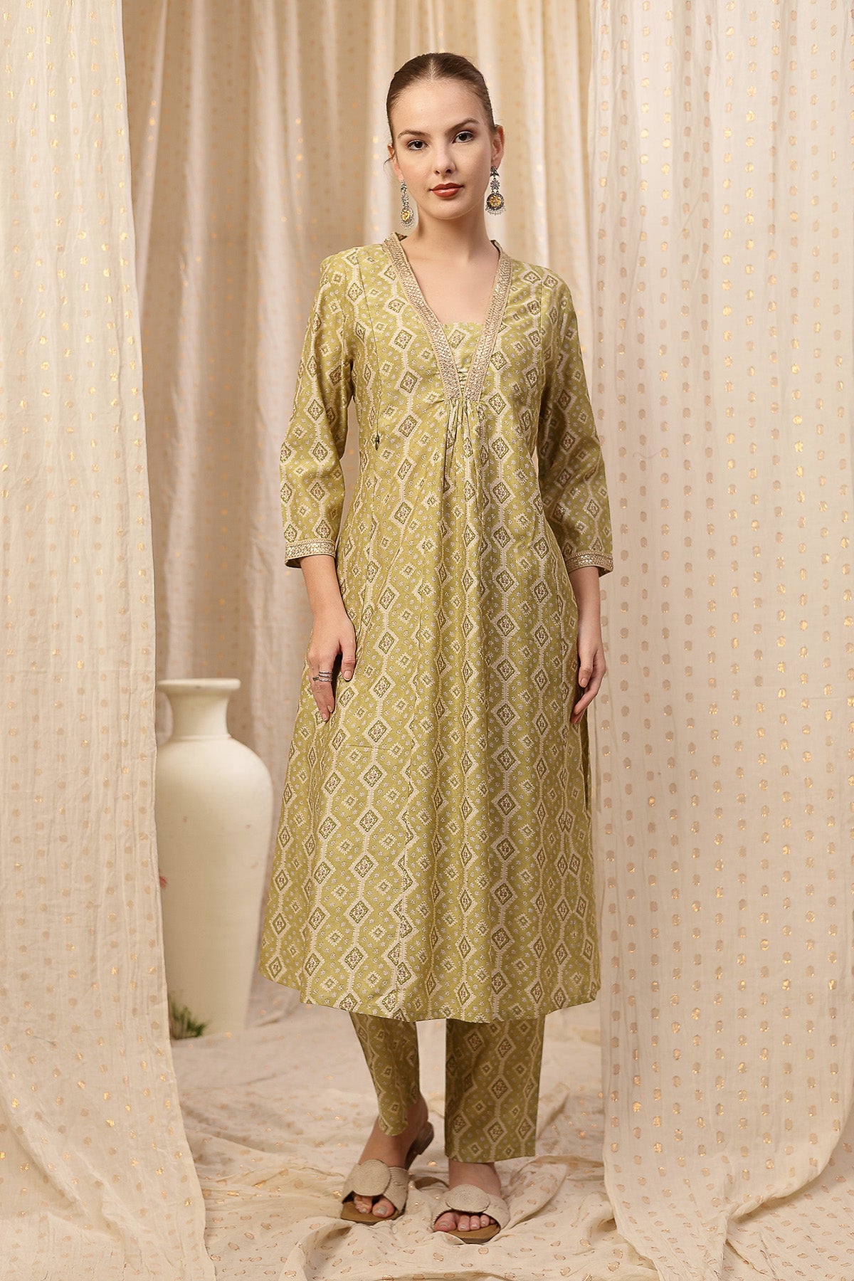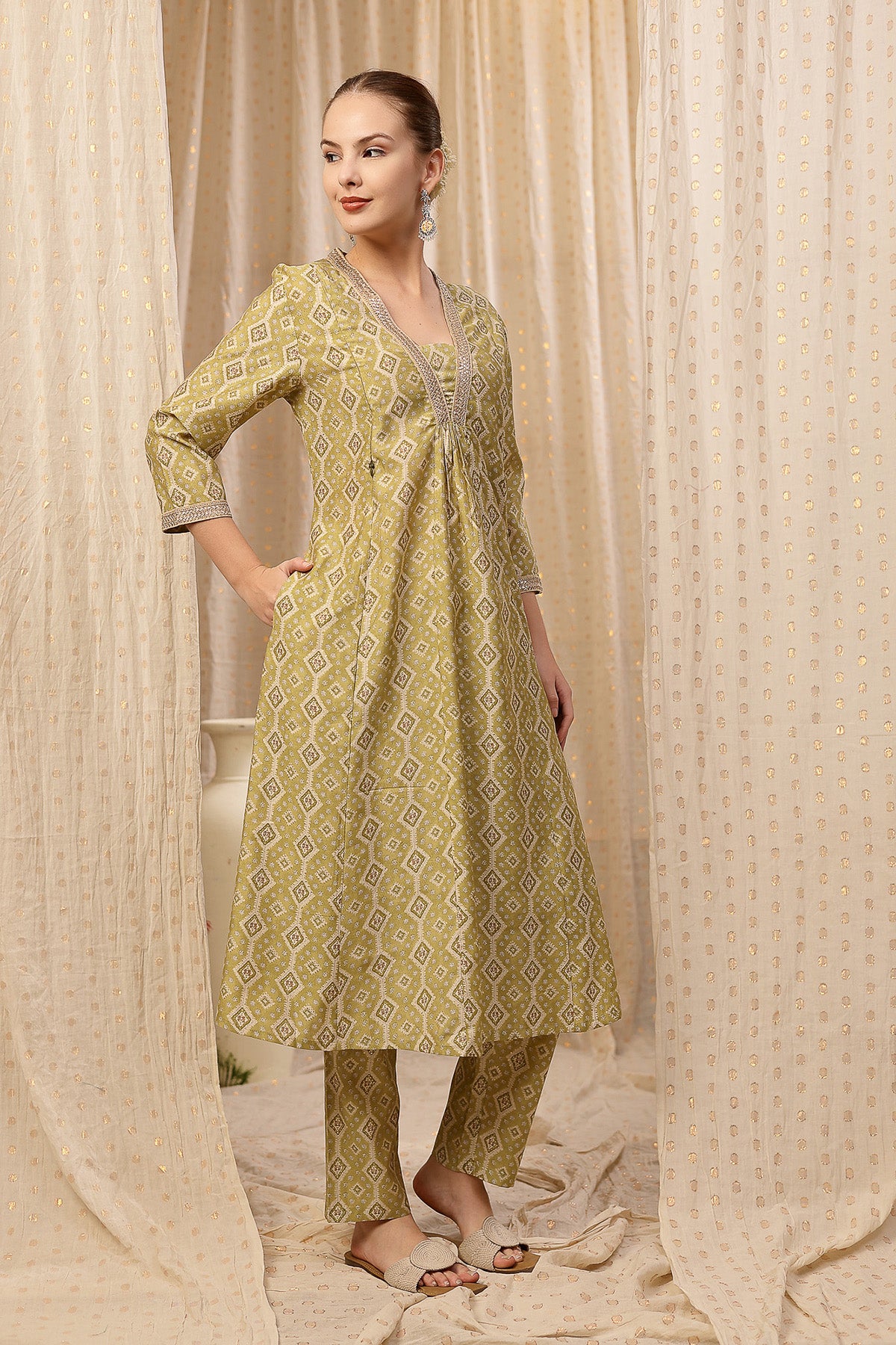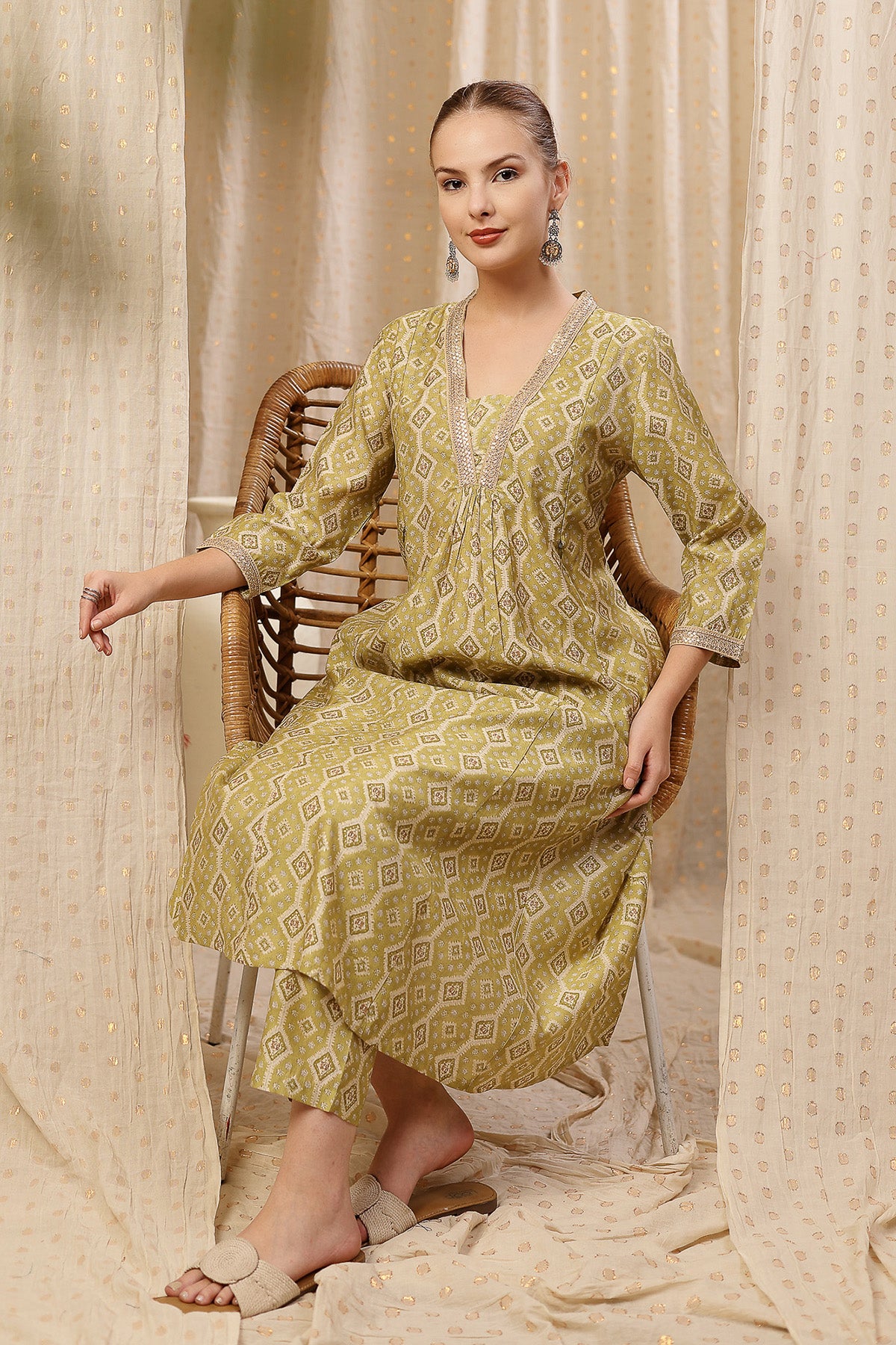 Discover our elegant kurta-pant set, crafted from 100% rayon for a soft and breathable fit. This set features a beautifully designed kurta with a flattering neckline and intricate embroidery that adds a touch of sophistication. With convenient zip feeding access and practical pockets, this outfit is perfect for nursing moms. The serene olive green fabric is adorned with subtle geometric patterns, making it a versatile choice for any occasion during your maternity journey.
