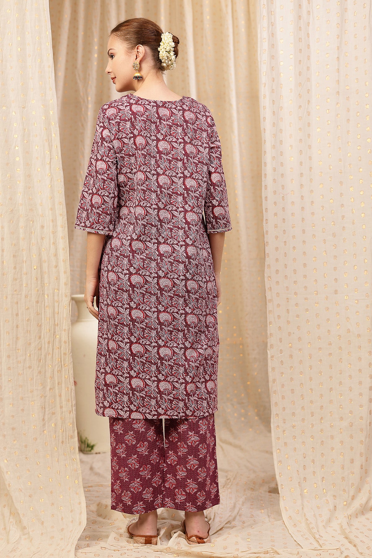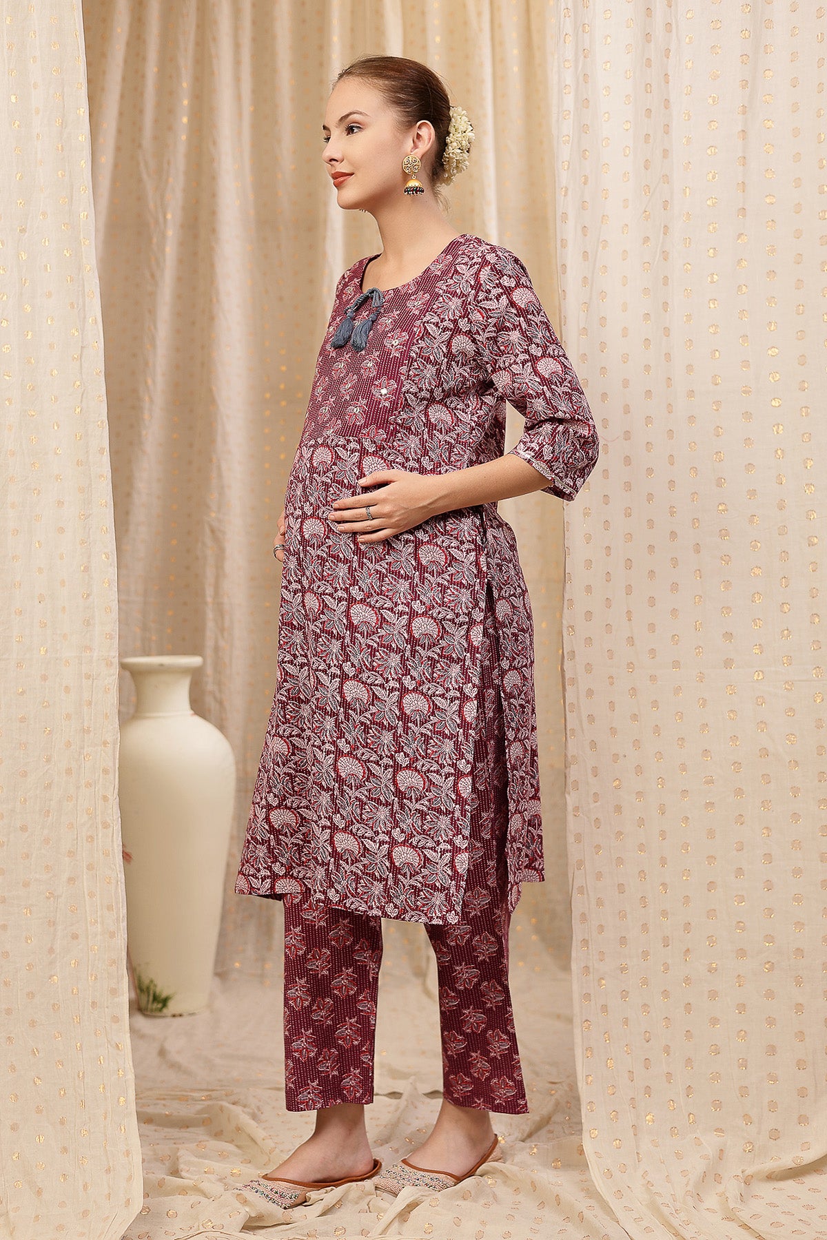 Floral Printed Zip Feeding Cotton Kurta-Pant Set - Purple