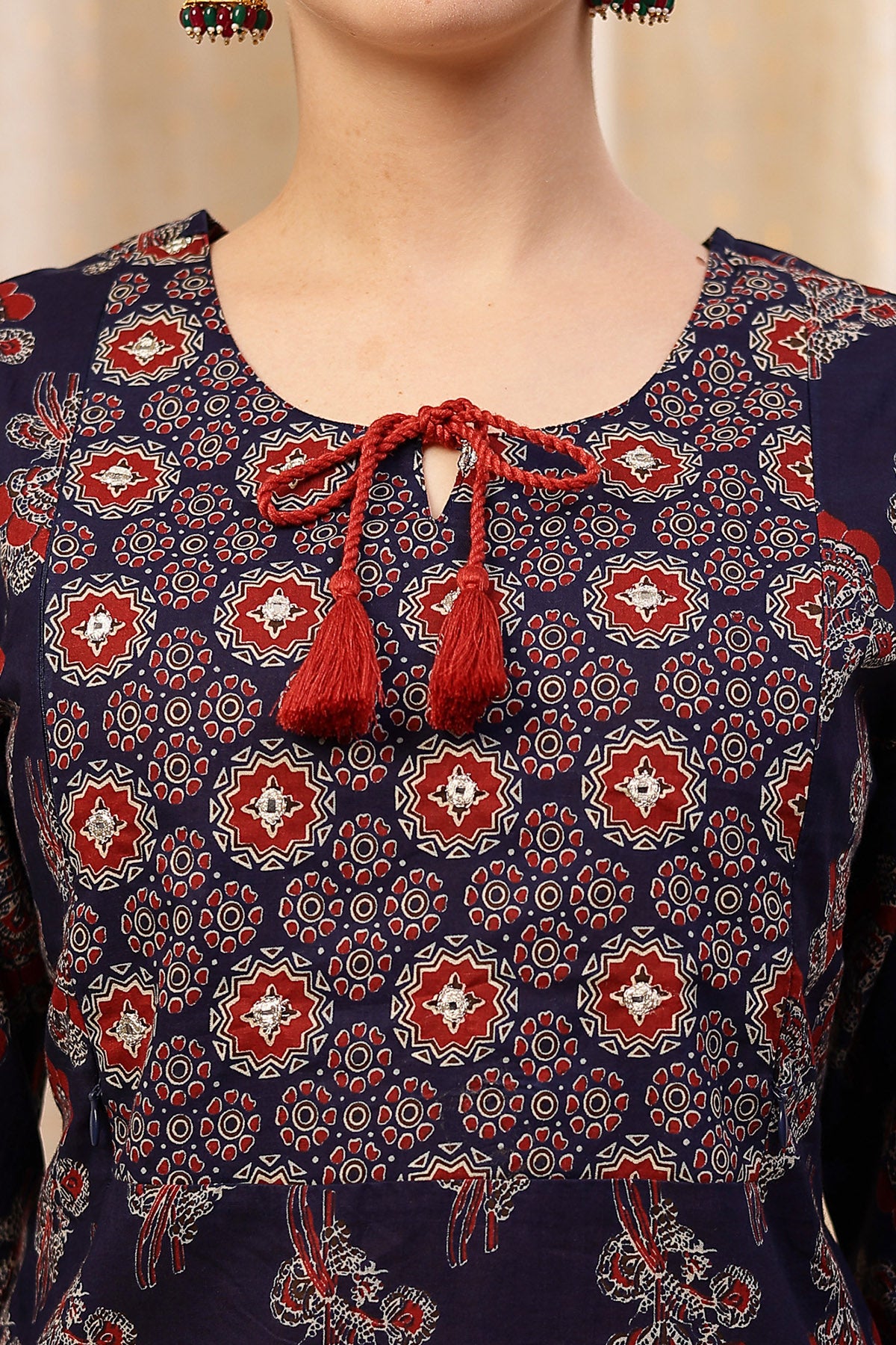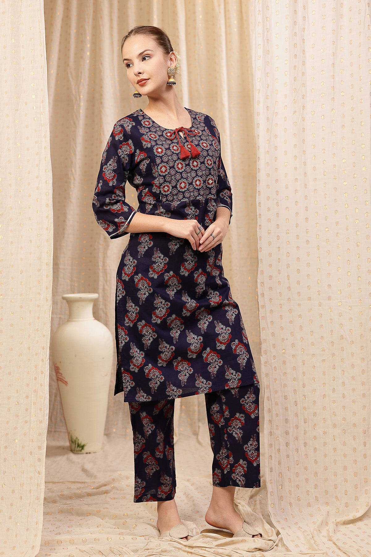 Floral Zip Feeding Cotton Kurta-Pant Set - Navy Blue