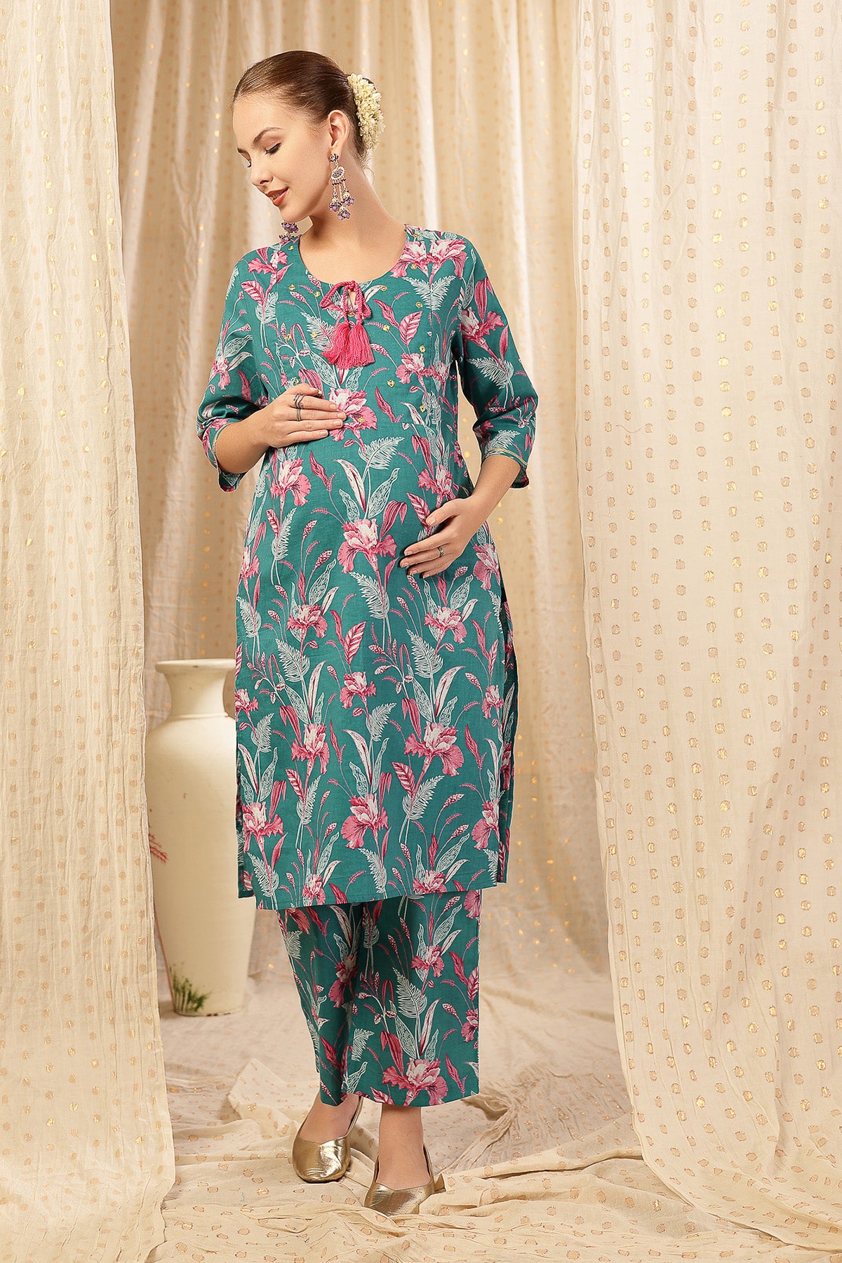 Floral Zip Feeding Cotton Kurta-Pant Set - Teal Green