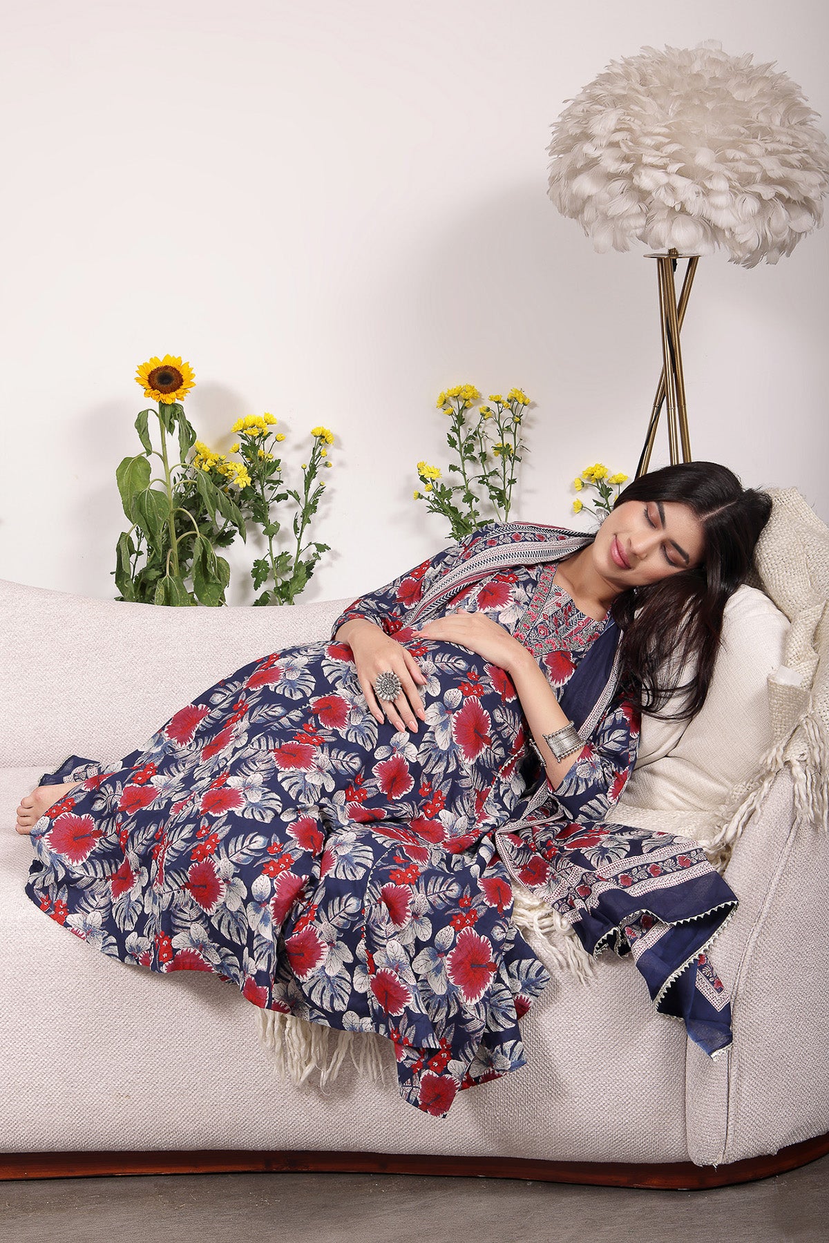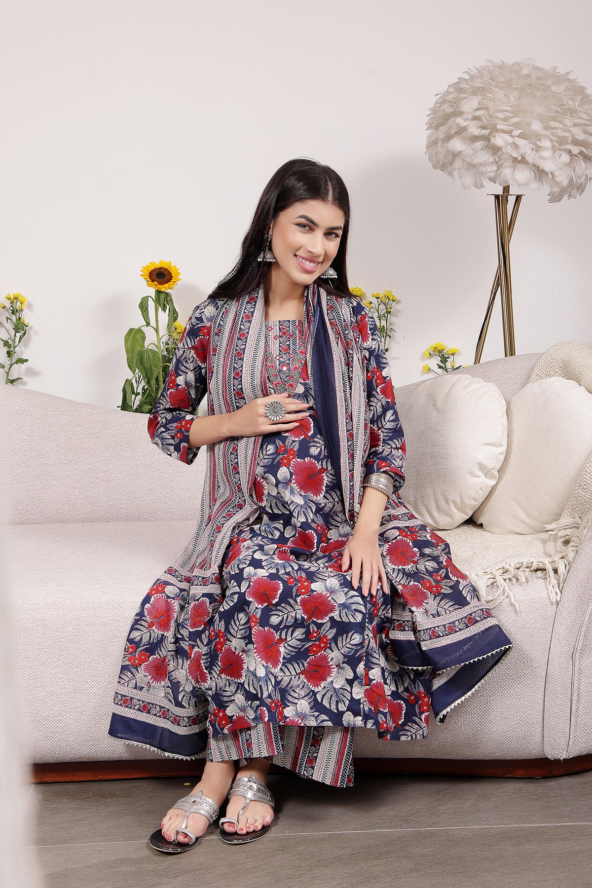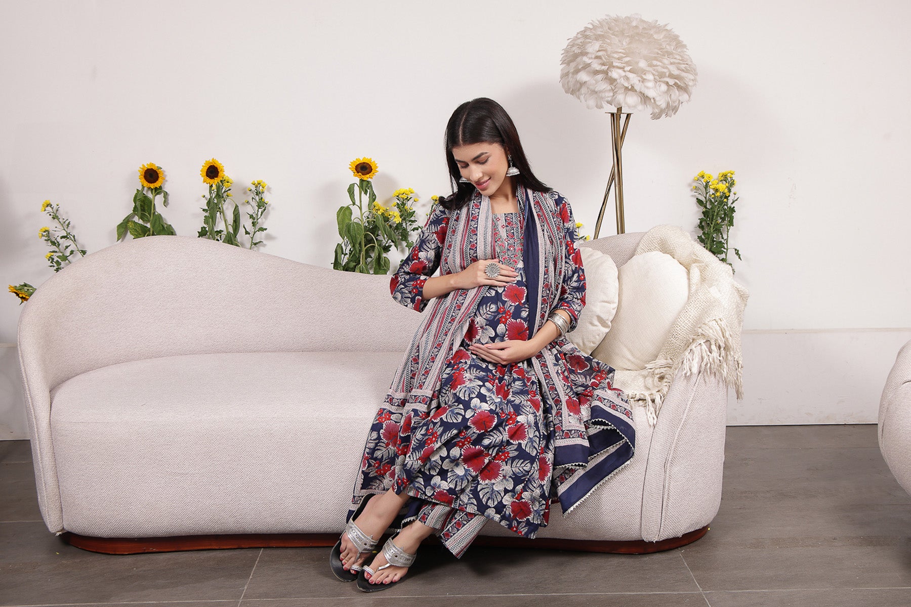 Pair this graceful kurta set with statement earrings and block heels for a chic ethnic look, or keep it minimal with flats for everyday elegance. Its flattering silhouette and soothing print make it a go-to outfit for expecting and new moms who want comfort without compromising on style.