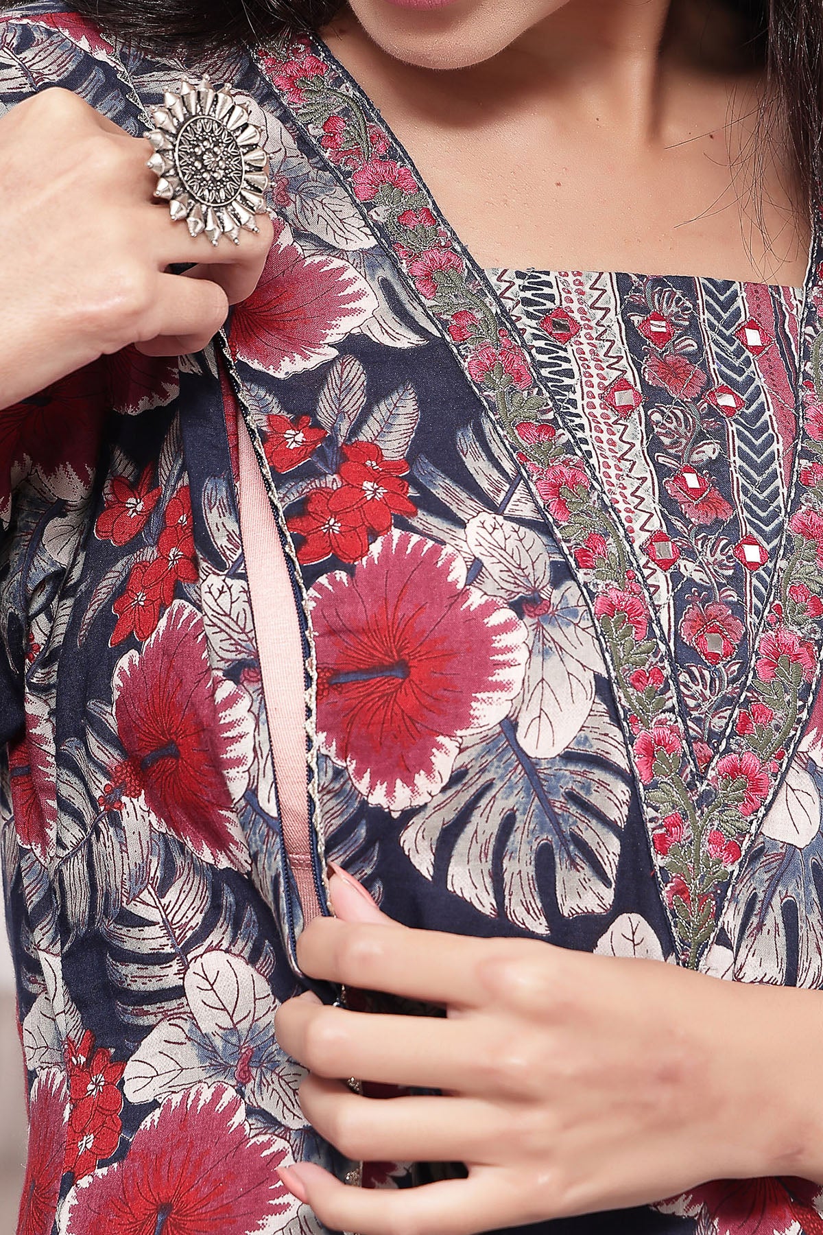 Stay effortlessly stylish through pregnancy and beyond with this 100% cotton kurta set. Designed for comfort and versatility, it features concealed zips for easy nursing access, handy pockets, and a flattering silhouette. The soft floral print and lace detailing add a graceful charm, while the breathable fabric ensures all-day comfort. Perfect for casual outings or relaxed festive wear.