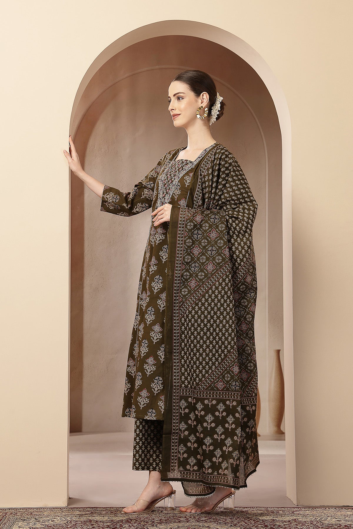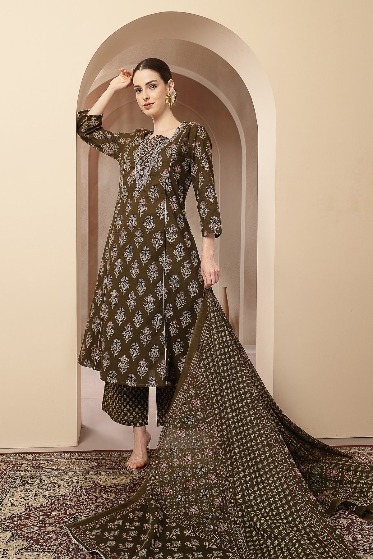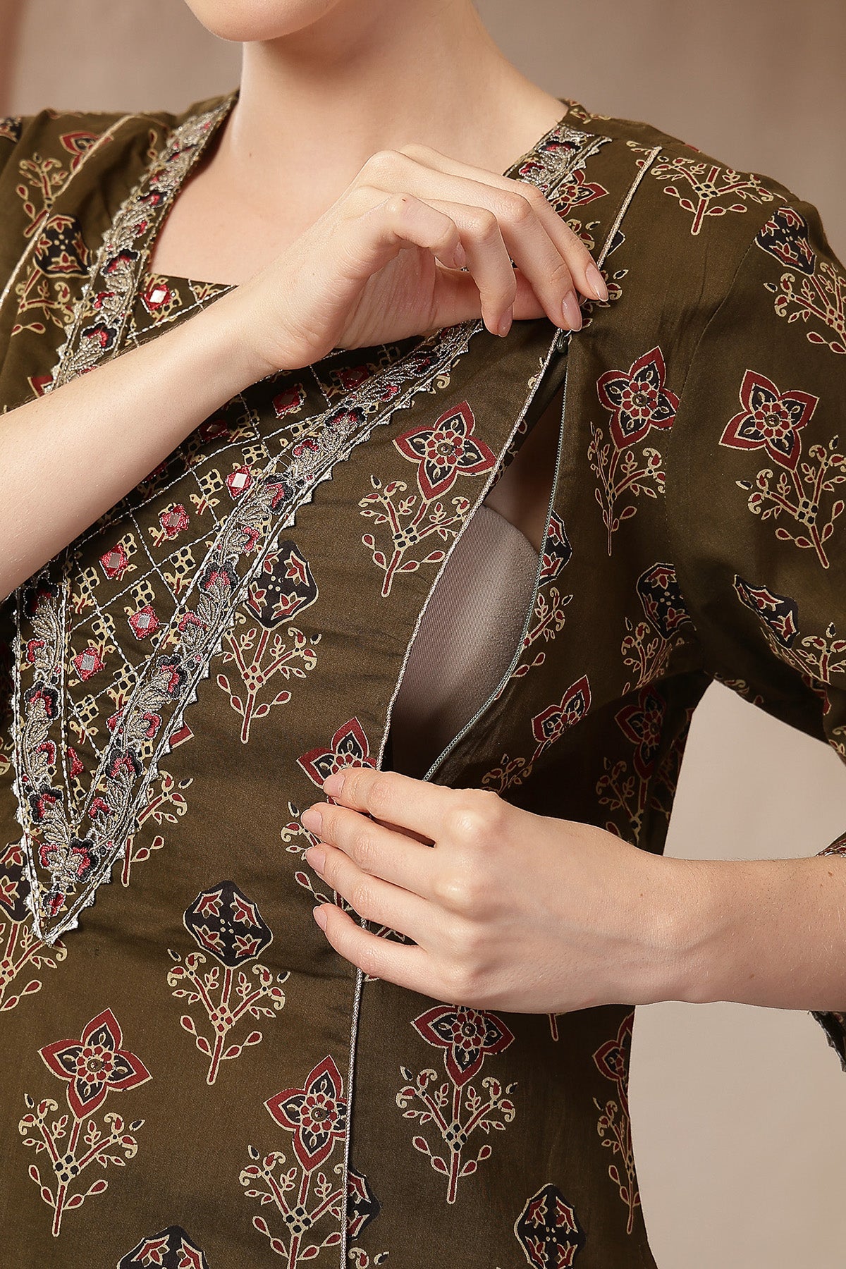 Olive Green 100% Cotton Concealed Zip Feeding Maternity Kurta Set with Dupatta