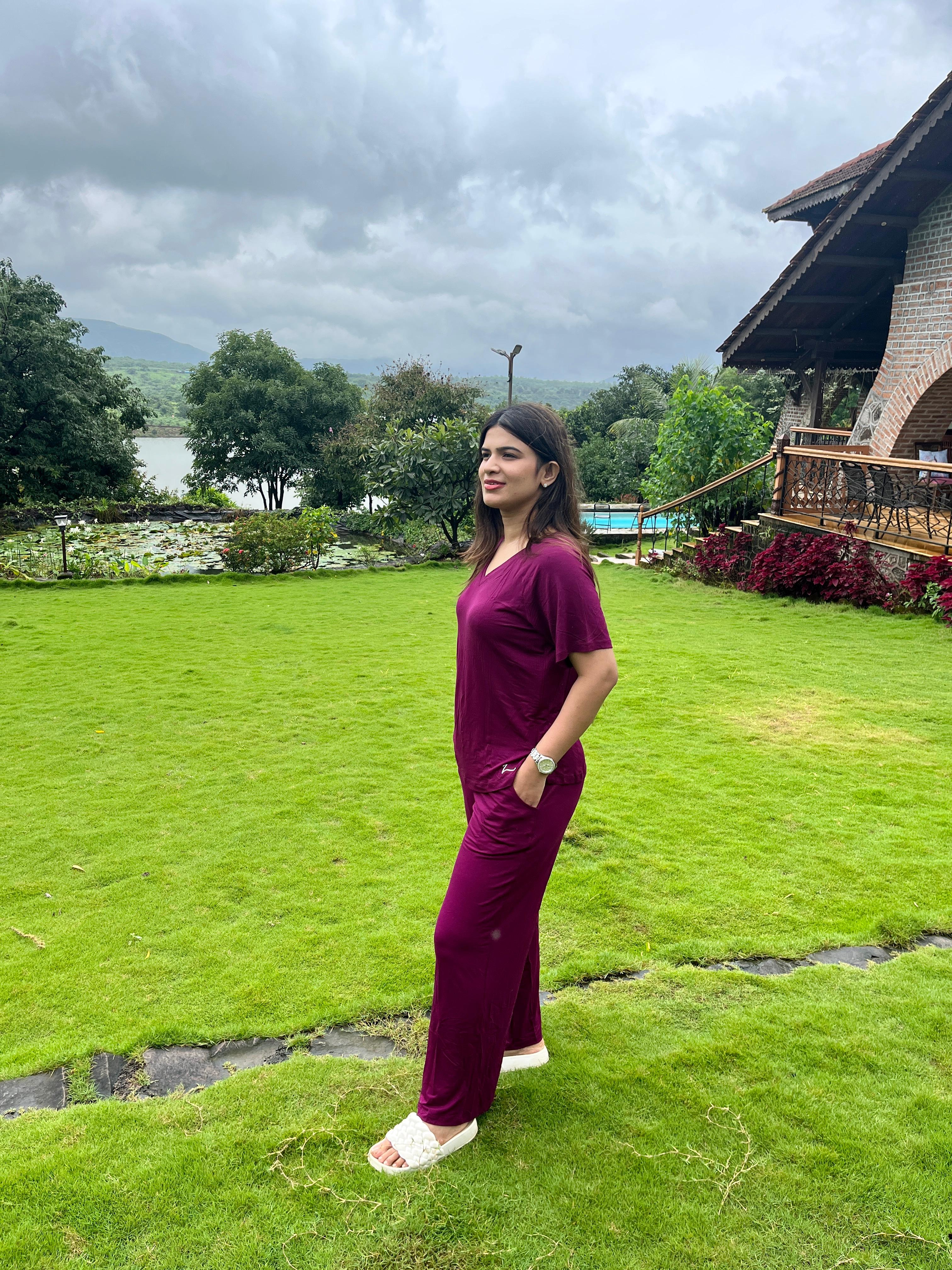 Our maternity Pajama and V-neck nursing top set is perfect for pregnancy and postpartum. The nursing top has discreet side zips for easy breastfeeding access, while the Pajamas offer a comfortable fit with two full-size pockets. Made from 95% viscose and 5% elastane, both pieces feature 4-way stretch fabric for superior comfort and flexibility. The lightweight, bio-washed twisted yarn feels soft on the skin and prevents lint. Super recovery elastane helps the garments retain their shape, and color lock technology ensures no fading after multiple washes. This set is designed for lasting comfort and style throughout your motherhood