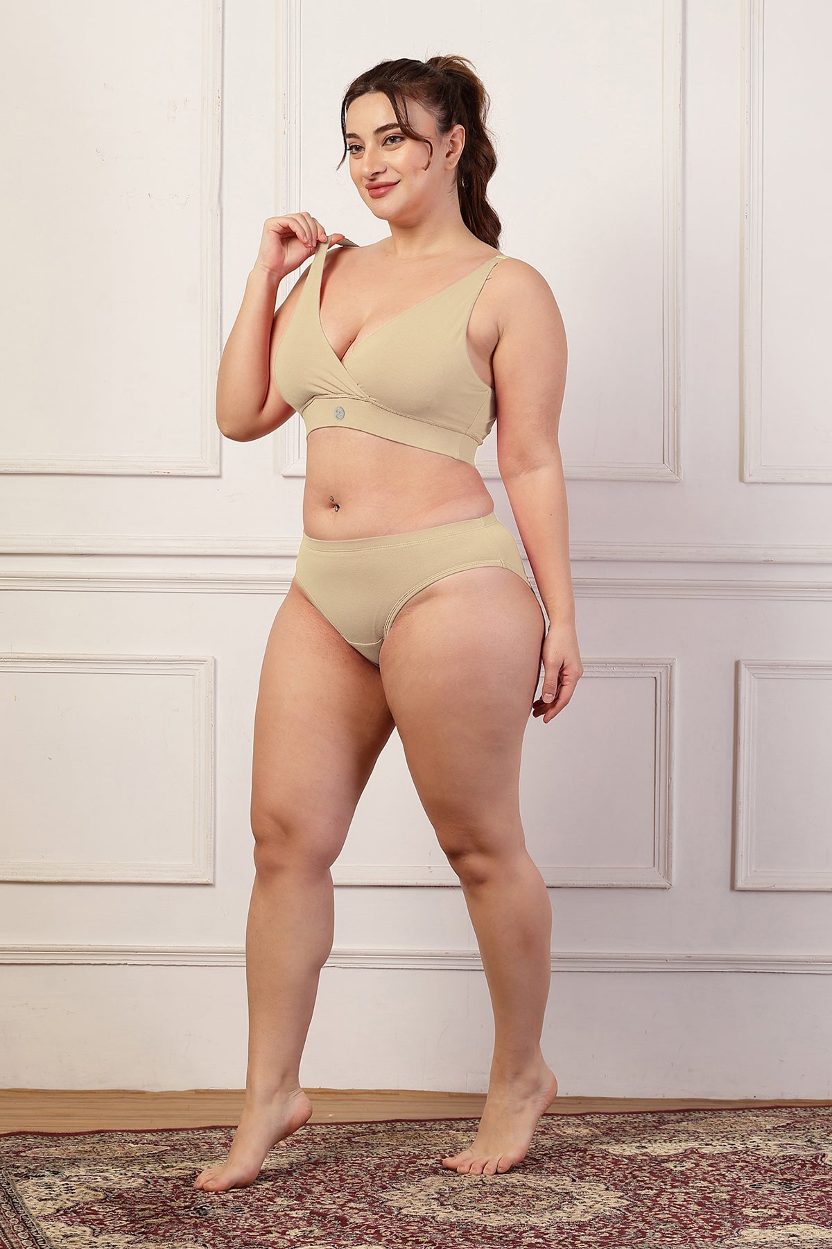 Our proprietary fabric blends 90% cotton and 10% elastane using 220–240 GSM cotton has been processed with double shots of bio wash, making it thicker, sturdier, and softer. We also use TENCEL™ Modal, known for its eco-friendly, sustainably sourced fibers. A perfectly designed V neck bra gives access to breastfeeding easily and comfortably.
