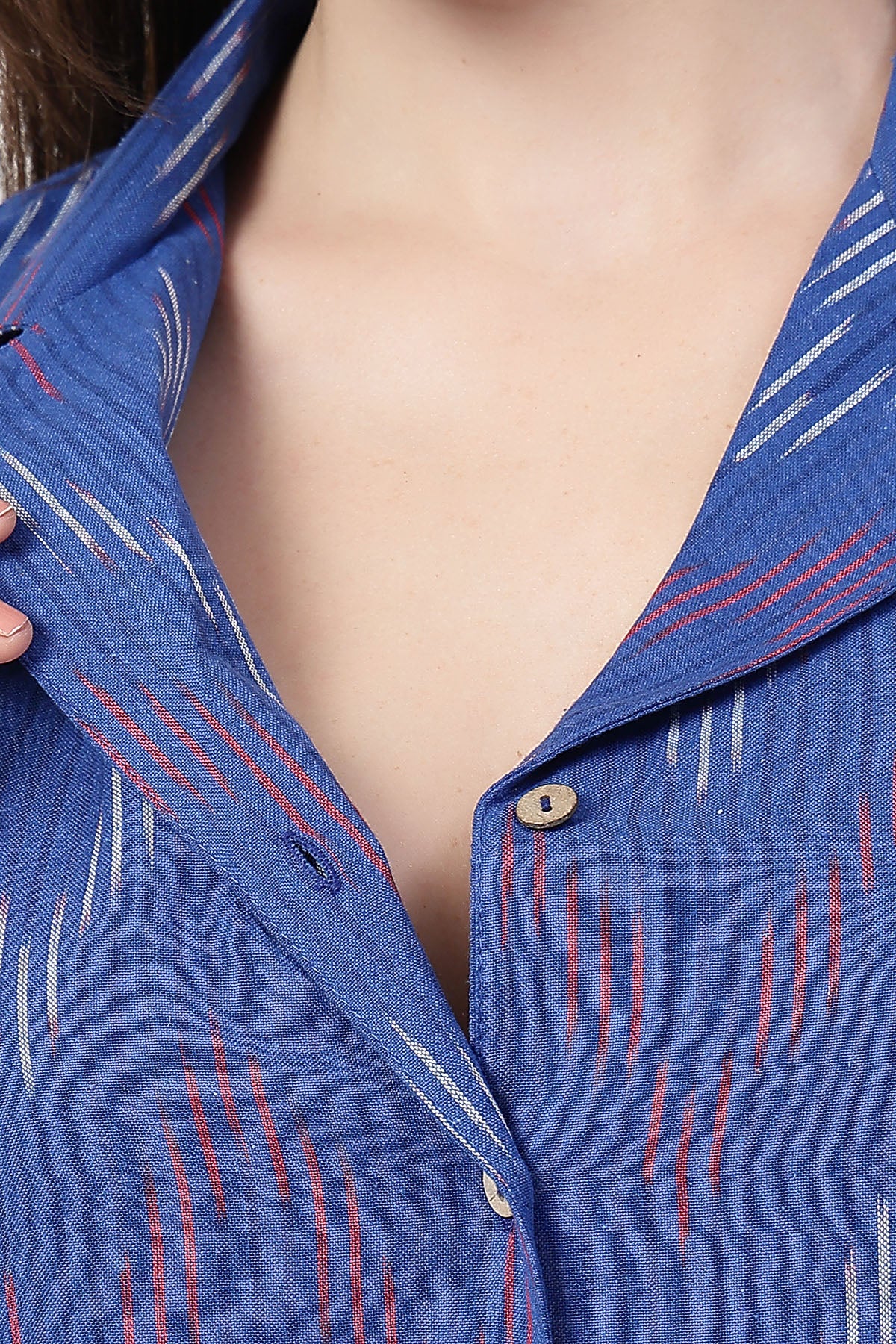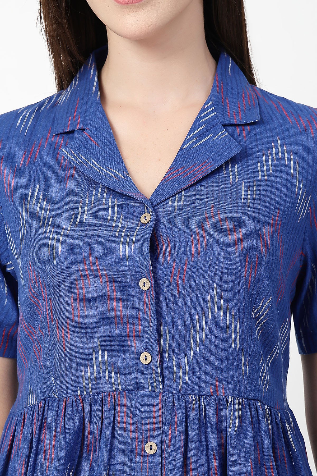 Made from breathable yarn-dyed Ikat cotton, this piece is as easy to wear as it is to style. From its lapel collar and relaxed midi cut to the super-practical button-down front for feeding access — every detail is there to make your life simpler (and more stylish).