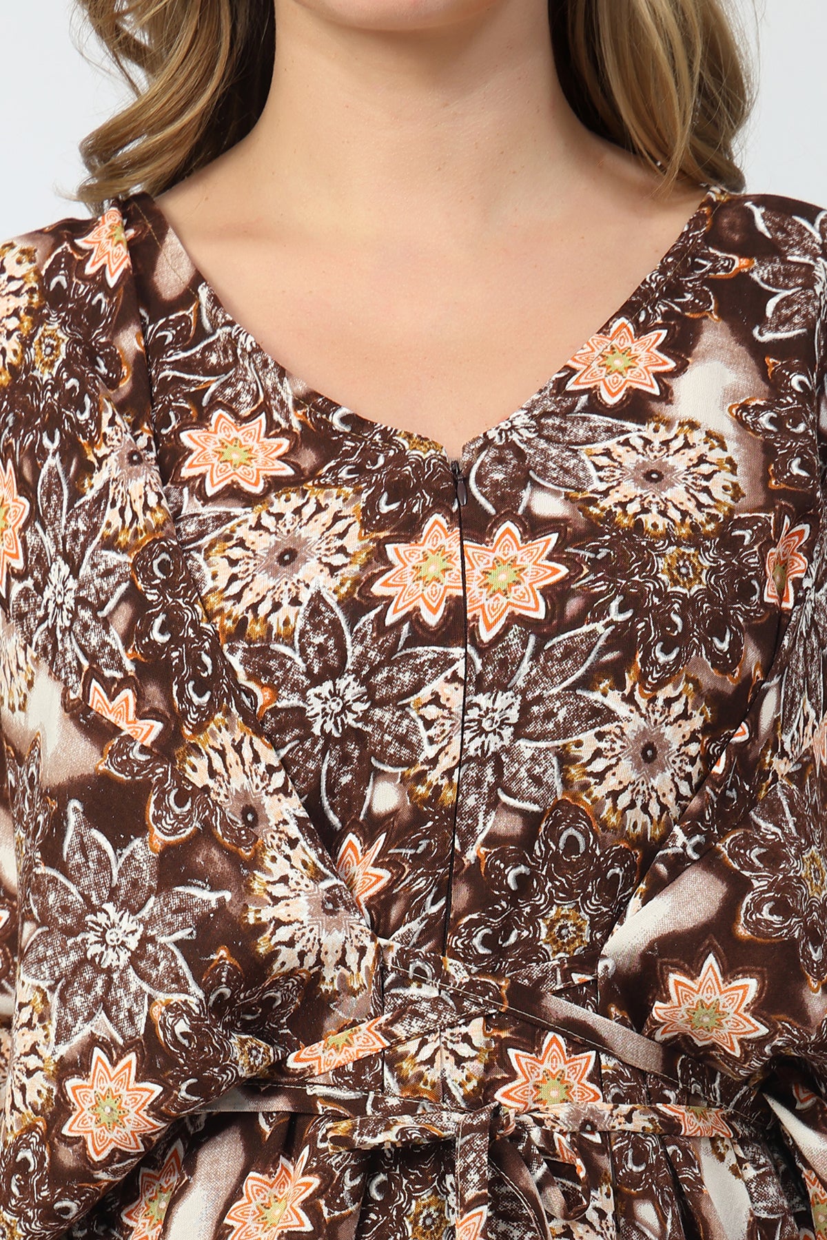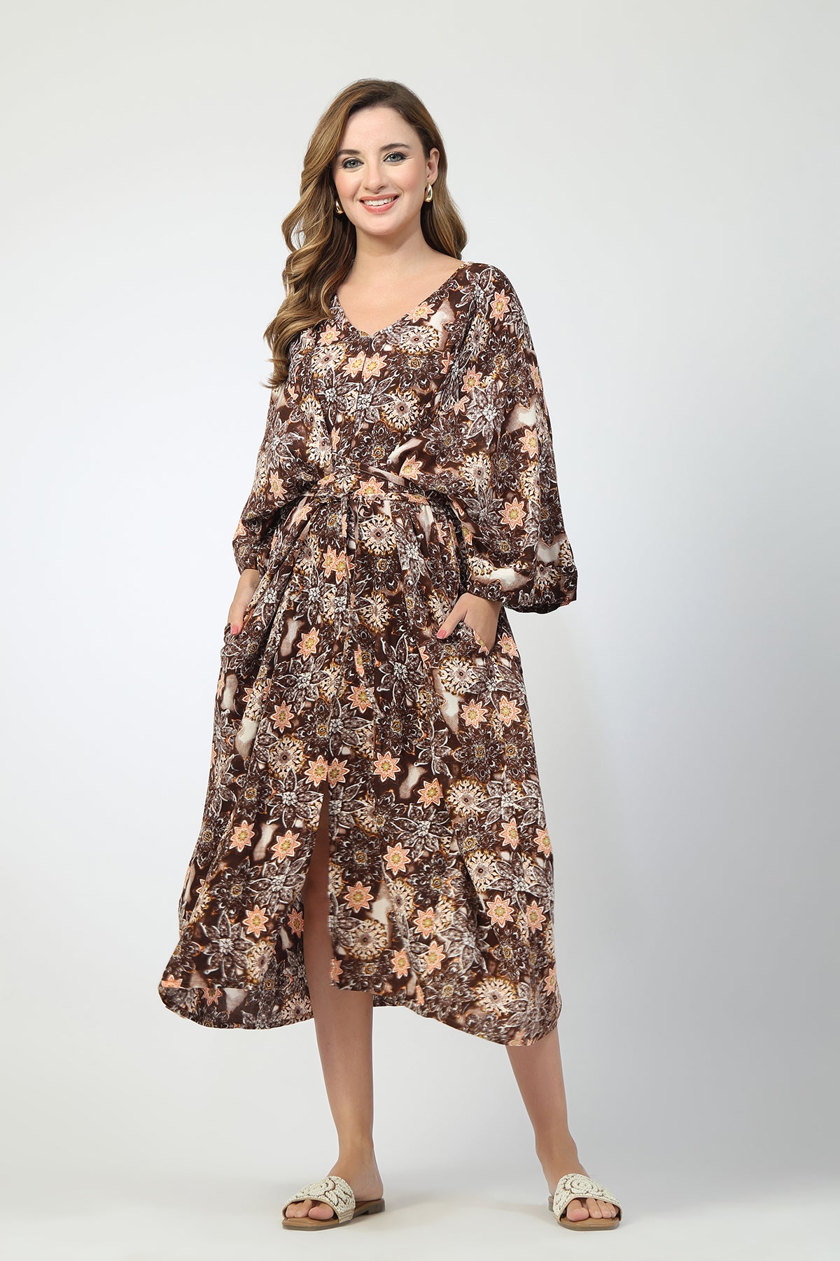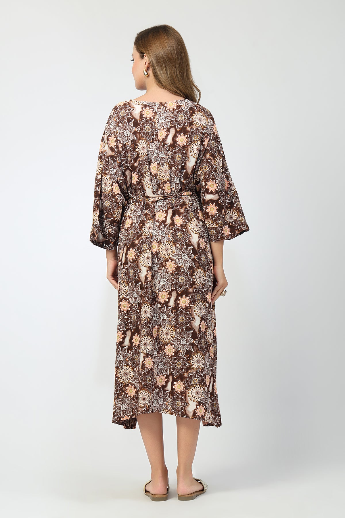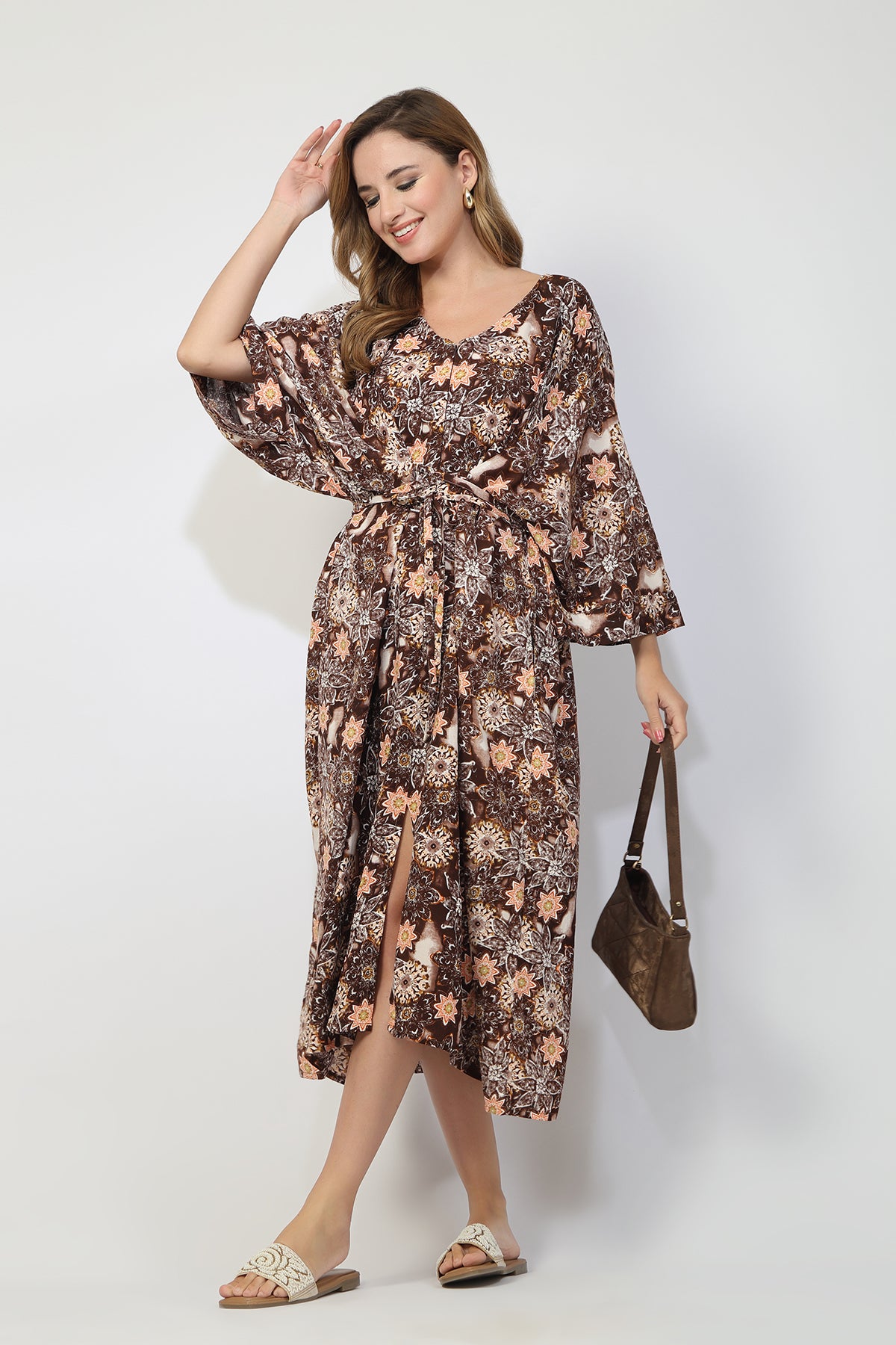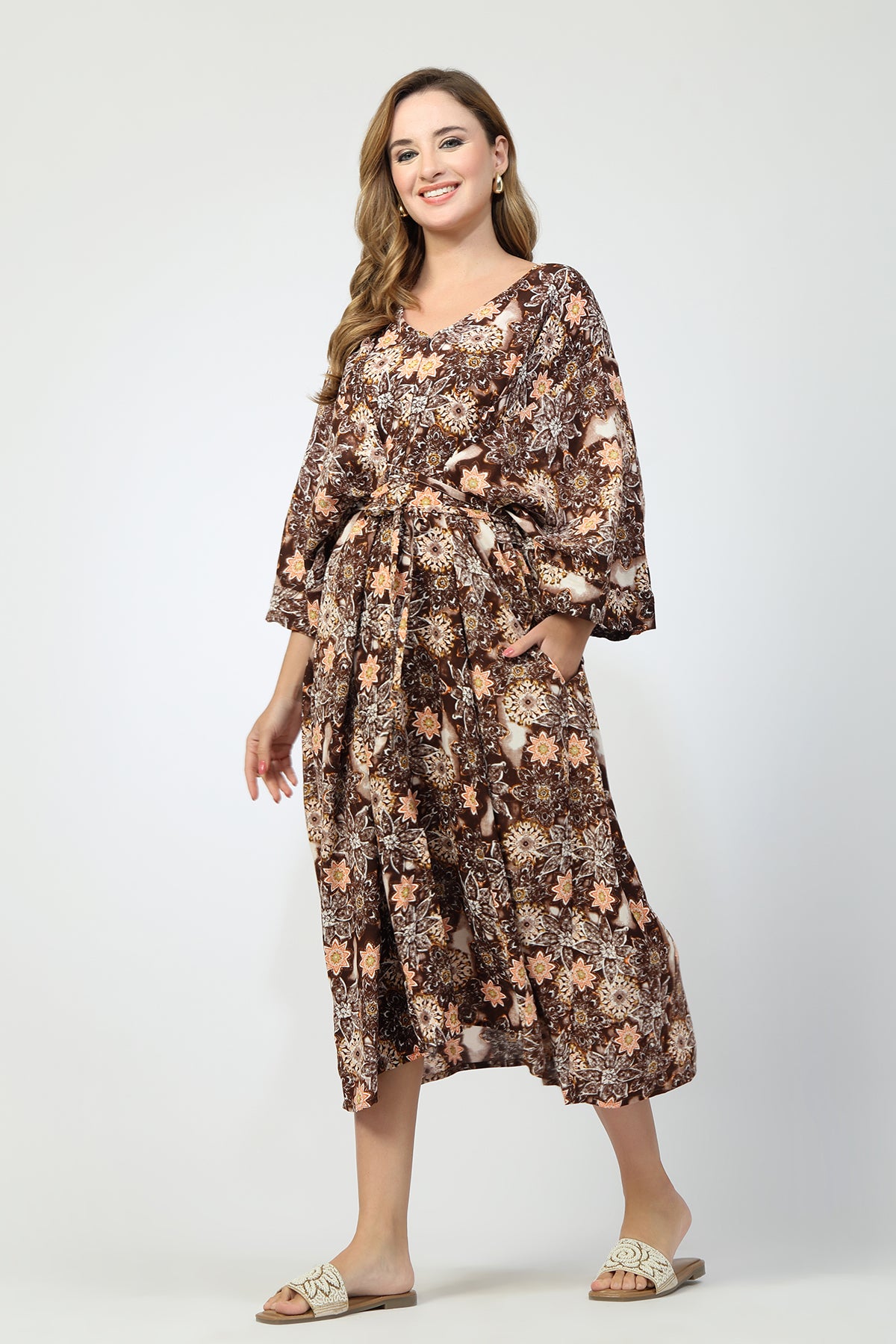 The 3/4th sleeves provide comfortable coverage while keeping the kaftan airy and wearable across seasons.