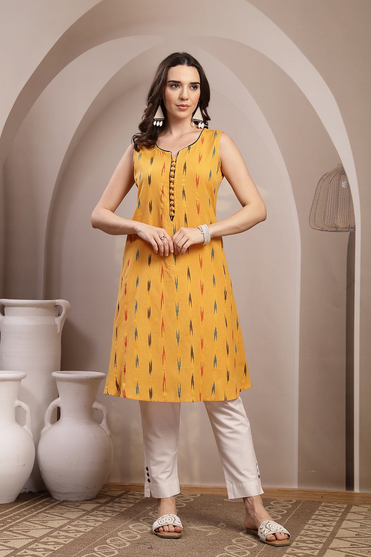Crafted from soft, breathable 100% cotton, this Ikat Round Neck Cut Sleeves Maternity Kurta is thoughtfully designed to deliver effortless comfort and functionality throughout pregnancy and postpartum. The sleeveless silhouette keeps the look light and airy, while the front button closure allows convenient nursing access. Featuring timeless Ikat detailing and a relaxed knee-length structure, this kurta blends traditional design with modern maternity comfort for easy everyday wear.