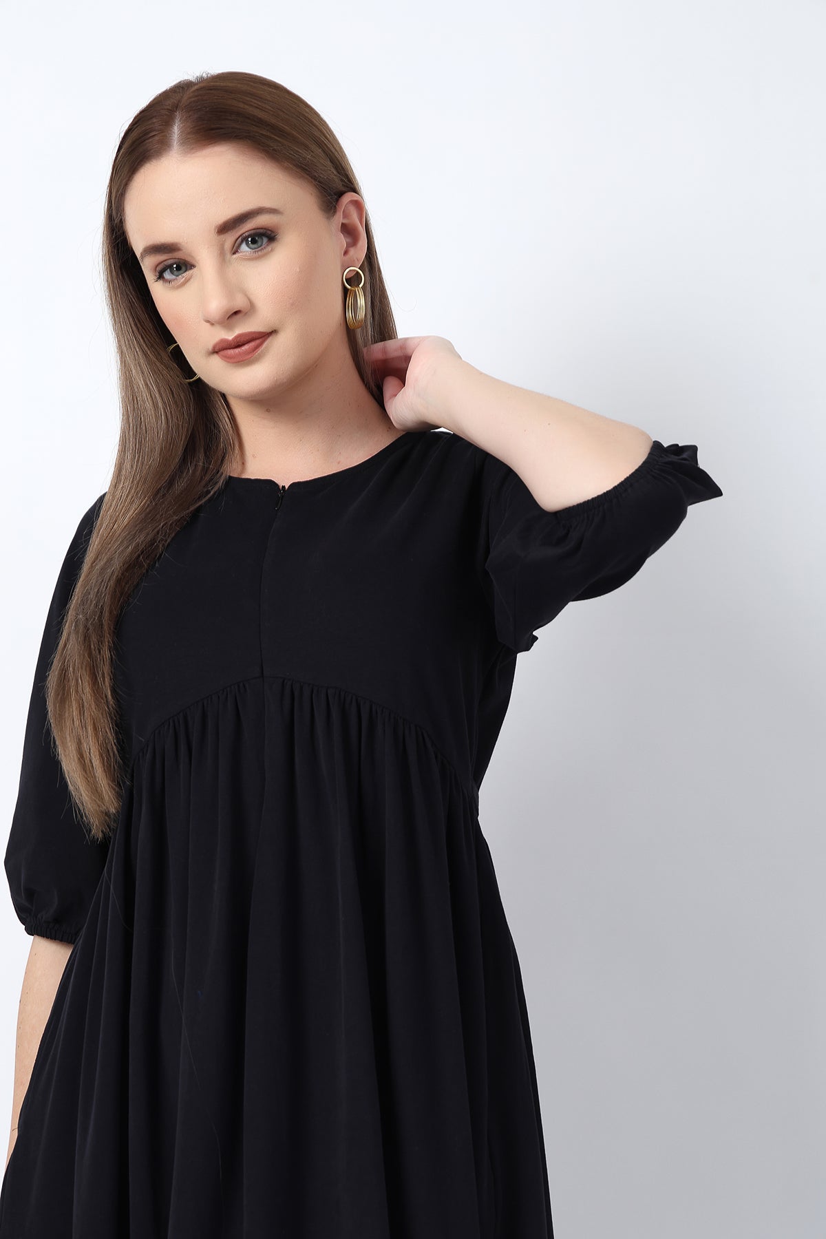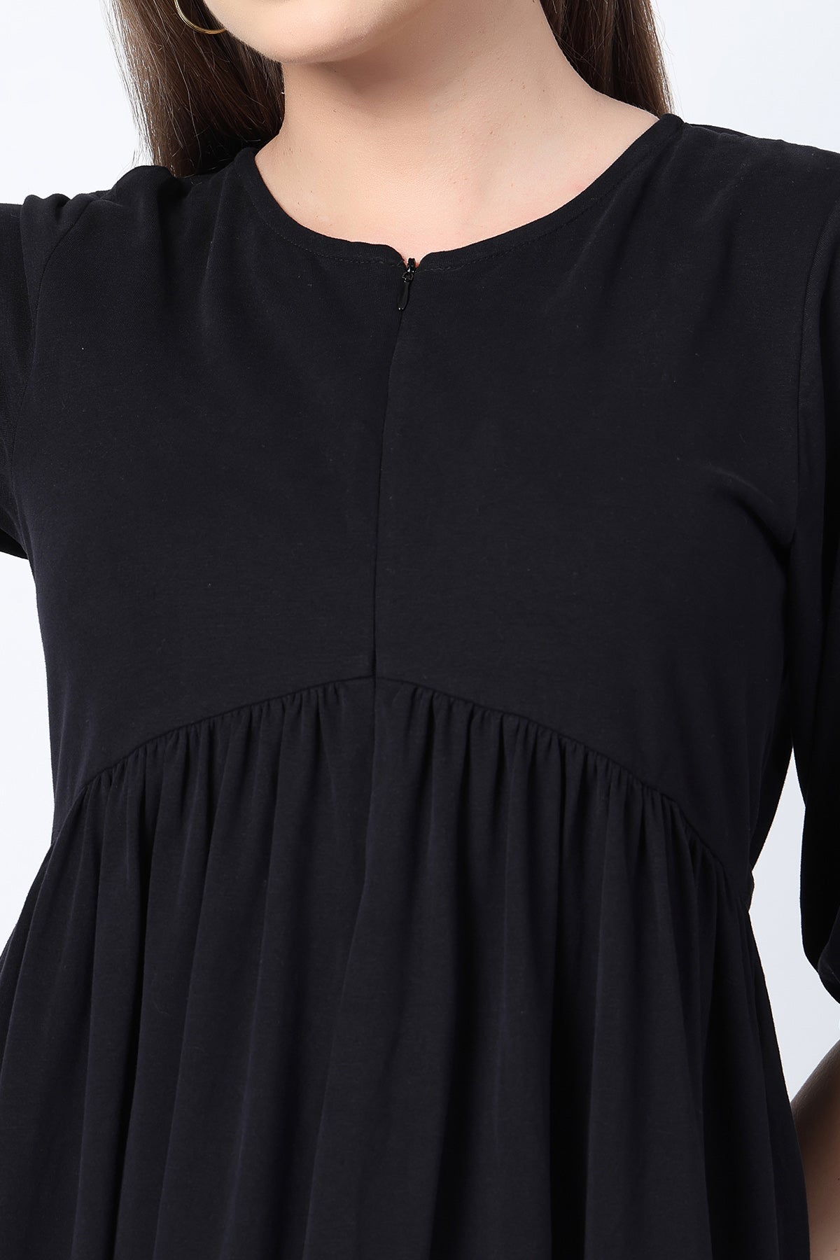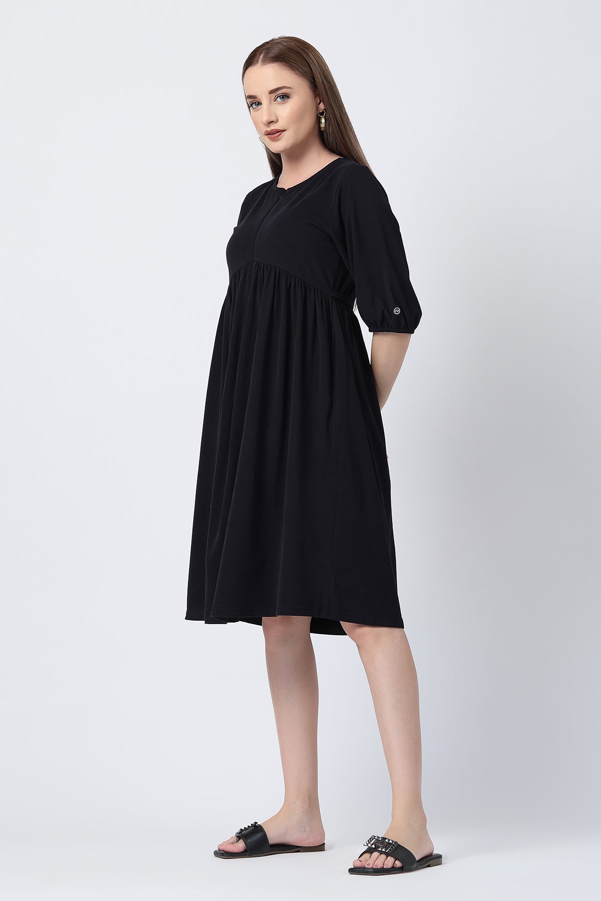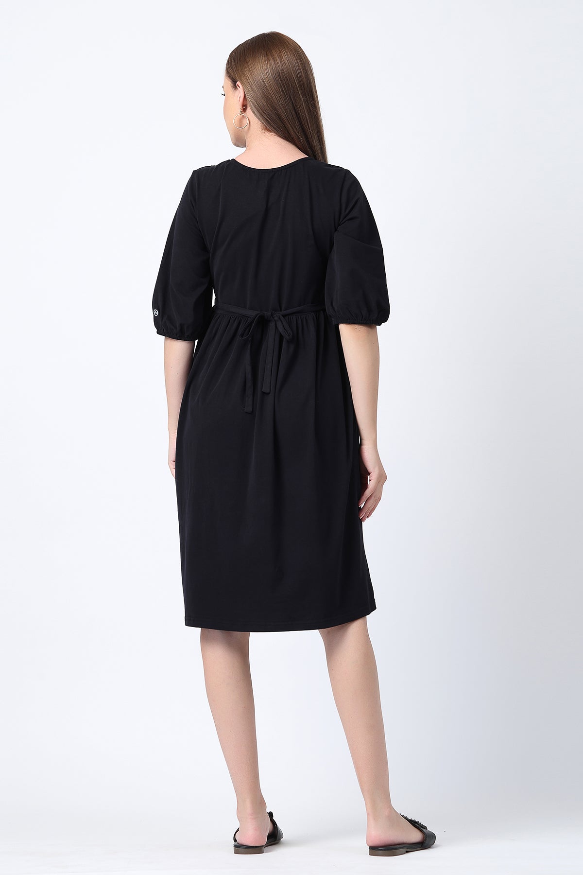 Maternity & Nursing Knee-Length Cotton Dress with Pocket - Black