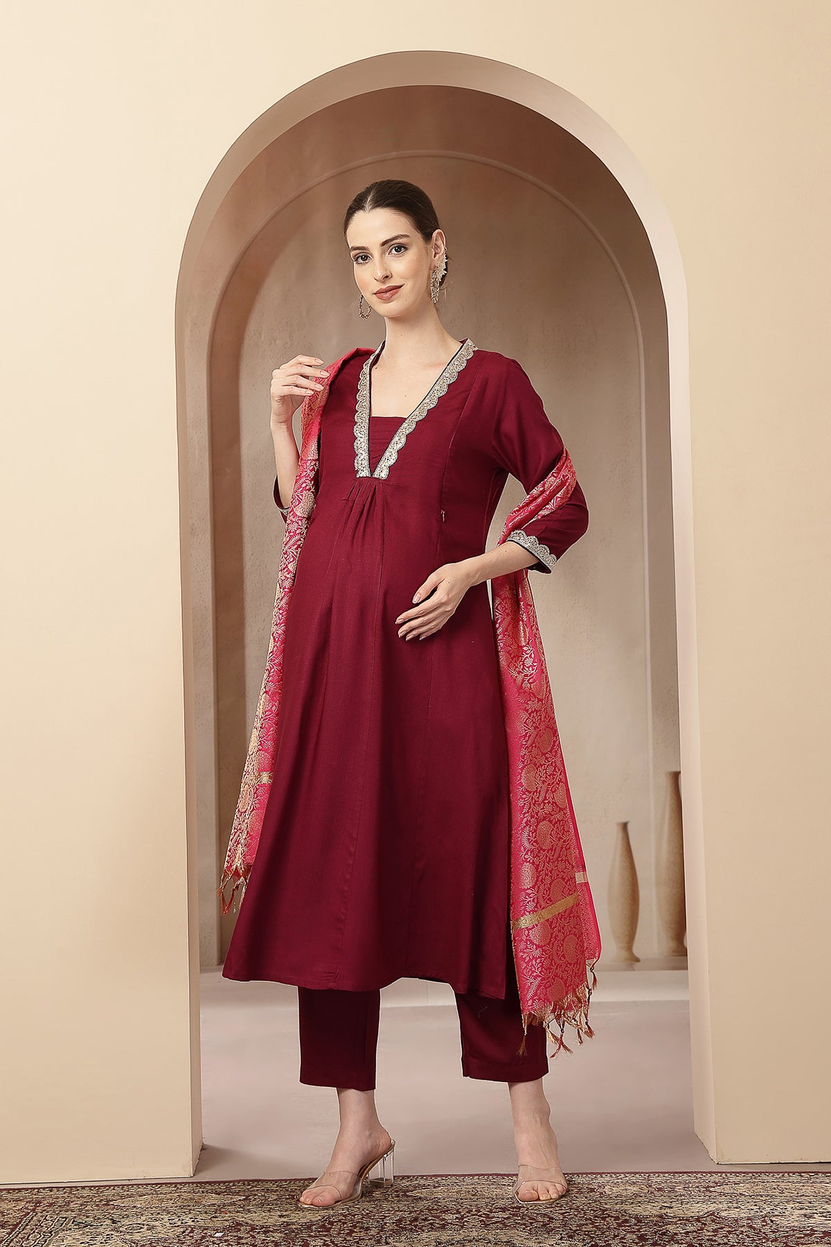 Experience effortless elegance and comfort in this beautifully designed maternity kurta set, made from 100% rayon fabric that feels soft and breathable against the skin. Thoughtfully crafted with concealed side zips for easy nursing access and functional pockets for convenience, it’s perfect for every stage of motherhood. The delicate detailing along the neckline adds a hint of sophistication, making it suitable for festive occasions, get-togethers, or simply a day out in comfort and style.