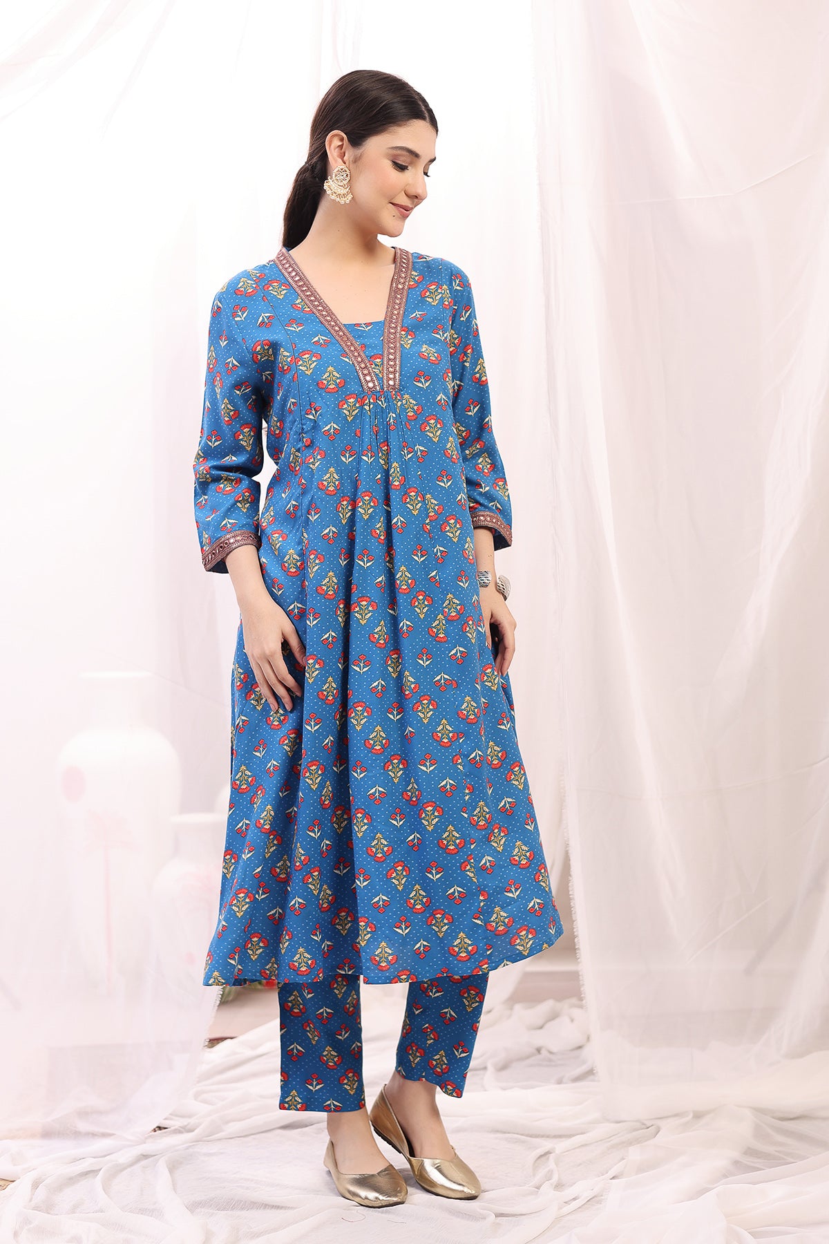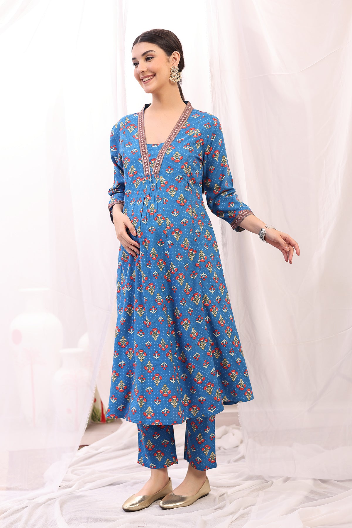 This kurta-pant set is perfect for casual outings or festive occasions. Pair it with traditional juttis for a complete look, and enjoy the comfort and elegance it brings to your wardrobe. The flowing silhouette ensures room for your growing bump, making it a versatile addition for both pregnancy and postpartum wear.