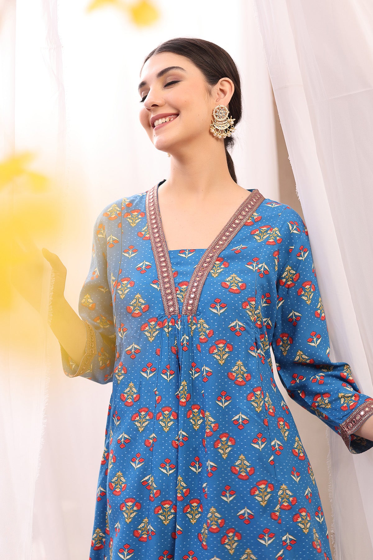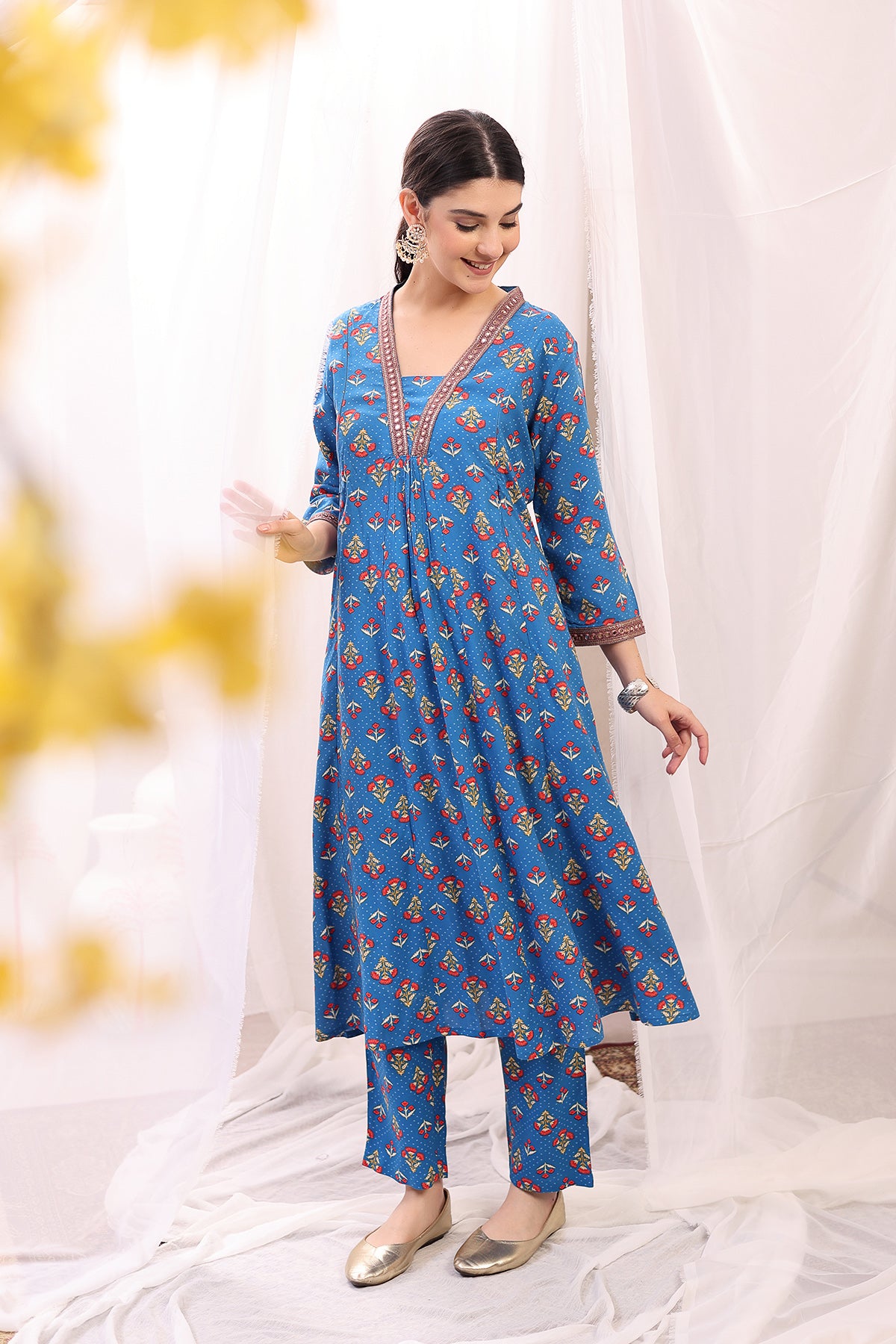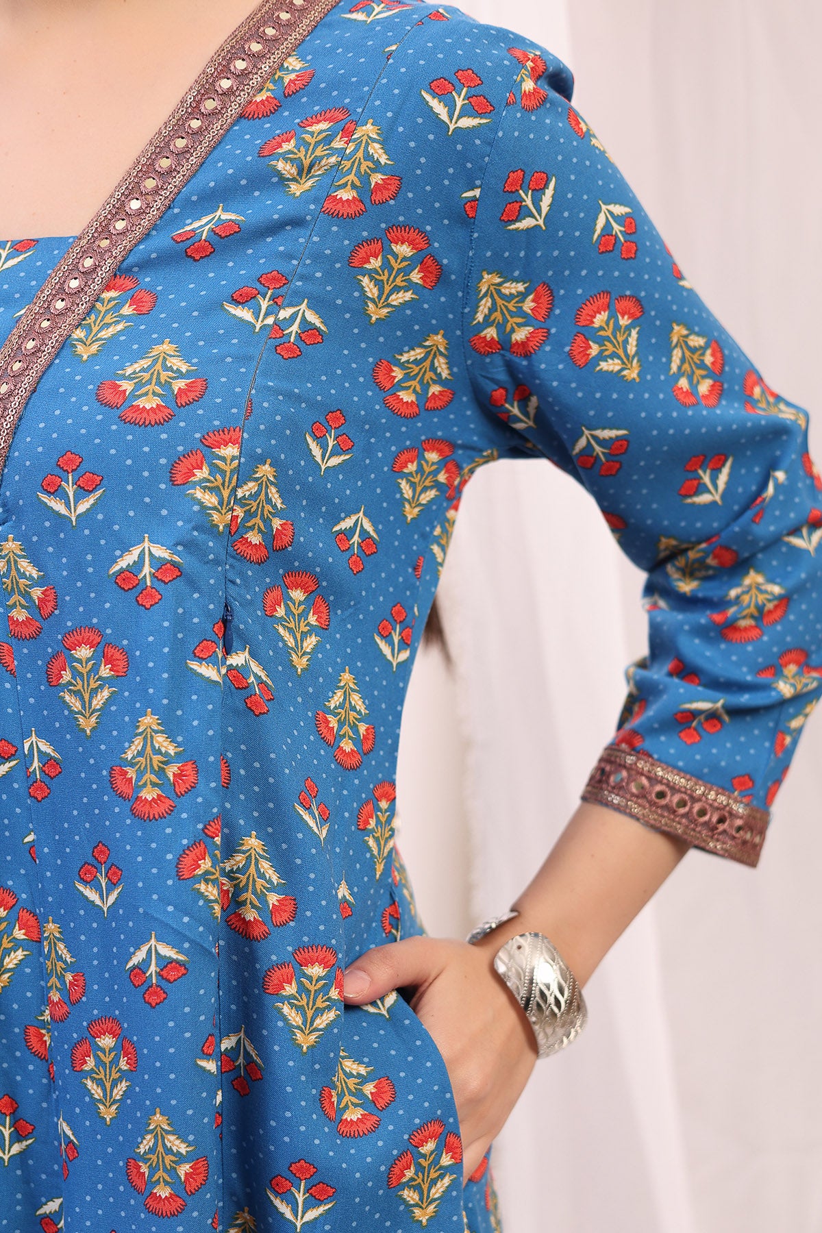Introducing our stylish kurta-pant set, crafted from 100% rayon for a soft and comfortable feel. This set features a beautifully designed kurta with a flattering neckline embellished with intricate embroidery, adding a touch of elegance. The zip feeding access ensures convenience for nursing, while the practical pockets provide added functionality. The vibrant blue fabric is adorned with colorful floral prints, making it an eye-catching choice for any occasion during your maternity journey.
