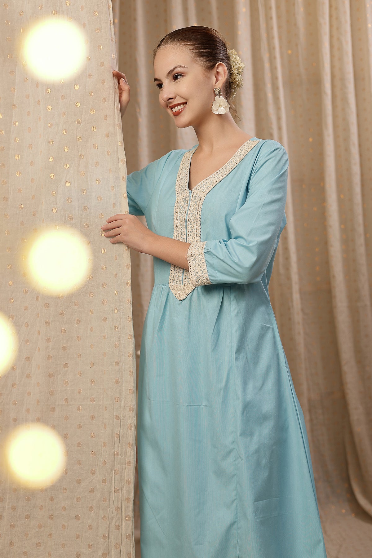 Effortless yet chic, this kurta pant set is a wardrobe essential for pregnancy, postpartum, and beyond. Pair it with statement earrings and sliders for a graceful festive look, or keep it minimal for daily wear. Its soft pastel tone and intricate lace accents make it versatile for both home gatherings and casual outings.