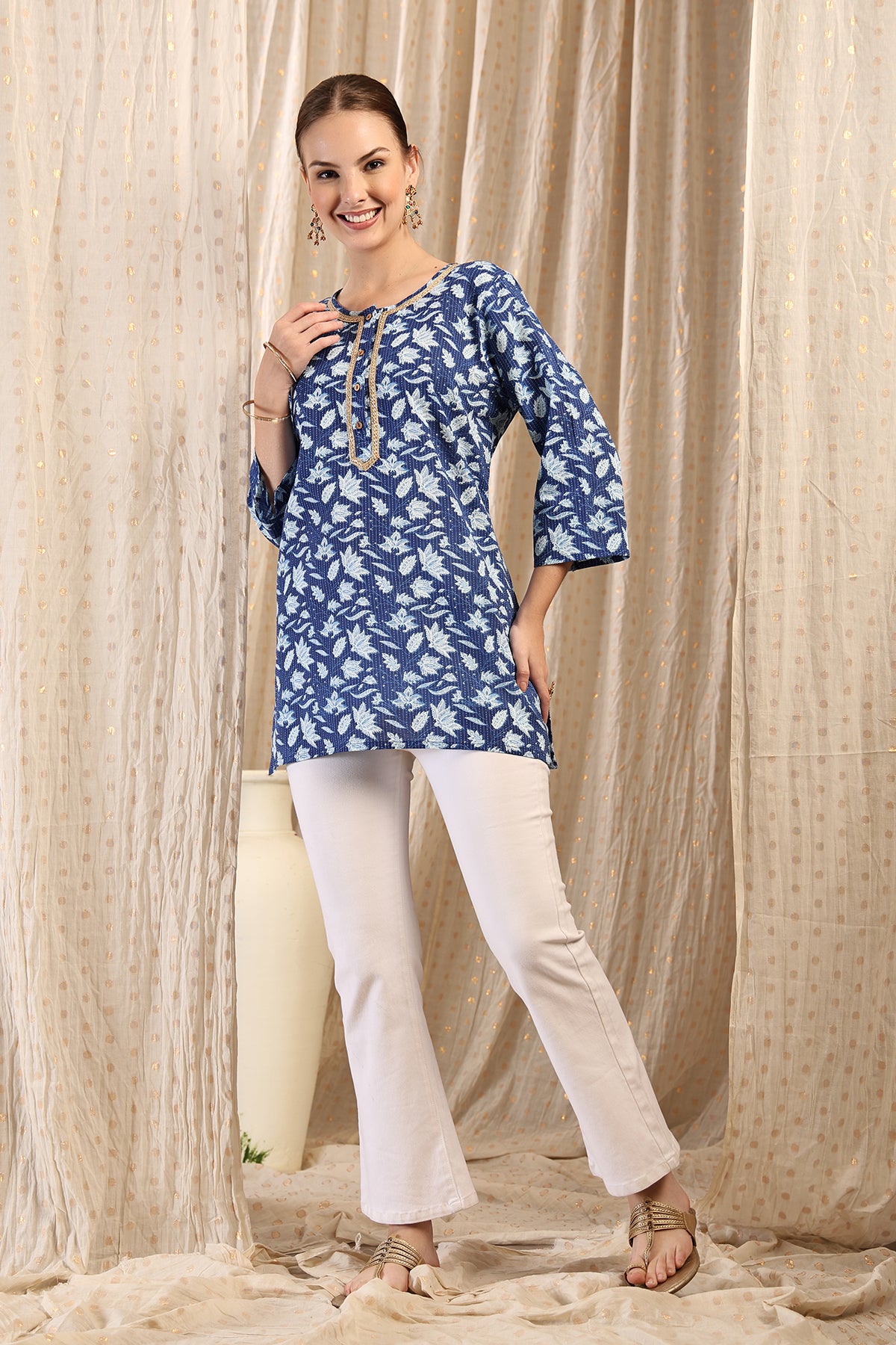 Zipless Feeding Cotton Top with Embroidered Neck - Indigo